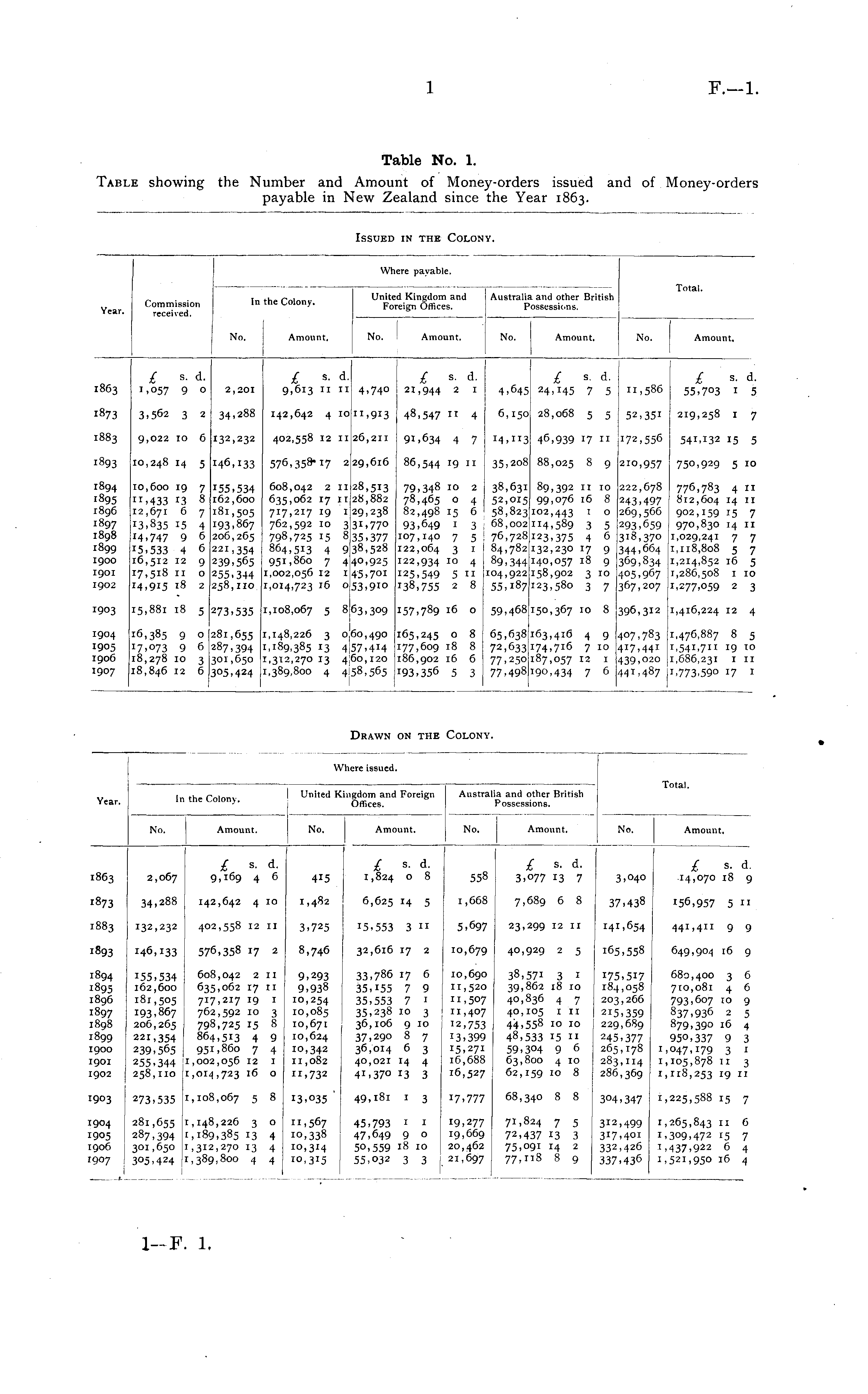 Table No. 1. Table showing the Number and Amount of Money-orders issued and of Money-orders payable in New Zealand since the Year 1863.