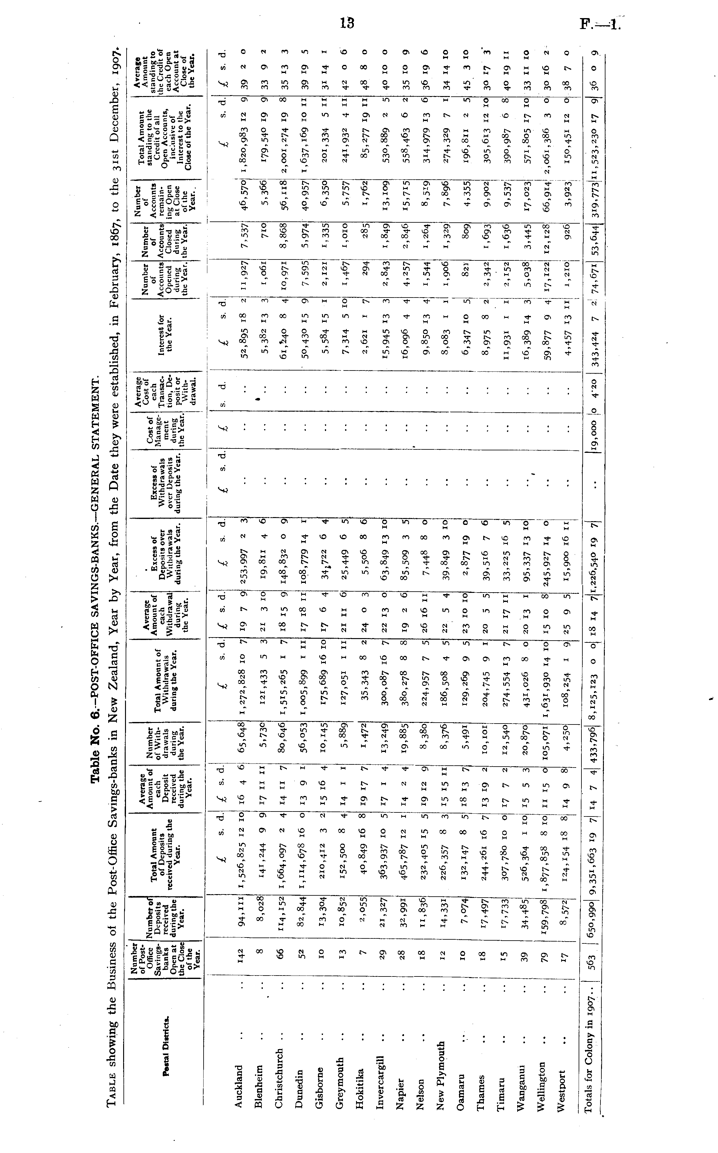 Postal Districts. Number of PostOffice Savingsbanks Open at the Close of the Year. Number of Deposits received duringthe Year. Total Amount of Deposits received during the Year. Average Amount of each Deposit received during the Year. Number of Withdrawals during the Year. Total Amount of Withdrawals during the Year. Average Amount of each Withdrawal during the Year. Excess of Deposits over Withdrawals during the Year. Excess of Withdrawals over Deposits during the Year. Cost of Management during the Year. Average Cost of each Transaction, Deposit or Withdrawal. Interest for the Year. Number of Accounts Opened during the Year. Number of Accounts Closed during the Year. Number of Accounts remaining Open at Close of the Year. Total Amount standing to the Credit of all Open Accounts, inclusive of Interest to the Close of the Year. Average Amount standing to the Credit of each Open Account at Close of the Year. £ S. d. £ s. d.l £ *■ d. £ »■ d. £ s. d. £ s. d. £ s. . d. £ S. d. £ s - d. £ *• d. Auckland 142 94,111 1,526,825 12 IOi 16 4 6] 65,648 1,272,828 10 7 19 7 9 253,997 2 3 52,895 18 2 11,927 7,537 46,570! 1,820,983 12 9 39 2 o Blenheim 8 8,028 141,244 9 9 17 11 11 5,730 121,433 5 3 21 3 IO 19,811 4 6 1 5,382 13 3 1,061 710 5,366 179,540 19 9 33 9 2 Christchurch .. 66 114,152 I , 664 , 097 2 4 14 n 7 80,646 1,515,265 1 7 18 15 9 148,832 o 9 8 4 io,97i 8,868 56,118! 2,001,274 19 8 35 13 3 Dunedin 52 82,844 1,114,678 16 O 13 9 1 56,053 1,005,899 1 11 17 18 n 108,779 14 1 50,430 15 9 7,595 5,974 40,957! 1,637, I0 9 10 11 39 19 5 Gisborne 10 13,304 2IO,4I2 3 2 15 16 4 10,145 175,689 16 10 17 6 4 34j722 6 4 5,584 15 1 2,121 i,335 6,350] 201,334 5 11 3i 14 1 Greymouth 13 10,852 152,500 8 4 14 1 I 5,889 127,051 1 11 21 11 6] 25,449 6 5 7,3H 5 10! 1,467] 1,010 5,757] 241,932 4 11 42 o 6 Hokitika 7 2,055 40,849 16 8 19 17 7 1,472 35,343 8 2 24 o 3 5,506 8 6 2,621 1 7 294 285 1,762 85,277 19 11 48 8 o Invercargill 29 21,327 363,937 10 5l 17 1 4 13,249 300,087 16 7 22 13 o 63,849 13 10 15,945 13 3 2,843 1,849 13,109 530,889 2 5 40 10 o Napier 28 32,991 465,787 12 1 14 2 4! 19,885 380,278 8 8 19 2 6 85,509 3 5 16,096 4 4 4,257! 2,846 15.715 558,463 6 2 35 10 9 Nelson 18 11,836 232,405 15 5 19 12 9 8,380 224,957 7 5 26 16 11! 7,448 8 oj 9,850 13 4 1.544 1,264 8,519 314,979 13 6 36 19 6 New Plymouth 12 14,331 226,357 8 3 15 15 11 8,376 186,508 4 5 22 5 4 39,849 3 10] 8,083 1 1! 1,906 1,329} 7,896 274,329 7 i| 34 14 10 Oamaru 10 7,074 132,147 8 5 18 13 7 5,491 129,269 9 5 23 IO IO I 2,877 19 o : 6,347 10 5 821 809 4,355] 196,811 2 5 45 3 10 Thames 18 17,497 244, 261 16 7! 13 19 2 10,101 204,745 9 1 20 5 5 39,516 7 6 8,975 8 2 2,342] ' 1,693 9,902 305,613 12 10 30 17 3 Timaru 15 J 7,733 307,780 10 o! 17 7 2 12,540 274,554 13 7 21 17 ill 33,225 16 5 11,931 1 1 2,152 1,636 9,537! 390,987 6 a 40 19 11 Wanganui 39 34,485j 526,364 1 10! 15 5 3 20,870 431,026 8 o 20 13 1 95,337 13 10 16,389 14 3: 5,038 3,445 17,023! 571,805 17 10 33 11 10 Wellington 79 159,798 1,877,858 8 10 1 59,877 9 4; 4,457 13 «| 11 15 o 105,071 1,631,930 14 10 15 10 8 245,927 14 oj 17,122 12,128 66,914] 2,061,386 3 o 30 16 2 Westport 17 8,572] 124,154 18 8] 14 9 8 4,250 108,254 1 9 25 9 5 15,900 16 it 1,210 926 3,923] I50.45 1 I 2 O 38 7 o 1 Totals for Colony in 1907.. I 563 650,990 9,351,663 19 7 14 7 4 433,796 8,125,123 o o iS 14 7I1,226,540 19 7 19,000 1 4-20 343,424 7 2 74,671 53,644 319,773 11,523. 230 x 7 9 36 o 9