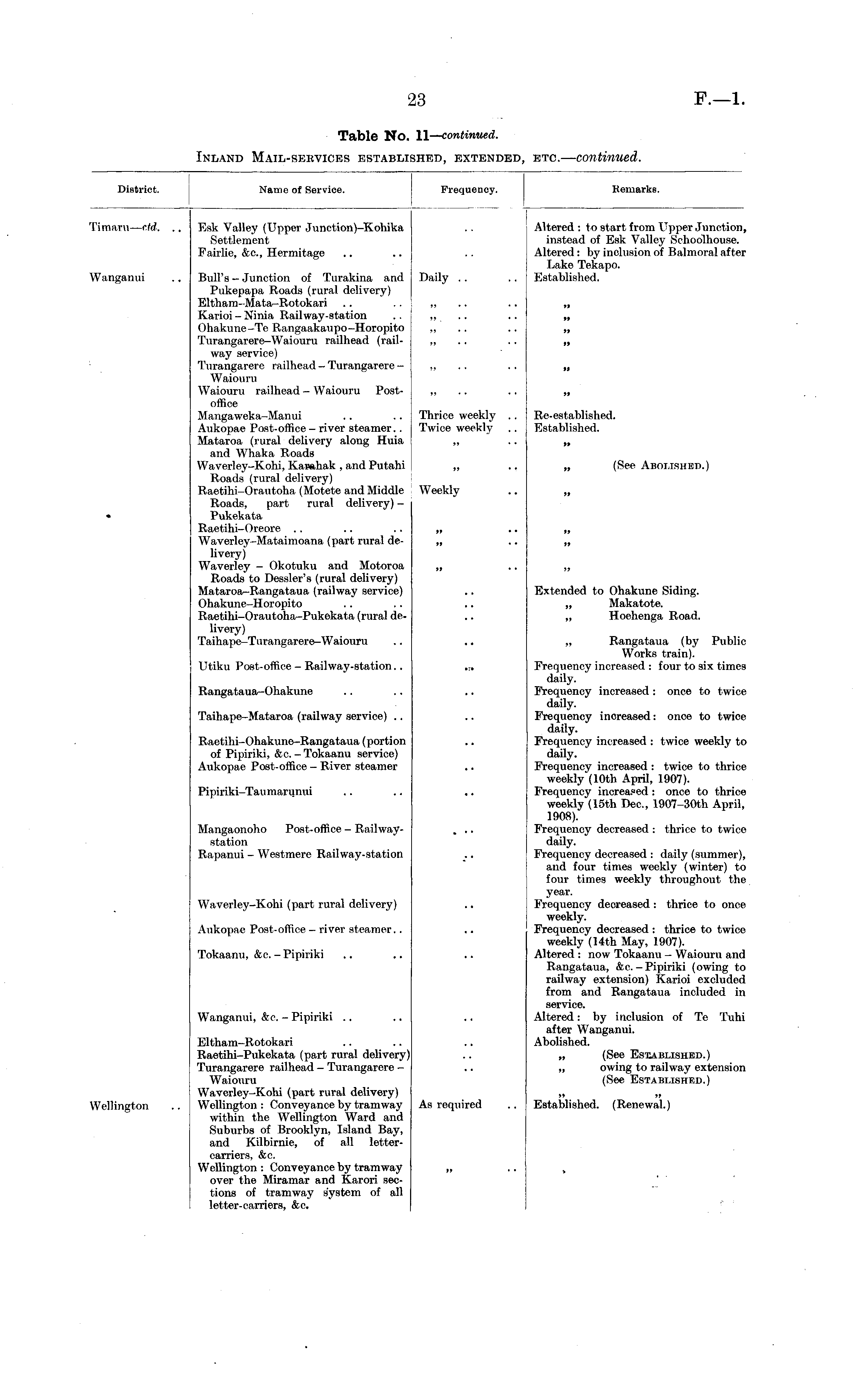 District. Name of Service. Frequency. Remarks. Timaru— rid. .. Wanganui Esk Valley (Upper Junction)-Kohika Settlement Fairlie, &c, Hermitage Altered : to start from Upper Junction, instead of Esk Valley Schoolhouse. Altered: by inclusion of Balmoral after Lake Tekapo. Established. Bull's - Junction of Turakina and Pukepapa Roads (rural delivery) Eltham-Mata-Rotokari .. Karioi - Ninia Railway-station Ohakune -Te Rangaakaupo-Horopito Turangarere-Waiouru railhead (railway service) Turangarere railhead - Turangarere - Waiouru Waiouru railhead - Waiouru Postoffice Manga weka-Manui Aukopae Post-office - river steamer.. Mataroa (rural delivery along Huia and Whaka Roads Waverley-Kohi, Kawthak , and Putahi Roads (rural delivery) Raetihi-Orautoha (Motete and Middle Roads, part rural delivery) - Pukekata Raetihi-Oreore Waverley-Mataimoana (part rural delivery) Waverley - Okotuku and Motoroa Roads to Dessler's (rural delivery) Matarosi—Rangataua (railway service) Ohakune-Horopito Raetihi-Orautoha-Pukekata (rural delivery) Taihape-Turangarere-Waiouru Daily Thrice weekly .. Twice weekly ,» »» ,, ,. ,» Re-established. Established. „ (See Abolished.) Weekly „ ,, * • ,, ,, ,, • • Extended to Ohakune Siding. „ Makatote. „ Hoehenga Road. Utiku Post-office- Railway-station.. Rangataua-Ohakune Taihape-Mataroa (railway service) .. Raetihi-Ohakune—Rangataua (portion of Pipiriki, &c. - Tokaanu service) Aukopae Post-office - River steamer „ Rangataua (by Public Works train). Frequency increased : four to six times daily. Frequency increased : once to twice daily. Frequency increased: once to twice daily. Frequency increased : twice weekly to daily. Frequency increased : twice to thrice weekly (10th April, 1907). Frequency increased : once to thrice weekly (15th Dec, 1907-30th April, 1908). Frequency decreased : thrice to twice daily. Frequency decreased : daily (summer), and four times weekly (winter) to four times weekly throughout the Pipiriki-Tau marunui Mangaonoho Post-office - Railwaystation Rapanui - Westmere Railway-station Waverley-Kohi (part rural delivery) year. Frequency decreased : thrice to once weekly. Frequency decreased : thrice to twice weekly (14th May, 1907). Altered : now Tokaanu - Waiouru and Rangataua, &c.-Pipiriki (owing to railway extension) Karioi excluded from and Rangataua included in service. Altered: by inclusion of Te Tuhi after Wanganui. Abolished. Aukopae Post-office - river steamer.. Tokaanu, &e. - Pipiriki Wanganui, &c. - Pipiriki Wellington Eltham-Rotokari Raetihi-Pukekata (part rural delivery) Turangarere railhead - Turangarere - Waiouru Waverley-Kohi (part rural delivery) Wellington : Conveyance by tramway within the Wellington Ward and Suburbs of Brooklyn, Island Bay, and Kilbirnie, of all lettercarriers, &c. Wellington : Conveyance by tramway over the Miramar and Karori sections of tramway system of all letter-carriers, &c. As required „ (See Established.) „ owing to railway extension (See Established.) Established. (Renewal.)