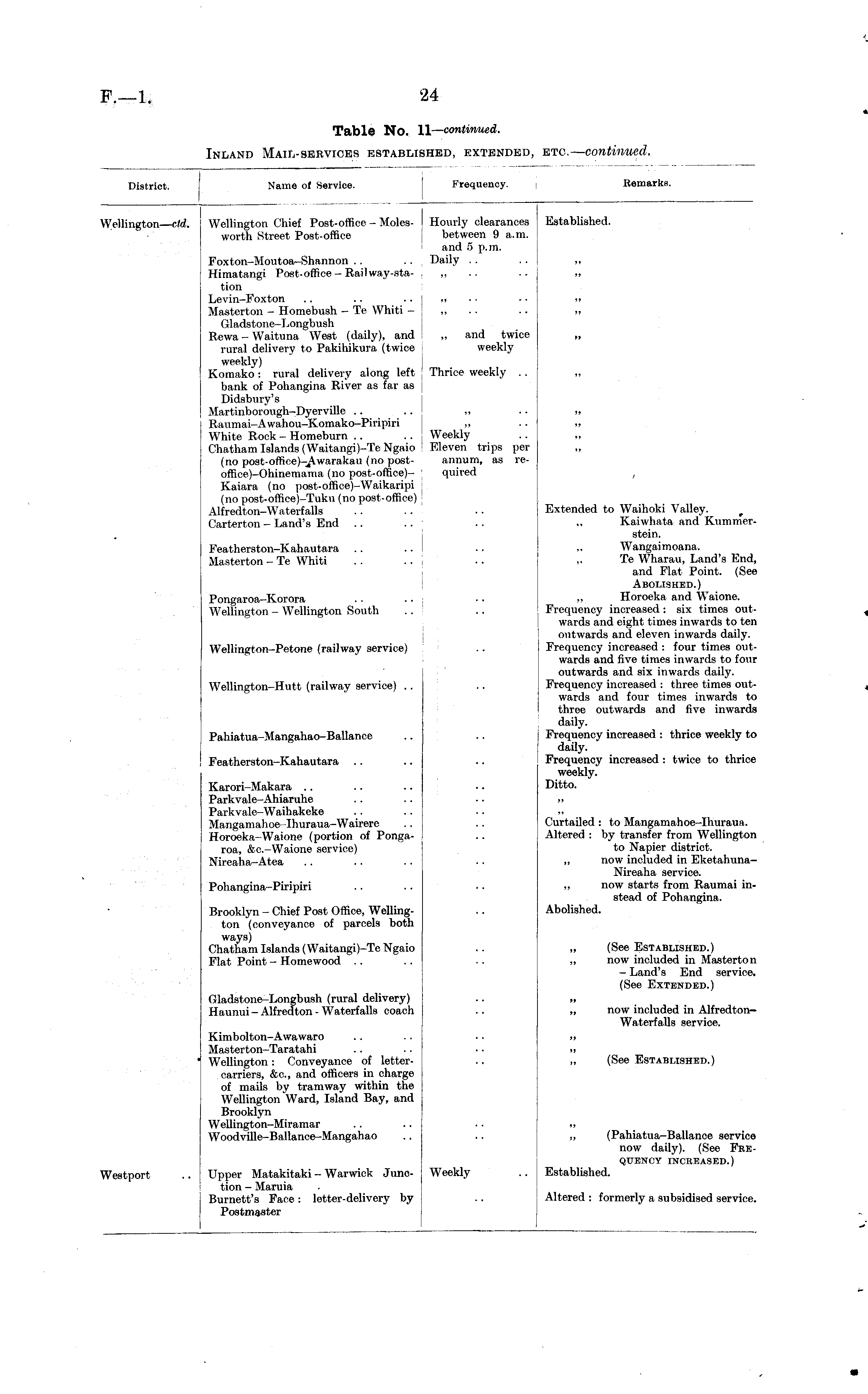 District. Name of Service. Frequency. Remarks. 'ellington— eld. Wellington Chief Post-office - Molesworth Street Post-office Hourly clearances between 9 a.m. and 5 p.m. Daily . . Established. Foxton-Moutoa-Shannon Himatangi Post-office-Railway-sta-tion Levin-Foxton Masterton - Homebush - Te Whiti - Gladstone-Longbush Rewa - Waituna West (daily), and rural delivery to Pakihikura (twice weekly) Komako: rural delivery along left bank of Pohangina River as far as Didsbury's Martinborough-Dyerville Raumai-Awahou-Komako-Piripiri White Rock - Homeburn Chatham Islands (Waitangi)-Te Ngaio (no post-office)-.Awarakau (no post-office)-Ohinemama (no post-office)-Kaiara (no post-office)-Waikaripi (no post-office)-Tuku (no post-office) Alfredton-Waterfalls Carterton - Land's End ,, and twice weekly Thrice weekly .. Weekly Eleven trips per annum, as required Featherston-Kahautara Masterton - Te Whiti Pongaroa-Korora Wellington - Wellington South Wellington-Petone (railway service) Extended to Waihoki Valley. Kaiwhata and Kummerstein. Wangaimoana. ,. Te Wharau, Land's End, and Flat Point. (See Abolished.) ,, Horoeka and W T aione. Frequency increased : six times outwards and eight times inwards to ten outwards and eleven inwards daily. Frequency increased : four times outwards and five times inwards to four outwards and six inwards daily. Frequency increased : three times outwards and four times inwards to three outwards and five inwards daily. Frequency increased : thrice weekly to daily. Frequency increased : twice to thrice weekly. Ditto. Wellington-Hutt (railway service) .. Pahiatua-Mangahao-Ballance Featherston-Kahautara Karori-Makara Parkvale-Ahiaruhe Parkvale-Waihakeke Mangamahoe-Ihuraua-Wairere Horoeka-Waione (portion of Pongaroa, &c.-Waione service) Nireaha-Atea Curtailed : to Mangamahoe-Ihurauu. Altered : by transfer from Wellington to Napier district. ,, now included in Eketahuna— Nireaha service. ,, now starts from Raumai instead of Pohangina. Pohangina-Piripiri Brooklyn - Chief Post Office, Wellington (conveyance of parcels both ways) Chatham Islands (Waitangi)-Te Ngaio Flat Point - Homewood Abolished. „ (See Established.) ,, now included in Masterton - Land's End service. (See Extended.) Gladstone-Longbush (rural delivery) Haunui - Alfredton - Waterfalls coach „ now included in AlfredtonWaterfalls service. Kim bolton-Awawaro Masterton-Taratahi Wellington: Conveyance of lettercarriers, &c, and officers in charge of mails by tramway within the Wellington Ward, Island Bay, and Brooklyn Wellington-Miramar Woodville-Ballance-Mangahao „ (See Established.) ,, (Pahiatua-Ballance service now daily). (See Frequency INCREASED.) Upper Matakitaki - Warwick Junction - Maruia Burnett's Face: letter-delivery by Postmaster Weekly Established. 'estport Altered : formerly a subsidised service.