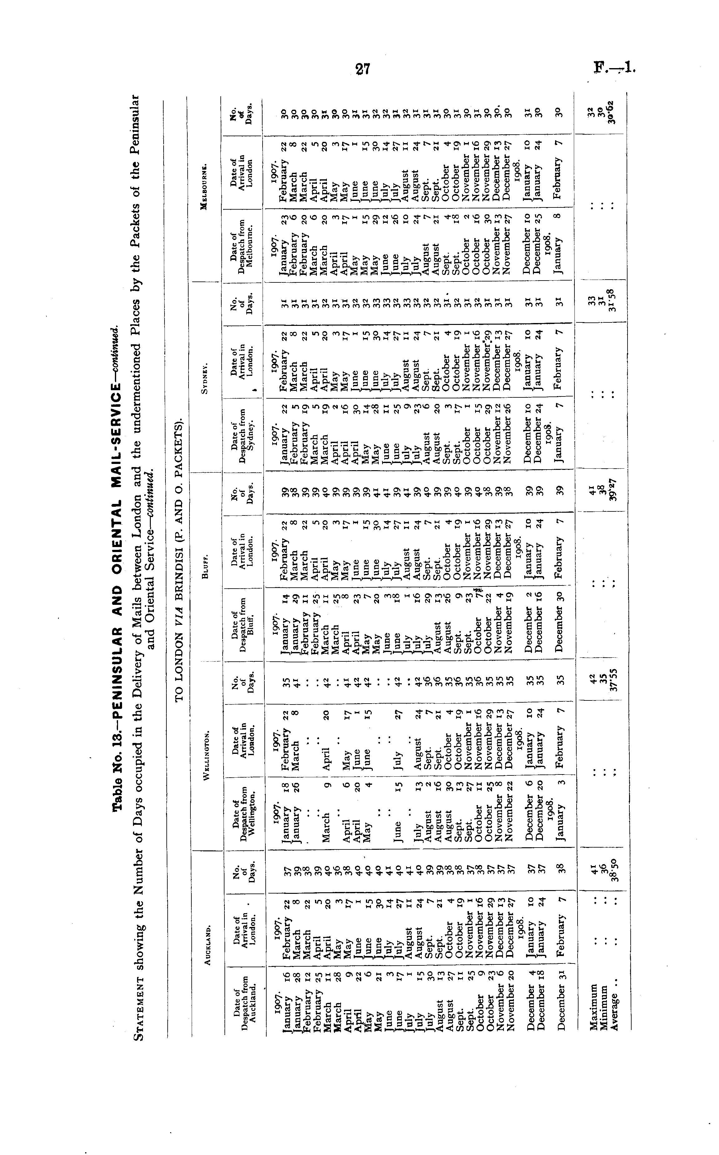 TO LONDON VIA BRINDISI (P. AND O. PACKETS). Auckland. Wellington. Bluff. Sydney. Melbourne. Date of Despatch from Auckland. Date of No. Arrival in t of London. Days. Date of Despatch from Wellington. Date of Arrival in London. No. of Days. Date of Despatch from Blutf. Date of Arrival in London. No. Date of of Despatch from Days. Sydney. t Date of Arrival in London. No. of Days. Date of Despatch from Melbourne. Date of Arrival in London No. of Days. 1907. January 16 January 28 February 12 February 25 March 11 March 28 April 9 April 22 May 6 May 21 June 3 June 17 July 1 July 15 July 30 August 13 August 27 Sept. 11 Sept. 25 October 9 October 23 November 6 November 20 1907. February 22 March 8 March 22 April 5 April 20 May 3 May 17 June 1 June 15 June 30 July 14 July 27 August 1 1 August 24 Sept. 7 Sept. 21 October 4 October 19 November 1 November 16 November 29 December 13 December 27 1908. January 10 January 24 37 39 38 39 40 36 38 40 40 40 41 40 4 1 40 39 39 38 38 37 38 37 37 37 1907. January 18 January 26 March 9 April 6 April 20 May 4 June 15 1907. February 22 March 8 April 20 May 17 June 1 June 15 July 27 35 41 4^ 4 1 42 42 42 1907. January 14 January 29 February 11 February 25 March 11 March 25 April 8 April 23 May 7 May 20 June 3 June 18 July 1 July 16 July 29 August 13 August 26 Sept. 9 Sept. 23 October 7I October 22 November 4 November 19 1907. February 22 March 8 March 22 April 5 April 20 May 3 May 17 June 1 June 15 June 30 July 14 July 27 August 11 August 24 Sept. 7 Sept. 21 October 4 October 19 November 1 November 16 November 29 December 13 December 27 1908. January 10 January 24 39 38 39 39 40 39 39 39 39 4' 41 39 41 39 40 39 39 40 39 40 3S 39 3« 1907. January 22 February 5 February 19 March 5 March 19 April 2 April 16 April 30 May 14 May 28 June 11 June 25 July 9 July 23 August 6 August 20 Sept. 3 Sept. 17 October 1 October 15 October 29 November 12 November 26 1907. February 22 March 8 March 22 April 5 April 20 May 3 May 17 June 1 June 15 June 30 July 14 July 27 August 11 August 24 Sept. 7 Sept. 21 October 4 October 19 November 1 November 16 November)2g December 13 December 27 1908. January 10 January 24 31 3 1 31 31 31 3i 32 32 33 33 32 33 32 32 32 32 31 32 31 3 1 3i 1907. January 23 February 6 February 20 March 6 March 20 April 3 April 17 May 1 May 15 May 29 June 12 June 26 July 10 July 24 August 7 August 21 Sept. 4 Sept. 18 October 2 October 16 October 30 November 13 November 27 1907. February 22 March 8 March 22 April 5 April 20 May 3 May 17 June 1 June 15 June 30 July 14 July 27 August 11 August 24 Sept. 7 Sept. 21 October 4 October 19 November 1 November 16 November 29 December 13 December 27 1908. January 10 January 24 3° 3° 3° 3° 31 30 3° 31 3 1 32 32 3i 32 3i 3 1 31 3° 3i 30 3 1 3° 30. 3° July 13 August 2 August 16 August 30 Sept. 13 Sept. 27 October 11 October 25 November 8 November 22 August 24 Sept. 7 Sept. 21 October 4 October 19 November 1 November 16 November 29 December 13 December 27 1908. January 10 January 24 42 36 36 35 36 35 36 35 35 35 December 4 December 18 37 37 December 6 December 20 1908. January 3 35 35 December 2 December 16 39 39 December 10 December 24 1908. January 7 3i 3i December 10 December 25 1908. January 8 3i 3° December 31 February 7 38 February 7 35 December 30 February 7 39 February 7 31 February 7 3° Maximum Minimum Average .. 41 36 3850 42 35 37-55 4i 38 39 - 27 33 3I-58 32 3° 30-62