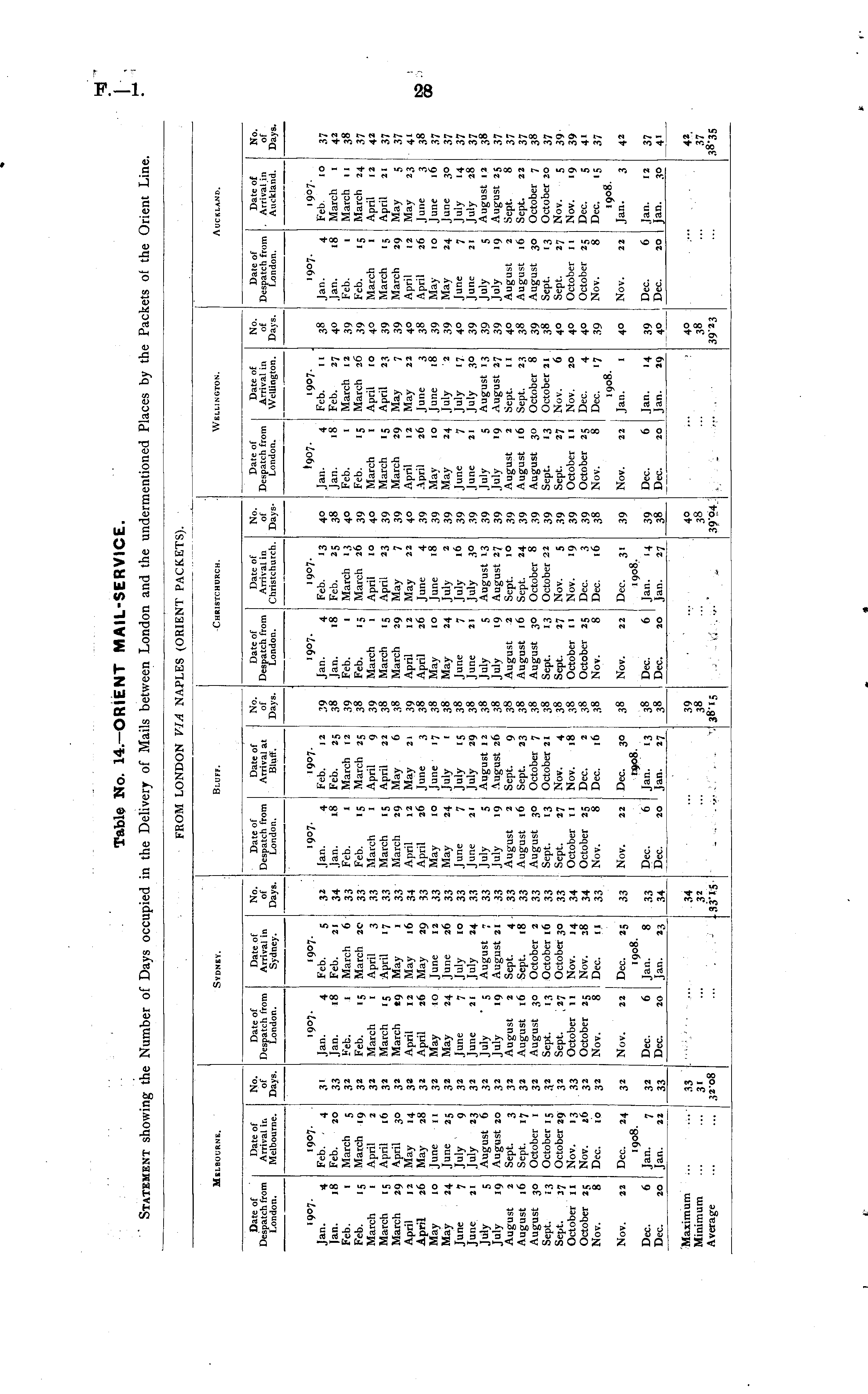 FROM LONDON VIA NA: LES (ORIENT PACKETS). Melbourne. Sydney. Bluff. Christchurch. Wellington. Auckland. Date of Despatch from London. Date of Arrival in Melbourne. No. of Days. Date of Despatch from London. Date of Arrival in Sydney. No. of Days. Date of Despatch from London. Date of Arrival at Bluff. No. of Days. Date of Despatch from London. Date of Arrival in Christchurch. No. of BaysDare of Despatch from London. Date of Arrival in Wellington. No. of Days. Date of Despatch from London. Date of . Arrival in Auckland. No. of Days. 1907. 1907. Feb. . 4 Feb. 20 March 5 March 19 April 2 April 16 April 30 May 14 May 28 June 11 June 25 July 9 July 23 August 6 August 20 Sept. 3 Sept. 17 October 1 October 15 October 29 Nov. 13 Nov. 26 Dec. 10 it' 32 32 32 32 32 32 32 32 32 32 32 32 32 32 32 32 32 32 33 32 32 1907. 1907. Feb. s Feb. 21 March 6 March 2C April 3 April 17 May 1 May 16 May 29 June 12 June 26 July 10 July 24 August ; August 21 Sept. 4 , Sept. 18 October 2 October 16 October 30 Nov. 14 Nov. 28 Dec. 11 1907. 1907. Feb. 12 Feb. 25 March 12 March 25 April 9 April 2 2 May 6 May 21 June 3 June 17 July 1 July 15 July 29 August 1 2 August 26 Sept. 9 Sept. 23 October 7 October 2 1 Nov. 4 Nov. 18 Dec. 2 Dec. 16 39 38 39 38 39 38 38 39 38 38 38 38 38 38 38 38 38 38 38 38 38 38 38 1907. 1907. Feb. 13 Feb. 25 March 13 March 26 April 1 o April 23 May 7 May 22 June 4 June 18 July 2 July 16 July 3° August 13 August 27 Sept. 10 Sept. 24 October 8 October 22 Nov. S Nov. 19 Dec. 3 Dec. 16 40 38 40 39 40 39 39 40 39 39 39 39 39 39 39 39 39 39 39 39 39 39 38 (907. <9°7Feb. 1 1 Feb. 27 March 12 March 26 April 10 April 23 May 7 May 22 June 3 June 18 July 2 July 17 July 30 August 13 August 27 Sept. 11 Sept. 23 October 8 October 2 1 Nov. 6 Nov. 20 Dec. 4 Dec. 17 38 40 39 39 40 39 39 40 38 39 39 40 39 39 39 40 38 39 38 40 40 40 39 1907. 1907. Feb. 10 March 1 March 11 March 24 April 12 April 2 1 May 5 May 23 J une 3 June 16 June 30 July 14 July 28 August 12 August 25 Sept. 8 Sept. 22 October 7 October 20 Nov. 5 Nov. 19 Dec. 5 Dec. 15 1908. Jan. 4 (an. 18 Feb. 1 Feb. 15 March 1 March 15 March 29 April 12 April 26 May 10 May 24 June 7 June 21 July 5 July 19 August 2 August 16 August 30 Sept. 13 Sept. 27 October 11 October 2 c, Nov. 8 Jan. 4 Jan. 18 Feb. 1 Feb. ij March 1 March 15 March eg April 12 April 26 May 10 May 24 June 7 June 21 July ' 5 July 19 August 2 August 16 August 30 Sept. 13 Sept. ,27 October 1 1 October 25 Nov. 8 1 32 34 33 33 33 33 33 34 33 33 33 33 33 33 33 33 33 33 33 33 34 34 33 Jan. 4 |an. 18 Feb. 1 Feb. 15 March 1 March 15 March 29 April 12 April 26 May 10 May 24 June 7 June 21 July S July 19 August 2 August 16 August 30 Sept. 13 Sept. 27 October 11 October 25 Nov. 8 Jan. 4 |an. 18 Feb. 1 Feb. .5 March 1 March 15 March 29 April 12 April 26 May 10 May 24 June 7 J une 21 July 5 July 19 August 2 August 16 August 30 Sept. 13 Sept. 27 October 1 1 October 25 Nov. 8 Jan. 4 |an. 18 Feb. 1 Feb. 15 March i March 15 March 29 April 12 April 26 May 10 May 24 June 7 June 21 July 5 July 19 August 2 August 16 August 30 Sept. 13 Sept. 27 October 1 1 October 25 Nov. 8 Jan. 4 ]an. 18 Feb. 1 Feb. .5 March 1 March 15 March 29 April 12 April 26 May 1 o May 24 .1 une 7 June 21 I .My 5 1 July 19 ; August 2 August 16 August 30 Sept. 13 Sept. 27 ! October 11 October 25 Nov. 8 37 42 38 37 42 37 37 41 38 37 37 37 37 38 37 37 37 38 37 39 39 41 37 Nov. 22 Nov. 22 Dec. 30 1908. Jan. 13 Jan. 27 38 Nov. 2 2 Dec. 3 1 1908. Nov. 22 1908. Nov. 22 Nov. 22 j Dec. 24 32 Dec. 25 33 39 Jan. 1 40 Jan. 3 42 Dec. 6 Dec. 20 1908. Dec. 6 Dec. 20 1908. Dec. 6 Dec. 20 38 38 Dec. 6 j Dec. 20 Dec. 6 Dec. 20 Jan. 14 Jan. 29 39 40 Dec. 6 Dec. 20 j Jan. 12 Jan. 30 37 41 Jan. 7 Jan. 22 32 33 Jan. 8 Jan. 23 33 34 Jan. 14 Jan. 27 39 38 Maximum Minimum Average S3 3' 3208 34 I 32 I 33-15 39 38 38-I5 40 38 39'°4 40 38 3923 42. 37 38-35 ... ...
