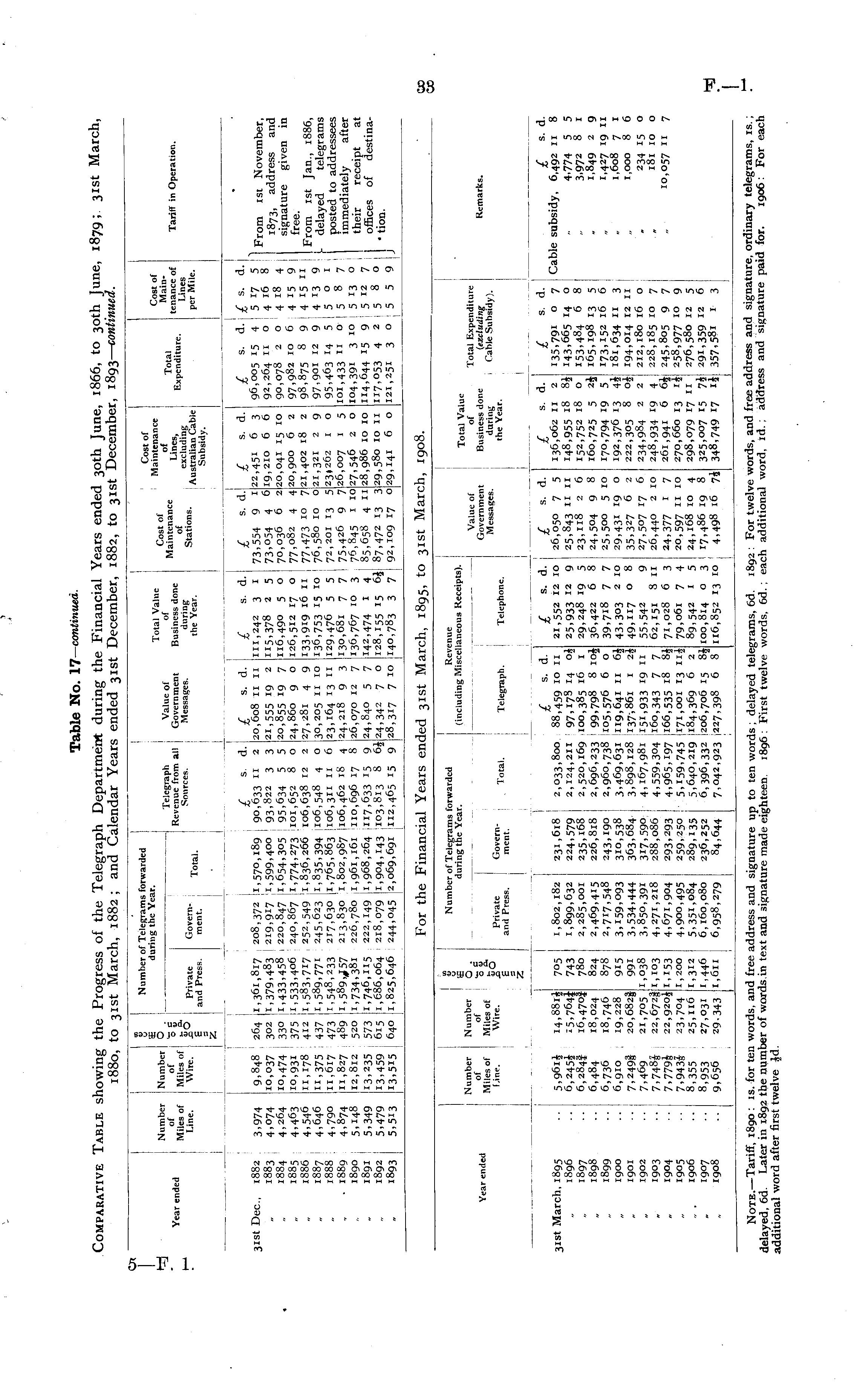 Table No. 17— continued. Comparative Table showing the Progress of the Telegraph Department during the Financial Years ended 30th June, 1866, to 30th June, 1879; 31st March, 1880, to 31st March, 1882; and Calendar Years ended 31st December, 1882, to 31st December, 1893— continued.