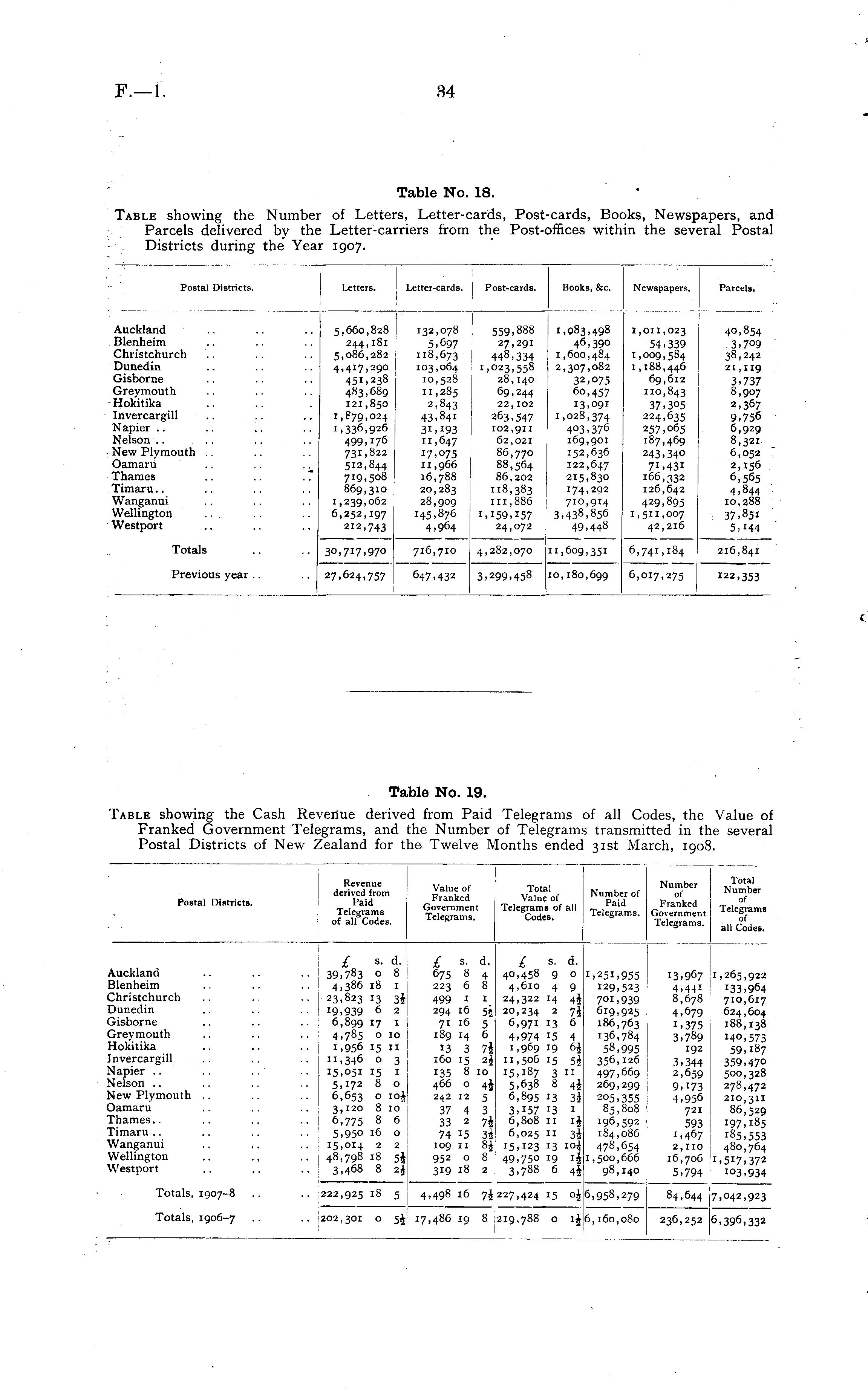 Table No. 18. Table showing the Number of Letters, Letter-cards, Post-cards, Books, Newspapers, and Parcels delivered by the Letter-carriers from the Post-offices within the several Postal Districts during the Year 1907.