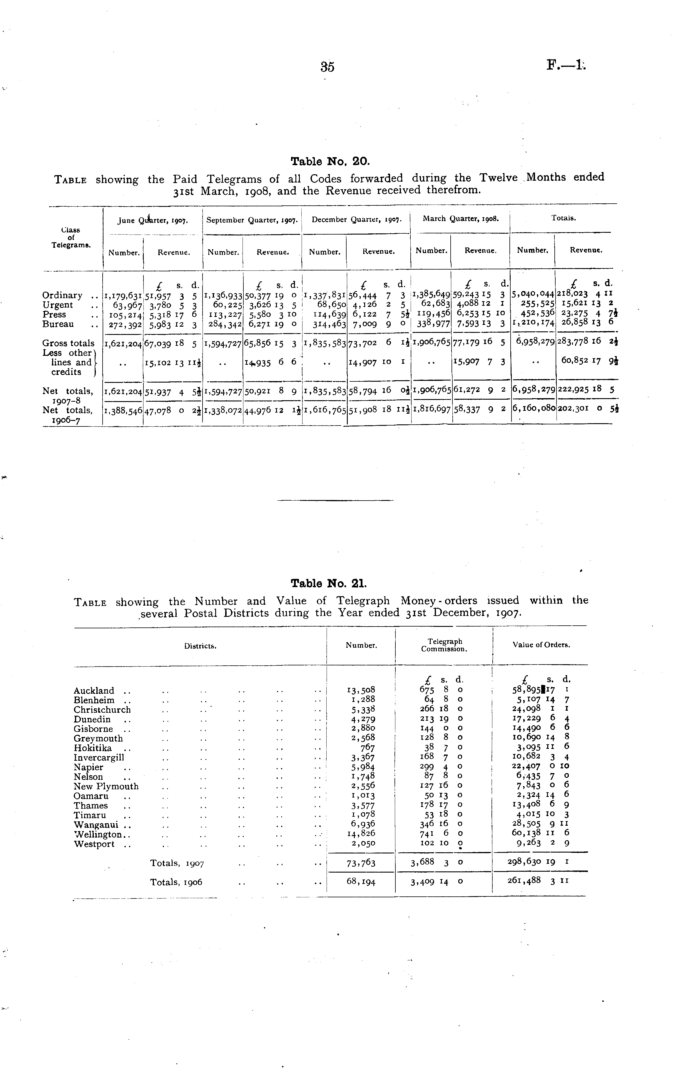 Table No. 20. Table showing the Paid Telegrams of all Codes forwarded during the Twelve Months ended 31st March, 1908, and the Revenue received therefrom.