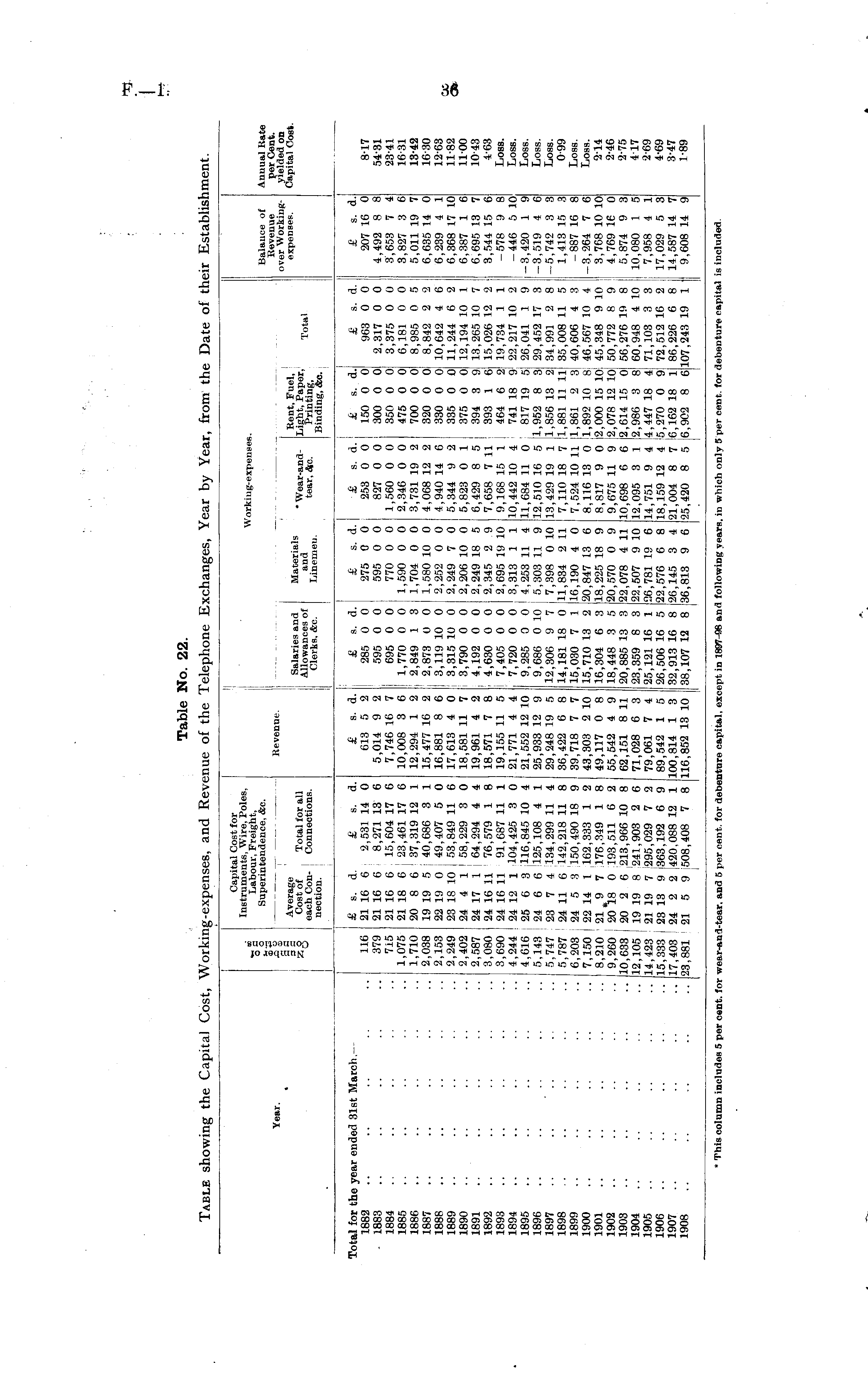 Table No. 22. Table showing the Capital Cost, Working-expenses, and Revenue of the Telephone Exchanges, Year by Year, from the Date of their Establishment.