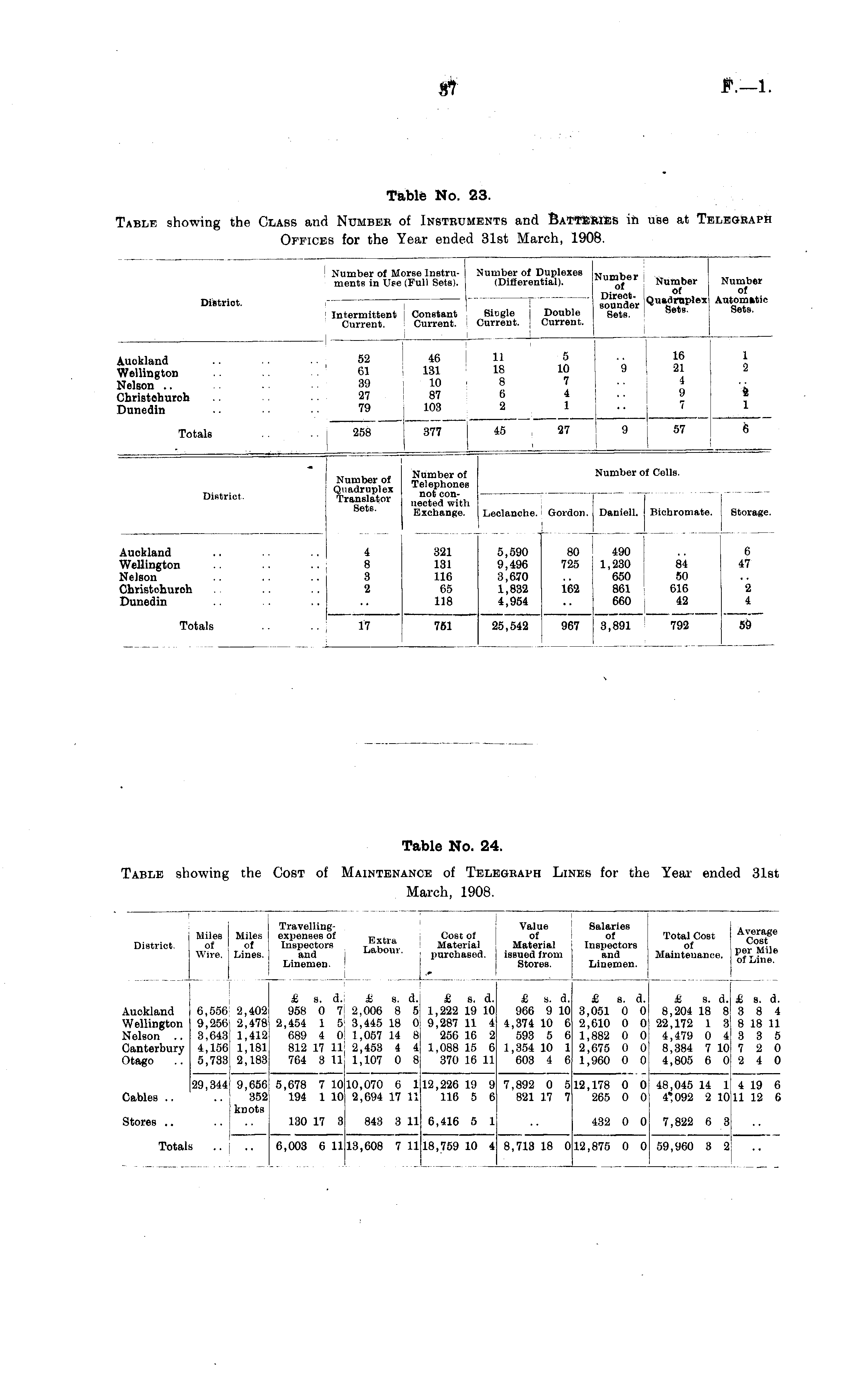 Table No. 23. Table showing the Class and Number of Instruments and Batteries in use at Telegraph Offices for the Year ended 31st March, 1908.