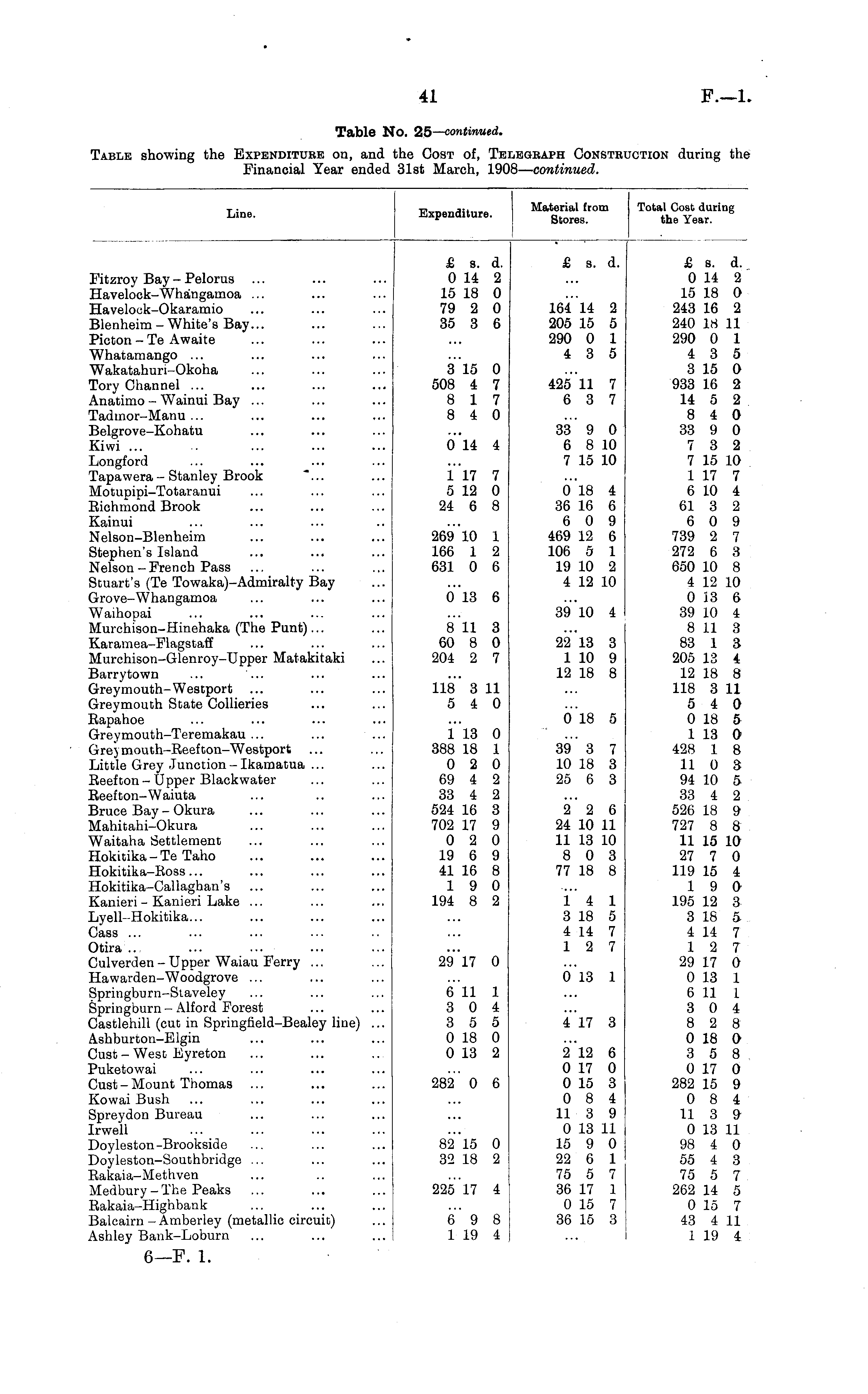 Line. Expenditure. Material from Stores. Total Cost during the Year. £ s. d. 0 14 2 15 18 0 79 2 0 35 3 6 £ s. d. £ S. d. 0 14 2 15 18 0 243 16 2 240 18 11 290 0 1 4 3 5 3 15 0 933 16 2 14 5 2 8 4 0 33 9 0 7 3 2 7 15 10 1 17 7 6 10 4 61 3 2 6 0 9 739 2 7 272 6 3 650 10 8 4 12 10 0 13 6 39 10 4 8 11 3 83 1 3 205 13 4 12 18 8 118 3 11 5 4 0 0 18 5 1 13 0 428 1 8 11 0 3 94 10 5 33 4 2 526 18 9 727 8 8 11 15 10 27 7 0 119 15 4 19 0 195 12 3 3 18 5 4 14 7 12 7 29 17 0 0 13 1 6 11 1 3 0 4 8 2 8 0 18 0 3 5 8 0 17 0 282 15 9 0 8 4 11 3 9 0 13 11 98 4 0 55 4 3 75 5 7 262 14 5 0 15 7 43 4 11 1 19 4 Fitzroy Bay - Pelorus Havelock-Whangamoa ... Havelock-Okaramio Blenheim - White's Bay... Picton - Te Awaite Whatamango ... Wakatahuri-Okoha Tory Channel ... Anatimo - Wainui Bay ... Tadmor-Manu ... Belgrove-Kohatu Kiwi ... Longford Tapawera- Stanley Brook "... Motupipi-Totaranui Richmond Brook Kainui Nelson-Blenheim Stephen's Island Nelson - French Pass Stuart's (Te Towaka)-Admiralty Bay Grove-Whangamoa Waihopai Murchison-Hinehaka (The Punt)... Karamea-Flagstaff Murchison-Glenroy-Upper Matakitaki Barrytown Greymouth-Westport ... Greymouth State Collieries Rapahoe Greymouth-Teremakau ... Greymouth-Reefton-Westport Little Grey Junction-Ikamatua ... Reefton - Upper Blackwater Reef ton-Waiuta Bruce Bay - Okura Mahitahi-Okura Waitaha Settlement Hokitika - Te Taho Hokitika-Ross ... Hokitika-Cal laghan' s Kanieri - Kanieri Lake ... Lyell-Hokitika... Cass ... Otira .. Culverden - Upper Waiau Ferry ... Hawarden-Woodgrove ... Springburn-Siaveley Springburn-Alford Forest Castlehill (cut in Springfield-Bealey line) ... Ashburton-Elgin Cust - West Eyreton Puketowai Cust - Mount Thomas ... Kowai Bush Spreydon Bureau Irwell Doyleston-Brookside Doyleston-Southbridge ... Rakaia-Methven Medbury - The Peaks Rakaia-Highbank Balcairn - Amberley (metallic circuit) Ashley Bank-Loburn 3 15 0 508 4 7 8 17 8 4 0 014 4 1 17 7 5 12 0 24 6 8 269 10 1 166 1 2 631 0 6 0 13 6 8 11 3 60 8 0 204 2 7 118* 3 11 5 4 0 1 13 0 388 18 1 0 2 0 69 4 2 33 4 2 524 16 3 702 17 9 0 2 0 19 6 9 41 16 8 19 0 194 8 2 164 14 2 205 15 5 290 0 1 4 3 5 42511 7 6 3 7 33 9 0 6 8 10 7 15 10 0 18 4 36 16 6 6 0 9 469 12 6 106 5 1 19 10 2 4 12 10 39 10 4 22 13 3 1 10 9 12 18 8 0 18 5 39 3 7 10 18 3 25 6 3 2 2 6 24 10 11 11 13 10 8 0 3 77 18 8 14 1 3 18 5 4 14 7 12 7 29" 17 0 013 1 6 11 1 3 0 4 3 5 5 0 18 0 0 13 2 417 3 282" 0 6 82*15 0 32 18 2 2 12 6 0 17 0 0 15 3 0 8 4 11 3 9 0 13 11 15 9 0 22 6 1 75 5 7 36 17 1 0 15 7 36 15 3 225"l7 4 6*' 9 8 1 19 4