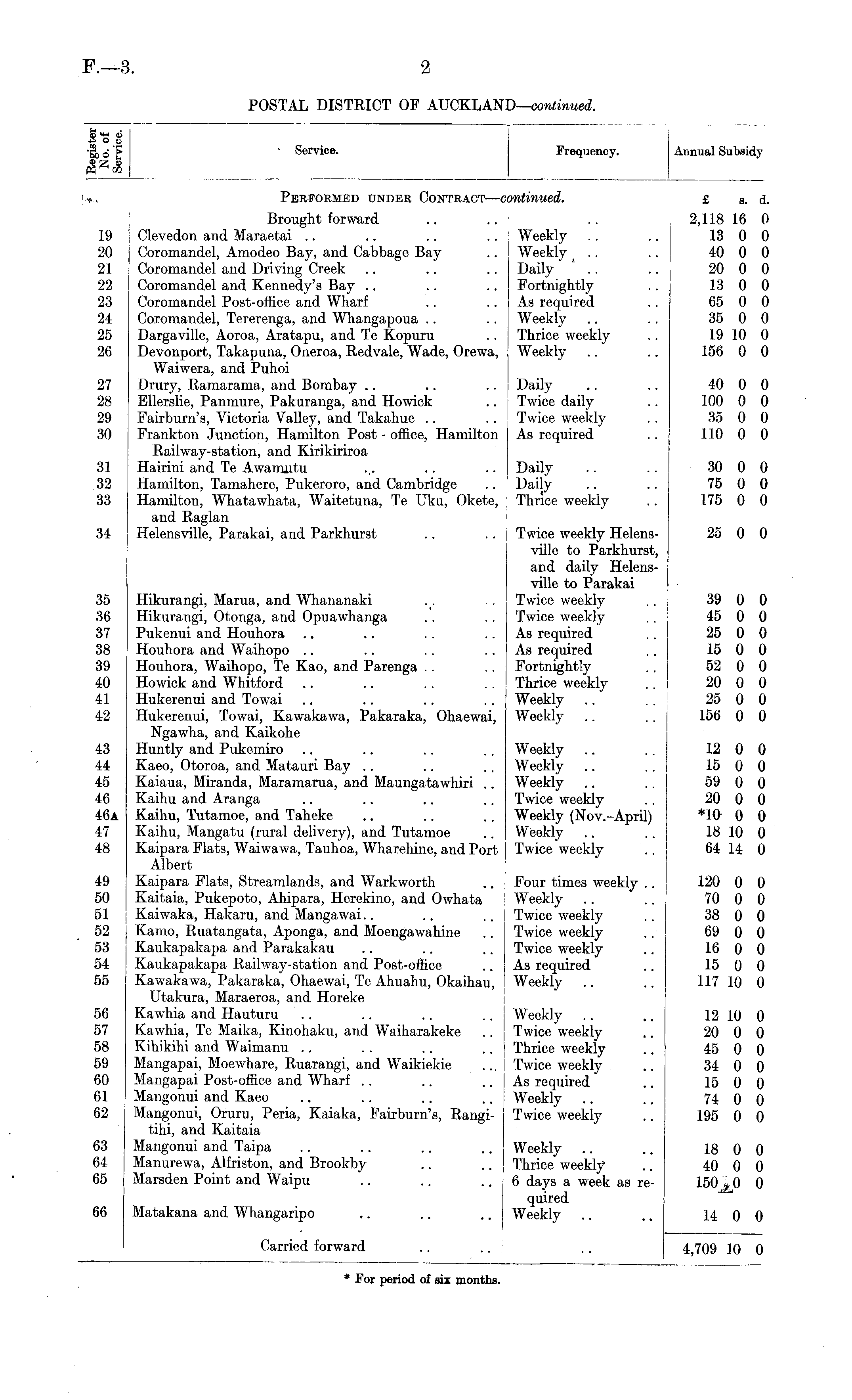 -is o o loo £ Service. Frequency. Annual Subsidy Performed under Contract —a mtinued. £ s. d. 19 20 21 22 23 21 25 26 Brought forward Clevedon and Maraetai Coromandel, Amodeo Bay, and Cabbage Bay Coromandel and Driving Creek Coromandel and Kennedy's Bay Coromandel Post-office and Wharf Coromandel, Tererenga, and Whangapoua Dargaville, Aoroa, Aratapu, and Te Kopuru Devonport, Takapuna, Oneroa, Redvale, Wade, Orewa, Waiwera, and Puhoi Drury, Ramarama, and Bombay Ellerslie, Panmure, Pakuranga, and Howick Fairburn's, Victoria Valley, and Takahue .. Frankton Junction, Hamilton Post - office, Hamilton Railway-station, and Kirikiriroa Hairini and Te Awamutu Hamilton, Tamahere, Pukeroro, and Cambridge Hamilton, Whatawhata, Waitetuna, Te Uku, Okete, and Raglan Helensville, Parakai, and Parkhurst .. .. | Weekly Weekly Daily .. Fortnightly As required Weekly Thrice weekly Weekly 2,118 16 0 13 0 0 40 0 0 20 0 0 13 0 0 65 0 0 35 0 0 19 10 0 156 0 0 27 28 29 30 Daily Twice daily Twice weekly As required 40 0 0 100 0 0 35 0 0 110 0 0 3] .",2 33 Daily Daily Thrice weekly 30 0 0 75 0 0 175 0 0 :il Twice weekly Helensville to Parkhurst, and daily Helensville to Parakai Twice weekly Twice weekly As required As required Fortnightly Thrice weekly Weekly Weekly 25 0 0 35 36 37 38 39 40 41 42 Hikurangi, Marua, and Whananaki Hikurangi, Otonga, and Opuawhanga Pukenui and Houhora Houhora and Waihopo Houhora, Waihopo, Te Kao, and Parenga Howick and Whitford Hukerenui and Towai Hukerenui, Towai, Kawakawa, Pakaraka, Ohaewai, Ngawha, and Kaikohe Huntly and Pukemiro Kaeo, Otoroa, and Matauri Bay Kaiaua, Miranda, Maramarua, and Maungatawhiri .. Kaihu and Aranga Kaihu, Tutamoe, and Taheke Kaihu, Mangatu (rural delivery), and Tutamoe Kaipara Flats, Waiwawa, Tauhoa, Wharehine, and Port Albert Kaipara Flats, Streamlands, and Warkworth Kaitaia, Pukepoto, Ahipara, Herekino, and Owhata Kaiwaka, Hakaru, and Mangawai Kamo, Ruatangata, Aponga, and Moengawahine Kaukapakapa and Parakakau Kaukapakapa Railway-station and Post-office Kawakawa, Pakaraka, Ohaewai, Te Ahuahu, Okaihau, Utakura, Maraeroa, and Horeke Kawhia and Hauturu Kawhia, Te Maika, Kinohaku, and Waiharakeke Kihikihi and Waimanu Mangapai, Moewhare, Ruarangi, and Waikiekie ... | Mangapai Post-office and Wharf Mangonui and Kaeo Mangonui, Oruru, Peria, Kaiaka, Fairburn's, Rangitihi, and Kaitaia Mangonui and Taipa Manurewa, Alfriston, and Brookby Marsden Point and Waipu 39 0 0 45 0 0 25 0 0 15 0 0 52 0 0 20 0 0 25 0 0 156 0 0 43 44 45 46 46a 47 48 Weekly Weekly Weekly Twice weekly Weekly (Nov.-April) Weekly Twice weekly 12 0 0 15 0 0 59 0 0 20 0 0 *10 0 0 18 10 0 64 14 0 49 50 51 52 53 54 55 Four times weekly .. Weekly Twice weekly Twice weekly Twice weekly As required Weekly 120 0 0 70 0 0 38 0 0 69 0 0 16 0 0 15 0 0 117 10 0 56 57 58 59 60 61 62 Weekly Twice weekly Thrice weekly Twice weekly As required Weekly .. Twice weekly 12 10 0 20 0 0 45 0 0 34 0 0 15 0 0 74 0 0 195 0 0 63 64 65 Weekly Thrice weekly 6 days a week as required Weekly 18 0 0 40 0 0 150,0 0 66 Matakana and Whangaripo 14 0 0 Carried forward 4,709 10 0 "For leriod of six months.