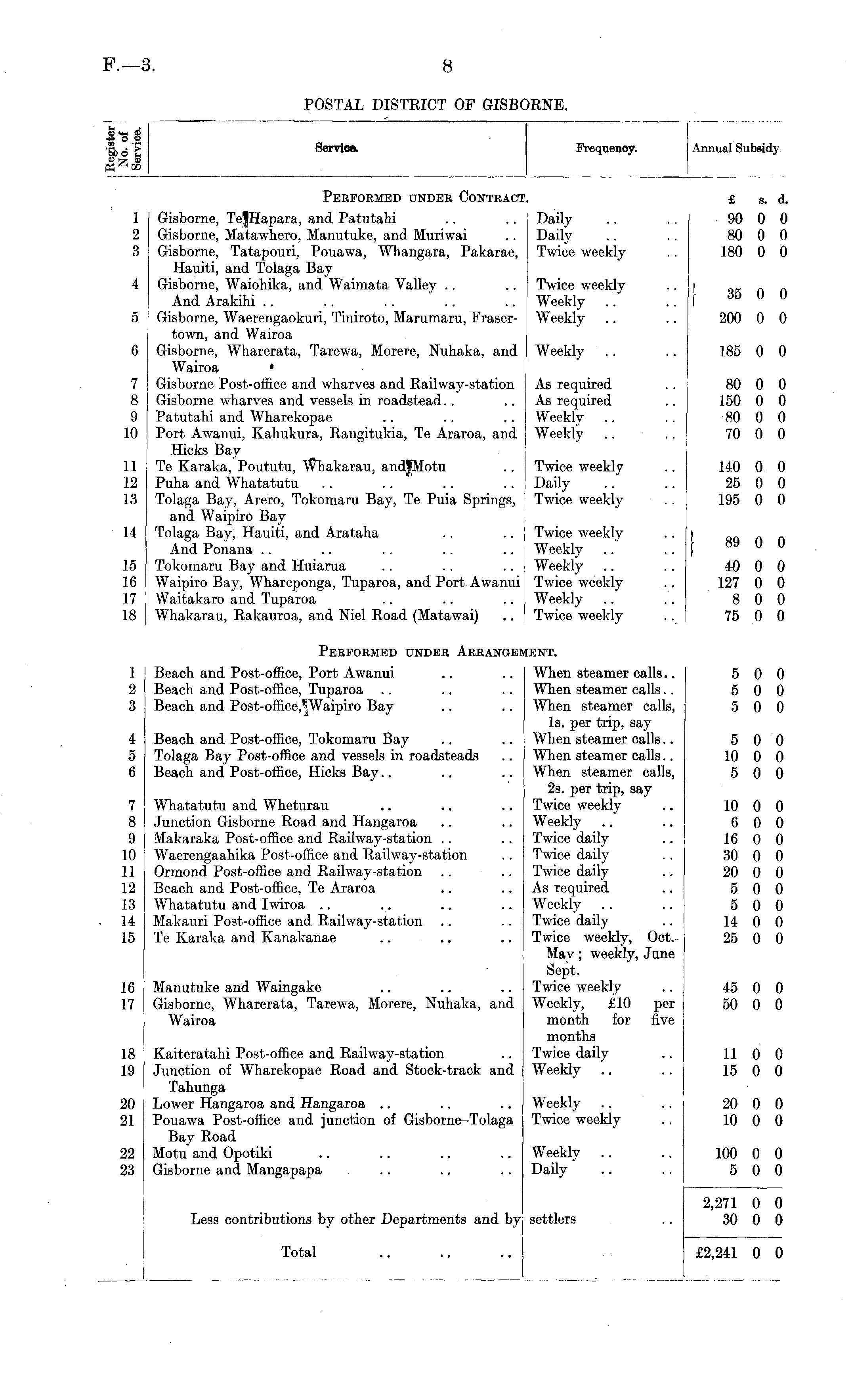 Sorvioe. Frequency. Annual Subsidy Performed under Contract £ s. d. 1 2 3 4 5 6 7 8 9 10 Gisborne, Te|Hapara, and Patutahi Gisborne, Matawhero, Manutuke, and Muriwai Gisborne, Tatapouri, Pouawa, Whangara, Pakarae, Hauiti, and Tolaga Bay Gisborne, Waiohika, and Waimata Valley And Arakihi Gisborne, Waerengaokuri, Tiniroto, Marumaru, Frasertown, and Wairoa Gisborne, Wharerata, Tarewa, Morere, Nuhaka, and Wairoa • Gisborne Post-office and wharves and Railway-station Gisborne wharves and vessels in roadstead.. Patutahi and Wharekopae Port Awanui, Kahukura, Rangitukia, Te Araroa, and Hicks Bay Te Karaka, Poututu, Whakarau, and|Motu Puha and Whatatutu .. .. .. Tolaga Bay, Arero, Tokomaru Bay, Te Puia Springs, and Waipiro Bay Tolaga Bay, Hauiti, and Arataha .. .. ] And Ponana Tokomaru Bay and Huiarua Waipiro Bay, Whareponga, Tuparoa, and Port Awanui Waitakaro and Tuparoa Whakarau, Rakauroa, and Niel Road (Matawai) Daily Daily Twice weekly Twice weekly Weekly Weekly Weekly As required As required Weekly Weekly 90 0 0 80 0 0 180 0 0 I 35 0 0 200 0 0 185 0 0 80 0 0 150 0 0 80 0 0 70 0 0 11 12 13 Twice weekly Daily Twice weekly 140 0 0 25 0 0 195 0 0 14 Twice weekly Weekly Weekly Twice weekly Weekly Twice weekly [ 89 0 0 15 16 17 18 40 0 0 127 0 0 8 0 0 75 0 0 1 2 3 Performed under Arrangem CENT. 5 0 0 5 0 0 5 0 0 Beach and Post-office, Port Awanui Beach and Post-office, Tuparoa Beach and Post-office,*Waipiro Bay When steamer calls.. When steamer calls.. When steamer calls, Is. per trip, say When steamer calls.. When steamer calls.. When steamer calls, 2s. per trip, say Twice weekly Weekly Twice daily Twice daily Twice daily As required Weekly Twice daily Twice weekly, Oct. May ; weekly, June Sept. Twice weekly Weekly, £10 per month for five months Twice daily Weekly 4 5 6 Beach and Post-office, Tokomaru Bay Tolaga Bay Post-office and vessels in roadsteads Beach and Post-office, Hicks Bay 5 0 0 10 0 0 5 0 0 7 8 9 10 11 12 13 14 15 Whatatutu and Wheturau Junction Gisborne Road and Hangaroa Makaraka Post-office and Railway-station Waerengaahika Post-office and Railway-station Ormond Post-office and Railway-station Beach and Post-office, Te Araroa Whatatutu and Iwiroa Makauri Post-office and Railway-station Te Karaka and Kanakanae 10 0 0 6 0 0 16 0 0 30 0 0 20 0 0 5 0 0 5 0 0 14 0 0 25 0 0 16 17 Manutuke and Waingake Gisborne, Wharerata, Tarewa, Morere, Nuhaka, and Wairoa 45 0 0 50 0 0 18 J I) Kaiteratahi Post-office and Railway-station Junction of Wharekopae Road and Stock-track and Tahunga Lower Hangaroa and Hangaroa Pouawa Post-office and junction of Gisborne-Tolaga Bay Road Motu and Opotiki Gisborne and Mangapapa 11 0 0 15 0 0 20 21 Weekly Twice weekly 20 0 0 10 0 0 22 23 Weekly Daily 100 0 0 5 0 0 Less contributions by other Departments and by settlers 2,271 0 0 30 0 0 Total £2,241 0 0