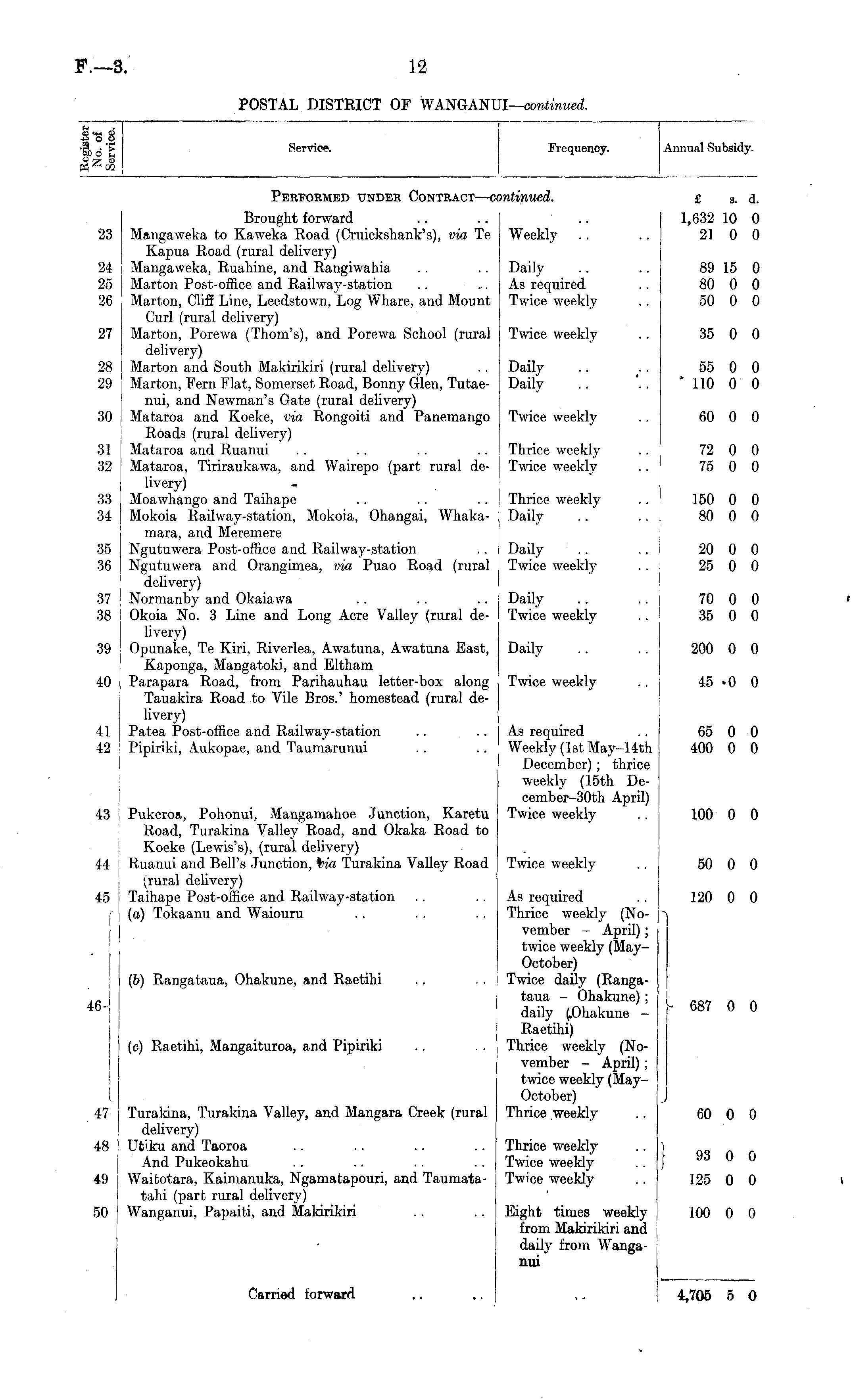 l-s s fd-g Service. Frequenoy. Annual Subsidy Performed under Contract —c< mtinued. £ s. d. 23 Brought forward Mangaweka to Kaweka Road (Cruickshank's), via Tβ Kapua Road (rural delivery) Mangaweka, Ruahine, and Rangiwahia Marton Post-office and Railway-station Marton, Cliff Line, Leedstown, Log Whare, and Mount Curl (rural delivery) Marton, Porewa (Thorn's), and Porewa School (rural delivery) Marton and South Makirikiri (rural delivery) Marton, Fern Flat, Somerset Road, Bonny Glen, Tutaenui, and Newman's Gate (rural delivery) Mataroa and Koeke, via Rongoiti and Panemango Roads (rural delivery) Mataroa and Ruanui Mataroa, Tiriraukawa, and Wairepo (part rural delivery) Moawhango and Taihape Mokoia Railway-station, Mokoia, Ohangai, Whakamara, and Meremere Ngutuwera Post-office and Railway-station Ngutuwera and Orangimea, via Puao Road (rural delivery) Normanby and Okaiawa Okoia No. 3 Line and Long Acre Valley (rural delivery) Opunake, Te Kiri, Riverlea, Awatuna, Awatuna East, Kaponga, Mangatoki, and Eltham Parapara Road, from Parihauhau letter-box along Tauakira Road to Vile Bros.' homestead (rural delivery) Patea Post-office and Railway-station Pipiriki, Aukopae, and Taumarunui Weekly 1,632 10 0 21 0 0 21 25 20 Daily As required Twice weekly 89 15 0 80 0 0 50 0 0 27 Twice weekly 35 0 0 28 29 Daily Daily 55 0 0 110 0 0 30 Twice weekly 60 0 0 31 32 Thrice weekly Twice weekly 72 0 0 75 0 0 33 34 Thrice weekly Daily 150 0 0 80 0 0 35 36 Daily Twice weekly 20 0 0 25 0 0 37 38 Daily Twice weekly 70 0 0 35 0 0 < 3!) Daily 200 0 0 40 Twice weekly 45 -0 0 1:1 12 As required Weekly (1st May-14th December) ; thrice weekly (15th De-cember-30th April) Twice weekly 65 0 0 400 0 0 43 Pukeroa, Pohonui, Mangamahoe Junction, Karetu Road, Turakina Valley Road, and Okaka Road to Koeke (Lewis's), (rural delivery) Ruanui and Bell's Junction, %ia Turakina Valley Road (rural delivery) Taihape Post-office and Railway-station (a) Tokaanu and Waiouru 100 0 0 44 Twice weekly 50 0 0 . ! 46 -J 45 (6) Rangataua, Ohakune, and Raetihi As required Thrice weekly (November - April) ; twice weekly (MayOctober) Twice daily (Rangataua - Ohakune); daily - Raetihi) Thrice weekly (November - April) ; twice weekly (MayOctober) Thrice weekly 120 0 0 687 0 0 (c) Raetihi, Mangaituroa, and Pipiriki I 47 48 Turakina, Turakina Valley, and Mangara Creek (rural delivery) Ut'.ku and Taoroa And Pukeokahu Waitotara, Kaimanuka, Ngamatapouri, and Taumatatahi (part rural delivery) Wanganui, Papaiti, and Makirikiri Thrice weekly Twice weekly Twice weekly 60 0 0 93 0 0 49 125 0 0 \ 50 Eight times weekly from Makirikiri and daily from Wanganui 100 0 0 Carried forward 4,705 5 0