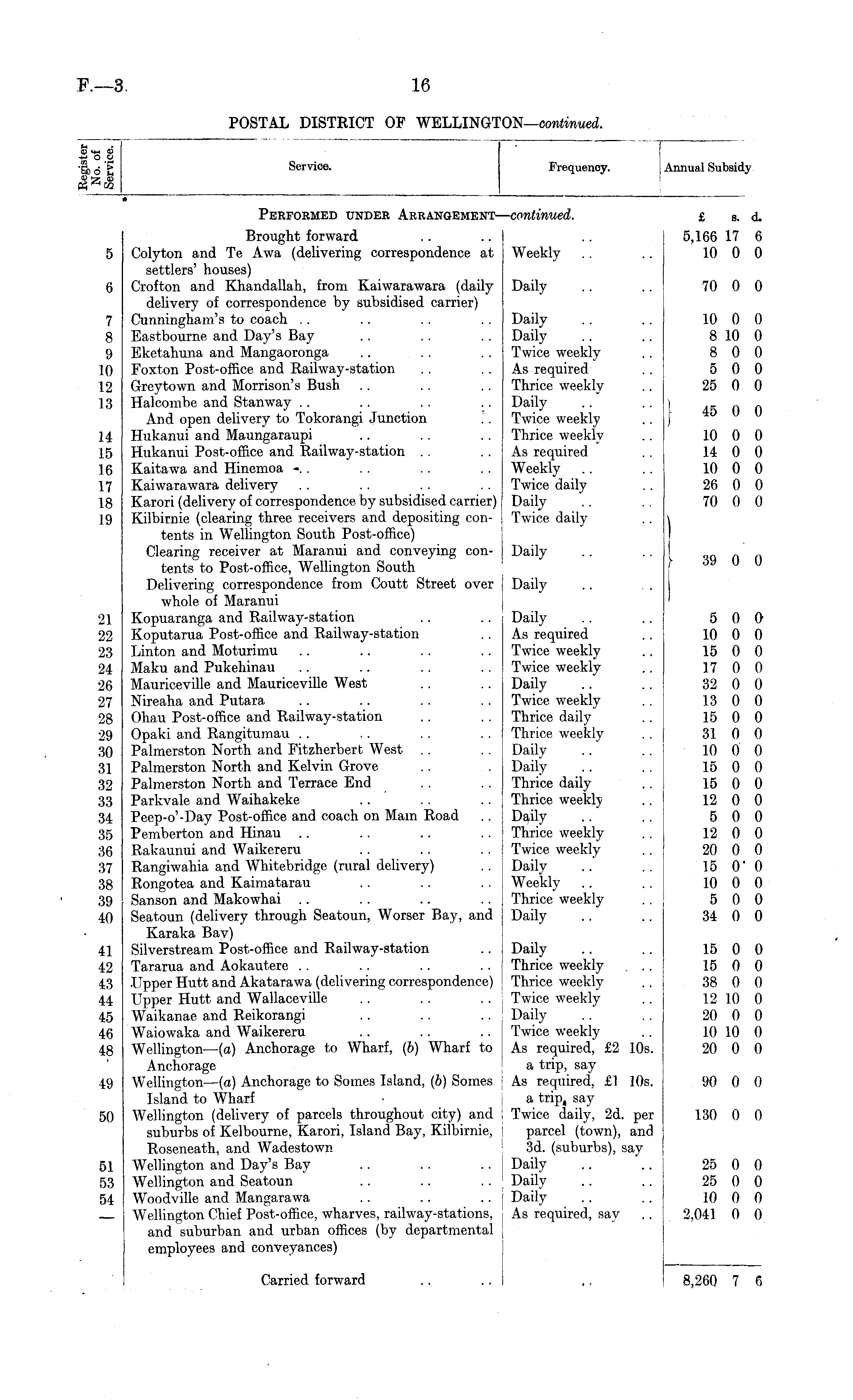 "5b d t Service. Frequency. Annual Subsidy Performed under Arrangement■continued. £ s. d. 21 22 23 24 26 27 28 29 30 31 32 33 34 35 36 37 38 39 40 5 6 7 8 9 10 12 13 14 15 1C, 17 18 19 Brought forward Colyton and Te Awa (delivering correspondence at settlers' houses) Crofton and Khandallah, from Kaiwarawara (daily delivery of correspondence by subsidised carrier) Cunningham's to coach Eastbourne and Day's Bay Eketahuna and Mangaoronga Foxton Post-office and Railway-station Grey town and Morrison's Bush Halcombe and Stanway And open delivery to Tokorangi Junction Hukanui and Maungaraupi Hukanui Post-office and Railway-station Kaitawa and Hinemoa -. . Kaiwarawara delivery Karori (delivery of correspondence by subsidised carrier) Kilbirnie (clearing three receivers and depositing contents in Wellington South Post-office) Clearing receiver at Maranui and conveying contents to Post-office, Wellington South Delivering correspondence from Coutt Street over whole of Maranui Kopuaranga and Railway-station Koputarua Post-office and Railway-station Linton and Moturimu Maku and Pukehinau Mauriceville and Mauriceville West Nireaha and Putara Ohau Post-office and Railway-station Opaki and Rangitumau Palmerston North and Fitzherbert West Palmerston North and Kelvin Grove Palmerston North and Terrace End Parkvale and Waihakeke Peep-o'-Day Post-office and coach on Mam Road Pemberton and Hinau Rakaunui and Waikereru Rangiwahia and Whitebridge (rural delivery) Rongotea and Kaimatarau Sanson and Makowhai Seatoun (delivery through Seatoun, Worser Bay, and Karaka Bay) Silverstream Post-office and Railway-station Tararua and Aokautere ■Upper Hutt and Akatarawa (delivering correspondence) Upper Hutt and Wallaceville Waikanae and Reikorangi Waiowaka and Waikereru Wellington —(a) Anchorage to Wharf, (6) Wharf to Anchorage Wellington — (a) Anchorage to Somes Island, (6) Somes Island to Wharf Wellington (delivery of parcels throughout city) and suburbs of Kelbourne, Karori, Island Bay, Kilbirnie, Roseneath, and Wadestown Wellington and Day's Bay Wellington and Seatoun Woodville and Mangarawa Wellington Chief Post-office, wharves, railway-stations, and suburban and urban offices (by departmental employees and conveyances) Weekly Daily Daily Daily Twice weekly As required Thrice weekly Daily Twice weekly Thrice weekly As required Weekly Twice daily Daily Twice daily Daily Daily Daily As required Twice weekly Twice weekly Daily Twice weekly Thrice daily Thrice weekly Daily Daily Thrice daily Thrice weekly Daily Thrice weekly Twice weekly Daily Weekly Thrice weekly Daily 5,166 17 6 10 0 0 70 0 0 10 0 0 8 10 0 8 0 0 5 0 0 25 0 0 45 0 0 10 0 0 14 0 0 10 0 0 26 0 0 70 0 0 ) I 39 0 0 5 0 0 10 0 0 15 0 0 17 0 0 32 0 0 13 0 0 15 0 0 31 0 0 10 0 0 15 0 0 15 0 0 12 0 0 5 0 0 12 0 0 20 0 0 15 0 - 0 10 0 0 5 0 0 34 0 0 41 42 43 44 45 46 48 49 Daily Thrice weekly Thrice weekly Twice weekly Daily Twice weekly As required, £2 10s. a trip, say As required, £1 10s. a trip, say Twice daily, 2d. per parcel (town), and 3d. (suburbs), say Daily Daily Daily As required, say 15 0 0 15 0 0 38 0 0 12 10 0 20 0 0 10 10 0 20 0 0 90 0 0 50 130 0 0 51 53 54 25 0 0 25 0 0 10 0 0 2,041 0 0 Carried forward 8,260 7 6