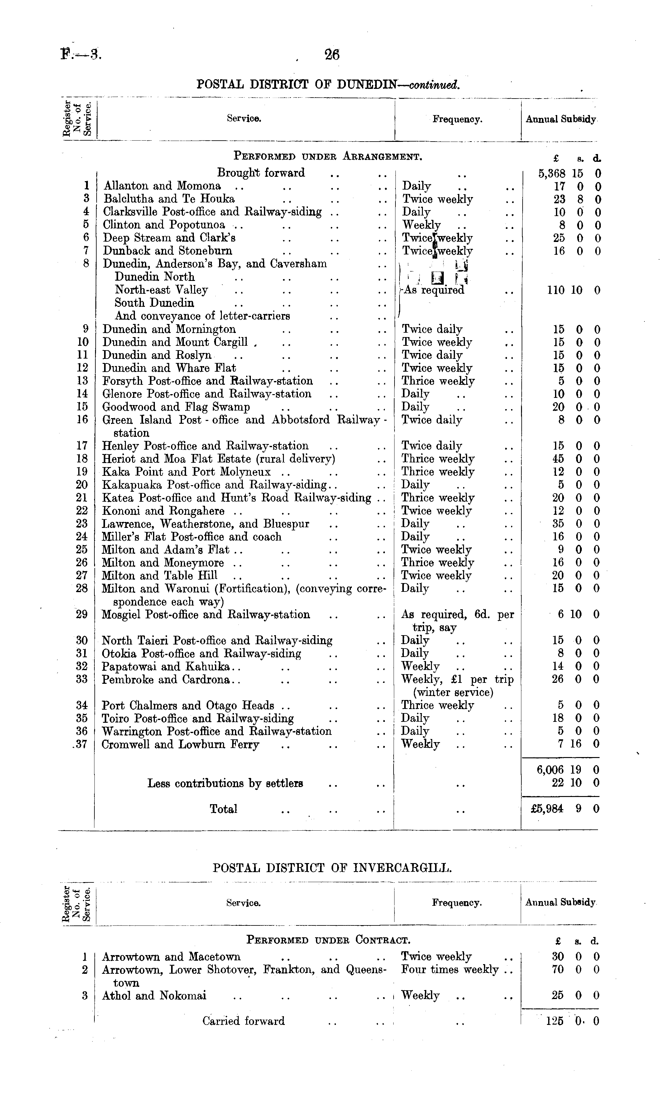 +a O C Service. Frequency. Annual Subsidy Performed under Contract. £ a. d. 1 Arrowtown and Macetown .. .. .. Twice weekly 2 Arrowtown, Lower Shotover, Frankton, and Queens- Four times weekly .. 30 70 0 0 0 0 town 3 Athol and Nokomai .. .. .. .. j Weekly Carried forward .. 25 0 0 12,