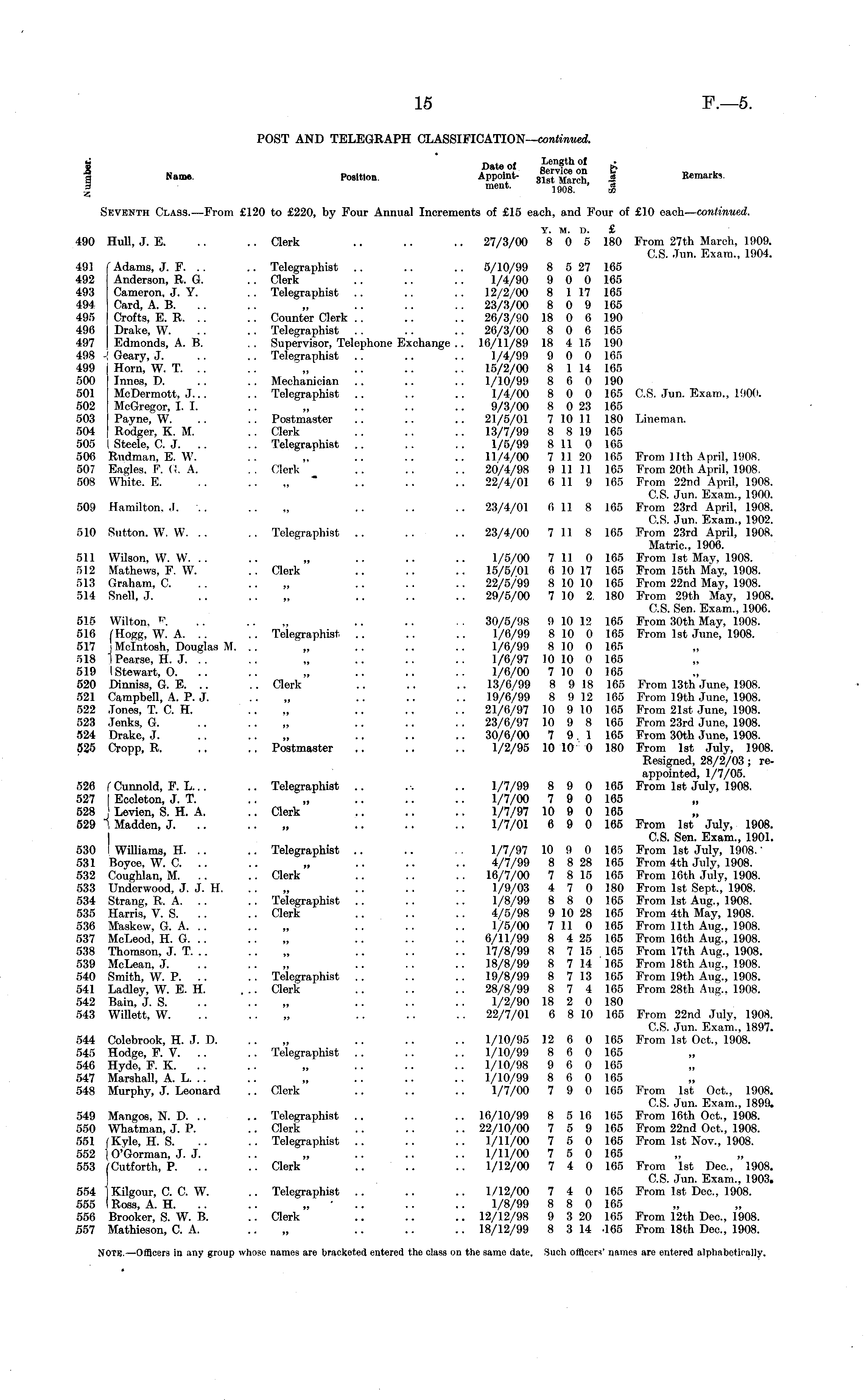 POST AND TELEGRAPH CLASSIFICATION— continued. S Date of Length of . I Name- Position Appoint- * Remarks. I ment - 1908. ' ' w Skventh Class.—From £120 to £220, by Four Annual Increments of £15 each, and Four of £10 each— continued. y. m. d. £ 490 Hull, J. E. .. .. Clerk .. .. .. 27/3/00 8 0 5 180 From 27th March, 1909. C.S. Jun. Exam., 1904. 491 f Adams, J. F. .. .. Telegraphist .. .. .. 5/10/99 8 527 165 492 Anderson, R. G. . . Clerk .. .. .. 1/4/90 9 0 0 165 493 Cameron, J. Y. . . Telegraphist .. .. .. 12/2/00 8 117 165 494 Card, A. B. .. .. „ .. .. .. 23/3/00 8 0 9 165 495 Crofts, E. R. .. .. Counter Clerk .. .. .. 26/3/90 18 0 6 190 496 Drake, W. .. .. Telegraphist . . .. .. 26/3/00 8 0 6 165 497 Edmonds, A. B. .. Supervisor, Telephone Exchange .. 16/11/89 18 415 190 498 ' Geary, J. .. .. Telegraphist .. .. .. 1/4/99 9 0 0 165 499 Horn, W. T. .. .. „ .. .. .. 15/2/00 8 114 165 500 Innes, D. .. . . Mechanician .. .. .. 1/10/99 8 6 0 190 501 McDermott, J... .. Telegraphist .. .. .. 1/4/00 8 0 0 165 C.S. Jun. Exam., 1900. 502 McGregor, I. I. .. „ .. .. .. 9/3/00 8 023 165 503 Payne, W. .. .. Postmaster .. .. .. 21/5/01 710 11 180 Lineman. 504 Rodger, K. M. .. Clerk .. .. .. 13/7/99 8 819 165 505 I Steele, C. J. .. .. Telegraphist .. .. .. 1/5/99 811 0 165 506 Rudman, E. \V. .. „ .. .. .. 11/4/00 7 1120 165 From 11th April, 1908. 507 Eagles. F. C. A. .. Clerk .. .. .. 20/4/98 9 1111 165 From 20th April, 1908. 508 White. E. .. .. „ .. .. .. 22/4/01 611 9 165 From 22nd April, 1908. C.S. Jun. Exam., 1900. 509 Hamilton..!. .. .. .. .. .. 23/4/01 011 8 165 From 23rd April, 1908. C.S. Jun. Exam., 1902. 510 Sutton. W. W. .. .. Telegraphist .. .. .. 23/4/00 711 8 165 From 23rd April, 1908. Matric, 1906. 511 Wilson, W. W. .. .. „ .. .. .. 1/5/00 711 0 105 From Ist Miiy, 190e8. 512 Mathews, F. W. .. Clerk .. .. .. 15/5/01 610 17 165 From 15th May, 1908. 513 Graham. C. .. „ .. .. • - 22/5/99 810 10 165 From 22nd May, 1908. 514 Snell, J. .. .. „ .. .. .. 29/5/00 710 2. 180 From 29th May, 1908. C.S. Sen. Exam., 1906. 515 Wilton, F .. .. „ .. .. 30/5/98 910 12 165 From 30th May, 1908. 516 (Hogg, W. A. .. .. Telegraphist .. .. .. 1/6/99 810 0 165 From Ist June, 1908. 517 I Mcintosh, Douglas M. .. „ .. .. .. 1/6/99 810 0 165 518 IPearse, H. J. .. .. „ .. .. .. 1/6/97 10 10 0 165 519 (Stewart, O. .. .. „ .. .. .. 1/6/00 710 0 165 520 Dinniss, G. E. .. .. Clerk .. .. .. 13/6/99 8 918 165 From 13th June, 1908. 521 Campbell, A. P. J. .. „ .. .. .. 19/6/99 8 912 165 From 19th June, 1908. 522 Jones, T. C. H. .. „ .. .. .. 21/6/97 10 9 10 165 From 21st June, 1908. 523 Jenks, G. .. .. „ .. .. .. 23/6/97 10 9 8 165 From 23rd June, 1908. 524 Drake, J. .. .. „ .. .. .. 30/6/00 7 9 1 165 From 30th June, 1908. 525 Cropp, R. ~ .. Postmaster .. .. .. 1/2/95 10 10 0 180 From Ist July, 1908. Resigned, 28/2/03 ; reappointed, l/ 7/05. 526 1" Cunnold, F. L... .. Telegraphist .. .. .. 1/7/99 8 9 0 165 From Ist July, 1908. 527 I Eccleton, J. T. .. „ .. .. .. 1/7/00 7 9 0 165 528 j Levien, S. H. A. .. Clerk .. .. .. 1/7/97 10 9 0 165 529 1 Madden, J. .. ~ .. • • • • 1/7/01 69 0 165 From Ist July, 1908. I C.S. Sen. Exam., 1901. 530 I Williams, H. .. .. Telegraphist .. .. . . 1/7/97 10 9 0 165 From Ist July, 1908.' 531 Boyce. W. C. .. .. „ .. .. .. 4/7/99 8 828 165 From 4th July, 1908. 532 Coughlan, M. .. .. Clerk .. .. .. 16/7/00 7 815 165 From 16th July, 1908. 533 Underwood, J. J. H. .. „ .. .. .. 1/9/03 4 7 0 180 From Ist Sept., 1908. 534 Strang, R. A. . . .. Telegraphist .. .. .. 1/8/99 8 8 0 165 From Ist Aug., 1908. 535 Harris, V. S. .. .. Clerk .. .. .. 4/5/98 910 28 165 From 4th May, 1908. 536 Maskew, G. A. .. .. .. .. .. 1/5/00 711 0 165 From 11th Aug., 1908. 537 McLeod, H. G. .. .. .. .. .. 6/11/99 8 425 165 From 16th Aug., 1908. 538 Thomson, J. T. .. .. „ .. .. .. 17/8/99 8 715 165 From 17th Aug., 1908. 539 McLean, J. .. „ .. ■ • . • 18/8/99 8 714 165 From 18th Aug., 1908. 540 Smith, W. P. .. .. Telegraphist .. .. .. 19/8/99 8 713 165 From 19th Aug., 1908. 541 Ladley, W. E. H. ... Clerk .. .. .. 28/8/99 874 165 From 28th Aug.. 1908. 542 Bain, J. S. .. . - „ .. • • • • 1/2/90 18 2 0 180 543 Willett, W. .. .. „ .. • • • • 22/7/01 6 810 165 From 22nd July, 1908. C.S. Jun. Exam., 1897. 544 Colebrook, H. J. D. .. „ .. .. .. 1/10/95 12 6 0 165 From Ist Oct., 1908. 545 Hodge, F. V. .. .. Telegraphist .. .. .. 1/10/99 8 6 0 165 546 Hyde, F. K. .. .. „ .. .. .. 1/10/98 9 6 0 165 547 Marshall, A. L. .. .. „ .. .. .. 1/10/99 8 6 0 165 548 Murphy, J. Leonard .. Clerk .. .. .. 1/7/00 7 9 0 165 From Ist Oct., 1908. C.S. Jun. Exam., 1899. 549 Mangos, N. D. .. .. Telegraphist .. .. .. 16/10/99 8 516 165 From 16th Oct., 1908. 550 Whatman, J. P. .. Clerk .. .. .. 22/10/00 7 5 9 105 From 22nd Oct., 1908. 551 (Kyle, H. S. .. .. Telegraphist .. .. .. 1/11/00 7 5 0 165 From Ist Nov., 1908. 552 10'Gorman, J. J. .. „ .. .. .. 1/11/00 7 5 0 165 553 (Cutforth, P. .. .. Clerk .. .. .. 1/12/00 7 4 0 165 From Ist Dec, 1908. C.S. Jun. Exam., 1903. 554 1 Kilgour, C. C. W. .. Telegraphist .. .. .. 1/12/00 7 4 0 165 From Ist Dec, 1908. 555 (Ross, A. H. .. .. „ • .. .. 1/8/99 8 8 0 168 556 Brooker, S. W. B. .. Clerk .. .. .. 12/12/98 9 320 165 From 12th Dec, 1908. 557 Mathieson, C. A. .. „ .. .. .. 18/12/99 8 314 .165 From 18th Dec, 1908. NOTE. —Officers in any group whose names are bracketed entered the class on the same date. Such officers' names are entered alphabetically.