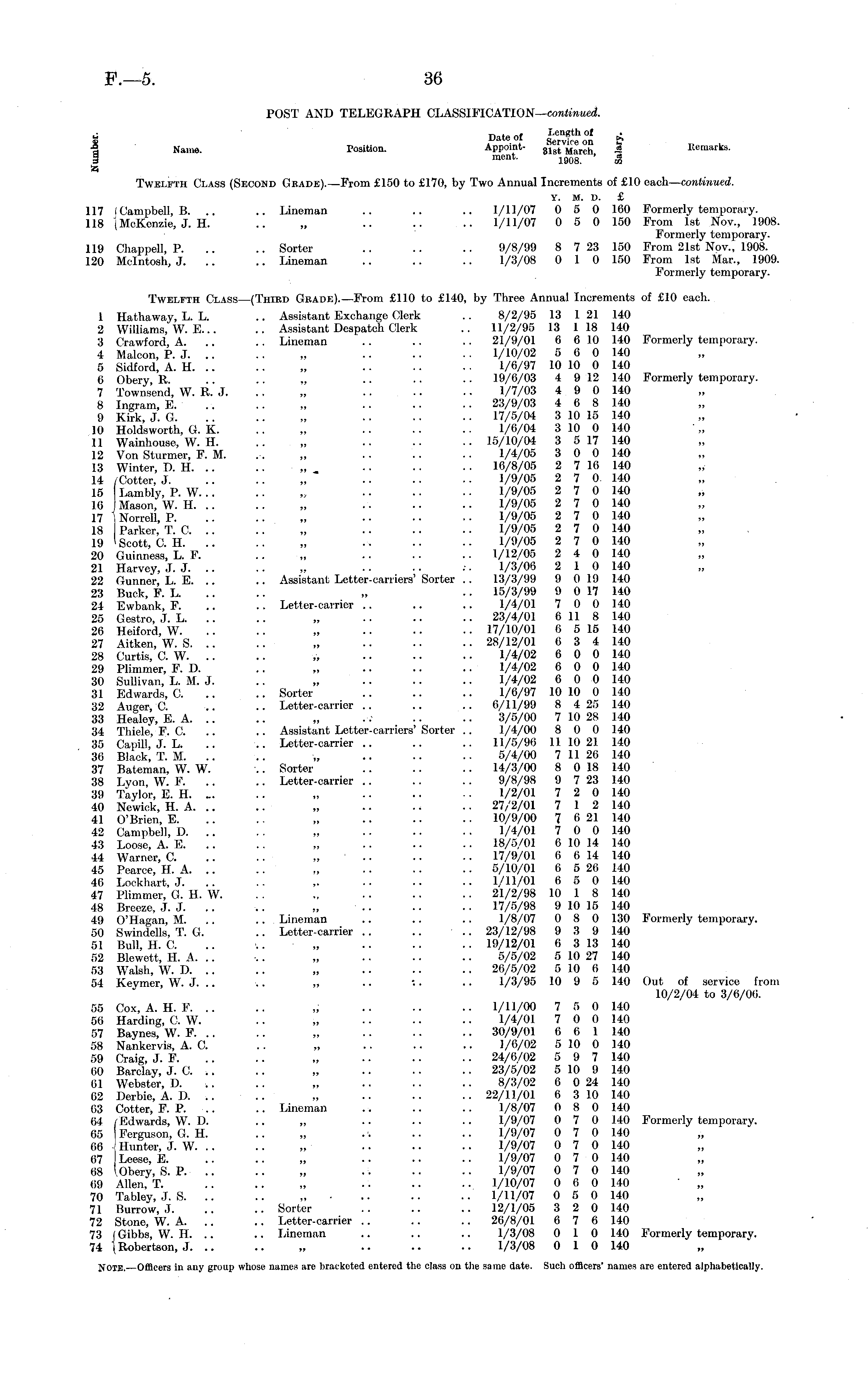 POST AND TELEGRAPH CLASSIFICATION— continued. r. . ~« Length of " Date of Serv i re on «J ■9 Name. Position. Appoint- S lst March - Kemarks. | mcnt. 19(J8 ' « H Twelfth Class (Second Gkade). —From £150 to £170, by Two Annual Increments of £10 each— continued. Y. M. D. £ 117 I Campbell, B. .. .. Lineman .. .. .. 1/11/07 0 5 0 160 Formerly temporary. 118 (MoKenzie, J. H. .. „ .. .. .. 1/11/07 0 5 0 150 From Ist Nov., I9OS. Formerly temporary. 119 Chappell, P. .. .. Sorter .. .. .. 9/8/99 8 723 150 From 21st Nov., 1908. 120 Mcintosh, J. .. .. Lineman .. .. .. 1/3/08 0 1 0 150 From Ist Mar., 1909. Formerly temporary. Twelfth Class —(Third Graoe). —From £110 to £140, by Three Annual Increments of £10 each. 1 Hathaway, L. L. .. Assistant Exchange Clerk .. 8/2/95 13 121 140 2 Williams, W. E... .. Assistant Despatch Clerk .. 11/2/95 13 118 140 3 Crawford, A. .. Lineman .. .. .. 21/9/01 6 610 140 Formerly temporary. 4 Malcon, P. J „ 1/10/02 5 6 0 140 5 Sidford, A. H „ 1/0/97 10 10 0 140 6 Obery R „ ...... 19/6/03 4 912 140 Formerly temporary. 7 Townsend, W. R. J 1/7/03 4 9 0 140 8 Ingram, E , 23/9/03 4 6 8 140 9 Kirk, J. G , 17/5/04 310 15 140 10 Holdsworth, G. K. .. „ .. .. .. 1/6/04 310 0 140 11 Wainhouse, W. H. .. „ .. .. .. 15/10/04 3 517 140 12 Yon Stunner, F. M. .. „ .. .. .. 1/4/05 3 0 0 140 13 Winter, D. H „ . 16/8/05 2 716 140 14 /Cotter, J „ 1/9/05 2 7 0. 140 15 Lambly, P. W „ 1/9/05 2 7 0 140 16 Mason, W. H „ 1/9/05 2 7 0 140 17 Norrell, P „ 1/9/05 2 7 0 140 18 Parker, T. C „ 1/9/05 2 7 0 140 19 (Scott, 0. H „ 1/9/05 2 7 0 140 20 Guinness, L. F. .. „ 1/12/05 2 4 0 140 21 Harvey, J. J „ ... •• ••■ 1/3/06 2 1 0 140 22 Gunner, L. E. .. .. Assistant Letter-carriers' Sorter .. 13/3/99 9 019 140 23 Buck, F. L „ .. 15/3/99 9 017 140 24 Ewbank, F. .. .. Letter-carrier .. .. .. 1/4/01 7 0 0 140 25 Gestro, J. L 23/4/01 611 8 140 26 Heiford, W „ 17/10/01 6 515 140 27 Aitken, W. S „ 28/12/01 0 3 4 140 28 Curtis, C. W 1/4/02 0 0 0 140 29 Plimmer, F. D. .. „ 1/4/02 0 0 0 140 30 Sullivan, L. M. J. .. „ 1/4/02 6 0 0 140 31 Edwards, C. .. .. Sorter .. .. .. 1/6/97 10 10 0 140 32 Auger, C. .. .. Letter-carrier .. .. .. 6/11/99 8 425 140 33 Healey, E. A „ 3/5/00 710 28 140 34 Thiele, F. C. .. .. Assistant Letter-carriers' Sorter .. 1/4/00 8 0 0 140 35 Capill, J. L. .. .. Letter-carrier .. .. .. 11/5/96 11 10 21 140 36 Black, T. M 5/4/00 7 1126 140 37 Bateman, W. W. .. Sorter .. .. .. 14/3/00 8 018 140 38 Lvon, W. F. .. .. Letter-carrier .. .. .. 9/8/98 9 723 140 39 Taylor, E. H. .. .. „ 1/2/01 7 2 0 140 40 Newick, H. A „ 27/2/01 7 1 2 140 41 O'Brien, E 10/9/00 7 621 140 42 Campbell, D , 1/4/01 7 0 0 140 43 Loose, A. E 18/5/01 010 14 140 44 Warner, C „ 17/9/01 6 614 140 45 I'earcc, H. A , 5/10/01 0 526 140 46 Lockhart, J ~ 1/11/01 6 5 0 140 47 Plimmer, G. H. W. . . „ 21/2/98 10 1 8 140 48 Breeze, J. J 17/5/98 910 15 140 49 O'Hagan, M. .. .. Lineman .. .. .. 1/8/07 0 8 0 130 Formerly temporary. 50 Swindells, T. G. .. Letter-carrier .. .. .. 23/12/98 9 3 9 140 51 Bull, H. C. .. .. „ 19/12/01 6 313 140 52 Blewett, H. A. .. .. , 5/5/02 510 27 140 53 Walsh, W. D „ 20/5/02 510 6 140 54 Keymer, W. J. .. .. „ • • •• • • • 1/3/95 10 9 5 140 Out of service from 10/2/04 to 3/6/06. 55 Cox, A. H. F „ 1/11/00 7 5 0 140 56 Harding, 0. W. .. „ . ■ • • • • 1/4/01 7 0 0 140 57 Baynes, W. F. .. .. „ .. .. .. 30/9/01 0 6 1 140 58 Nankervis, A. C. .. „ 1/6/02 510 0 140 59 Craig, J. F „ 24/6/02 5 9 7 140 00 Barclay, J. C „ 23/5/02 510 9 140 01 Webster, D. .. .. „ .. .. .. 8/3/02 0 024 140 02 Derbie, A. D. .. .. „ .. .. .. 22/11/01 0 310 140 63 Cotter, F. P. .. .. Lineman .. .. .. 1/8/07 0 8 0 140 64 /-Edwards, W. D. .. „ .. .. .. 1/9/07 0 7 0 140 Formerly temporary. 65 Ferguson, G. H. .. „ .. .. .. 1/9/07 0 7 0 140 66 Hunter, J. W , 1/9/07 0 7 0 140 67 Lcese, E , 1/9/07 0 7 0 140 68 lObery, S. P „ 1/9/07 0 7 0 140 09 Allen, T. .. .. „ .. .. .. 1/10/07 0 6 0 140 70 Tabley, J. S „ 1/11/07 0 5 0 140 71 Burrow, J. .. .. Sorter .. .. .. 12/1/05 3 2 0 140 72 Stone, W. A. .. .. Letter-carrier .. .. .. 26/8/01 6 7 6 140 73 (Gibbs, W. H. .. .. Lineman .. .. .. 1/3/08 0 1 0 140 Formerly temporary. 74 {Robertson, J. .. .. „ .. .. .. 1/3/08 01 0 140 Note. —Officers in any group whose names are bracketed entered the class on the same date. Such officers' names are entered alphabetically.