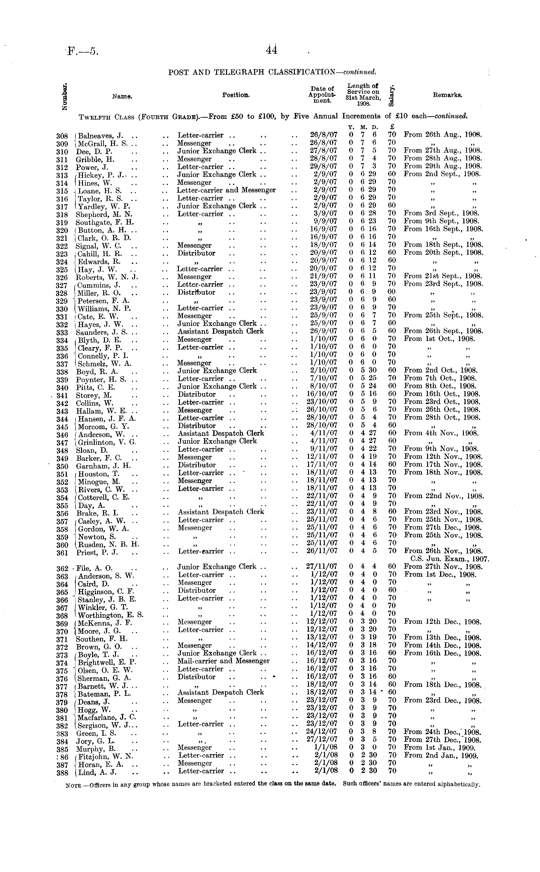 POST AND TELEGRAPH CLASSIFICATION— continued, i Date of Length of •9 Name . Position. Appoint- j? Remarks. S ment - 1908. ' & X Twelfth Class (Fourth Grade). —From £50 to £100, by Five Annual Increments of £10 each— continued. Y. m. d. £ 308 (Balneaves, J. .. .. Letter-carrier .. .. .. 26/8/07 0 7 6 70 From 26th Aug., 1908. 309 "iMcGrail, H. S. .. .. Messenger .. .. .. 26/8/07 0 7 6 70 310 Dee, D. P. .. .. Junior Exchange Clerk .. .. 27/8/07 0 7 5 70 From 27th Aug., 1908. 311 Gribble, H. .. .. Messenger .. .. .. 28/8/07 0 7 4 70 From 28th Aug., 1908. 312 Power, J. .. .. Letter-carrier .. .. .. 29/8/07 0 7 3 70 From 29th Aug., 1908. 313 /Hickey, P. J. ■ .. .. Junior Exchange Clerk .. .. 2/9/07 0 629 60 From 2nd Sept., 1908. 314 JHines, W. .. •• Messenger .. .. .. 2/9/07 00 29 70 315 i Loane, H. S. .. .. Letter-carrier and Messenger .. 2/9/07 0 029 70 316 Taylor, R. S. .. .. Letter-carrier .. .. .. 2/9/07 0 629 70 317 1 Yardley, W. P. .. Junior Exchange Clerk .. .. 2/9/07 06 29 60 318 Shepherd, M. N. .. Letter-carrier .. .. .. 3/9/07 0 028 70 From 3rd Sept., 1908. 319 Southgate, F. H. .. 9/9/07 0 023 70 From 9th Sept., 1908. 320 (Button A. H. .. .. „ .. •• •■ 16/9/07 0 610 70 From 10th Sept., 1908. 321 "(Clark, O. R. D. .. 16/9/07 0 616 70 322 Signal, W. C. .. .. Messenger .. .. .. 18/9/07 0 014 70 From 18th Sept., 1908. 323 (Cahill, H. R. .. .. Distributor .. .. .. 20/9/07 0 612 60 From 20th Sept., 1908. 324 Edwards, R 20/9/07 0 612 60 325 [Hay, J. W. .. .. Letter-carrier .. .. .. 20/9/07 0 612 70 326 Roberts, W. N. J. .. Messenger .. .. .. 21/9/07 0 611 70 From 21st Sept., 1908. 327 1 Cummins, J. .. .. Letter-carrier . . .. .. 23/9/07 0 6 9 70 From 23rd Sept., 1908. 328 'Miller, R. O. .. .. Distributor .. .. .. 23/9/07 0 0 9 60 329 1 Petersen, F. A. .. „ 23/9/07 0 6 9 60 330 Williams, N. P. .. Letter-carrier .. .. .. 23/9/07 0 6 9 70 331 I Gate, E. W. .. .. Messenger .. .. .. 25/9/07 0 6 7 70 From 25th Sept., 1908. 332 I Hayes, J. W. .. .. Junior Exchange Clerk .. .. 25/9/07 00 7 00 333 Saunders, J. S. .. .. Assistant Despatch Clerk .. 26/9/07 0 6 5 60 From 26th Sept., 1908. 334 1 Blyth, D. E. .. .. Messenger .. .. .. 1/10/07 0 6 0 70 From Ist Oct., 1908. 335 Cleary, F. P. .. .. Letter-carrier .. .. .. 1/10/07 0 6 0 70 336 j Connelly, P. I. .. „ 1/10/07 06 0 70 337 I Schmelz, W. A. .. Messenger .. . . .. 1/10/07 0 6 0 70 338 Boyd R. A. .. . . Junior Exchange Clerk .. 2/10/07 0 530 60 From 2nd Oct., 1908. 339 Poynter H. S. .. .. Letter-carrier .. .. .. 7/10/07 0 525 70 From 7th Oct., 1908. 340 Pitts CE. .. . . Junior Exchange Clerk . . .. 8/10/07 0 524 60 From Bth Oct., 1908. 341 Storey M. .. .. Distributor .. .. . . 16/10/07 0 516 60 From 16th Oct., 1908. 342 Collins' W • ■ Letter-carrier . . .. .. 23/10/07 0 5 9 70 From 23rd Oct., 1908. 343 Hallam, W. E. .. .. Messenger .. .. .. 26/10/07 0 5 0 70 From 26th Oct., 1908. 344 I Hansen, J. F. A. .. Letter-carrier .. .. .. 28/10/07 0 5 4 70 From 28th Oct., 1908. 345 iMorcom, G. Y. .. Distributor .. .. .. 28/10/07 0 5 4 00 346 (Anderson, W. .. .. Assistant Despatch Clerk .. 4/11/07 0 427 60 From 4th Nov., 1908. 347 "I Grinlinton, V. G. .. Junior Exchange Clerk .. 4/11/07 0 427 00 348 Sloan D. .. .. Letter-carrier .. .. .. 9/11/07 0 422 70 From 9th Nov., 1908. 349 Barker F. C. .. .. Messenger .. .. .. 12/11/07 0 419 70 From 12th Nov., 1908. 350 Garnham, J. H. .. Distributor .. .. .. 17/11/07 0 414 60 From 17th Nov., 1908. 351 (Houston, T. .. .. Letter-carrier .. ■ .. .. 18/11/07 0 413 70 From 18th Nov., 1908. 352 Minogue, M. .. .. Messenger .. .. .. 18/11/07 04 13 70 353 (Rivers C. W. . . •• Letter-carrier .. .. .. 18/11/07 0 413 70 354 Cotterell C. E. .. „ •■ •• ■• 22/11/07 0 4 9 70 From 22nd Nov., 1908. 355 (Day, A.' .. .. , 22/11/07 0 4 9 70 356 Brake R. I. .. ■ • Assistant Despatch Clerk . . 23/11/07 0 4 8 60 From 23rd Nov., 1908. 357 (Casley AW... •■ Letter-carrier .. .. .. 25/11/07 046 70 From 25th Nov., 1908. 358 'Gordon WA. .. Messenger .. .. .. 25/11/07 04 0 70 From 27th Dec, 1908. 359 1 Newton S •• „ •• •• •• 25/11/07 0 4 6 70 From 25th Nov., 1908. 300 (Rusden,'N. B. H. .. . „ 25/11/07 0 4 6 70 361 Priest, P. J. .. • • Letter-carrier .. .. .. 26/11/07 04 5 70 From 26th Nov., 1908. C.S. Jun. Exam., 1907 362 -File A. O. .. •• Junior Exchange Clerk .. .. 27/11/07 0 4 4 00 From 27th Nov., 1908. 363 Anderson SW. .. Letter-carrier .. .. .. 1/12/07 0 4 0 70 From Ist Dec, 1908. 364 I Caird, D Messenger 1/12/07 0 4 0 70 365 ! Higginson, C. F. . . Distributor .. .. .. 1/12/07 0 4 0 60 366 1 Stanley, J. B. E. .. Letter-carrier .. .. .. 1/12/07 04 0 70 367 I Winkler, G. T. 1/12/07 0 4 0 70 368 IWorthington, E. S. .. „ 1/12/07 04 0 70 369 (McKenna, J. F. .. Messenger .. .. .. 12/12/07 03 20 70 From 12th Dec, 1908. 370 Moore JG. •• Letter-carrier .. .. .. 12/12/07 0 320 70 371 Southe'n F. H. .. „ •■ •■• •• 13/12/07 0 319 70 From 13th Dec, 1908. 372 Brown, G. O. .. • • Messenger .. .. . . 14/12/07 0 318 70 From 14th Dec, 1908. 373 (Boyle,'T.J. .. •• Junior Exchange Clerk .. .. 16/12/07 03 16 60 From 16th Dec, 1908. 374 ' Brightwell, E. P. .. Mail-carrier and Messenger .. 16/12/07 0 316 70 „ „ 375 lOlsen OE. W. •• Letter-carrier .. .. .. 16/12/07 0 316 70 376 (Sherman, G. A. .. Distributor .. .. • .. 16/12/07 03 16 60 377 (Barnett, W. J. . • ■ • „ ■■ ■■ ■■ 18/12/07 0 314 60 From 18th Dec, 1908. 378 ' Bateman P. L. .. Assistant Despatch Clerk .. 18/12/07 0 314- 60 „ „ 379 (Deans j' •• •• Messenger .. .. .. 23/12/07 03 9 70 From 23rd Dec, 1908. 380 lHogg,'w .. 23/12/07 0 3 9 70 381 iMacfarlane, J. C. .. „ 23/12/07 0 3 9 70 382 Sergison, W. J... •• Letter-carrier .. .. .. 23/12/07 0 3 9 70 383 Green 15... • ■ .. • ■ • • • • 24/12/07 0 3 8 70 From 24th Dec, 1908. 384 Jory, G. L ... 27/12/07 0 3 5 70 From 27th Dec, 1908. 385 Murphy, B. .. .. Messenger .. .. .. 1/1/08 03 0 