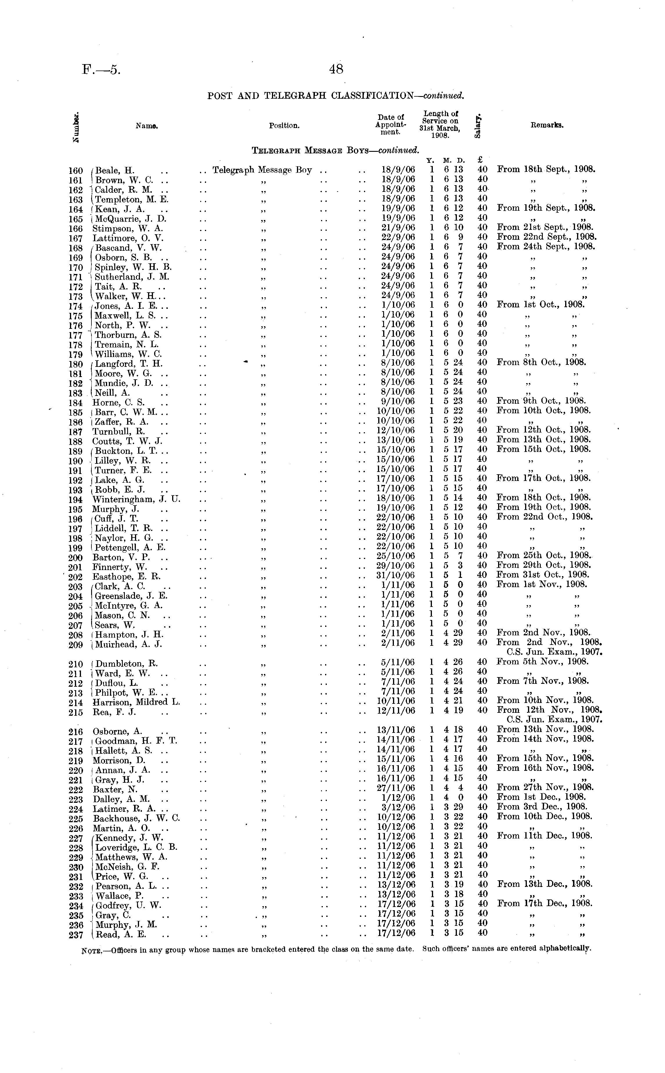 POST AND TELEGRAPH CLASSIFICATION— continued. si Tiite of Length of ~ 3 Date 01 s erv i c> , on fc | Name. Position. Appoint- 81 S Remarks. | ment - 1908. ' £ Telegbaph Message Boys— continued. Y. M. D. £ 160 (Beale, H. .. .. Telegraph Message Boy .. .. 18/9/06 1 613 40 From 18th Sept., 1908. 161 I Brown, W. C „ .. .. 18/9/06 1 613 40 162 1 Calder, R. M. .. .. „ 18/9/06 1 613 40 163 (Templeton, M. E. . . „ .. .. 18/9/06 1 613 40 164 (Kean, J. A. .. .. „ .. .. 19/9/00 1 612 40 From 19th Sept., 1908. 165 I McQuarrie, J. D. .. „ .. .. 19/9/06 1 612 40 166 Stimpson, W. A. .. „ .. .. 21/9/06 1 610 40 From 21st Sept., 1908. 167 Lattimore, O. V. .. „ .. .. 22/9/06 1 6 9 40 From 22nd Sept., 1908. 168 /Bascand, V. W. .. „ .. • • 24/9/06 1 6 7 40 From 24th Sept., 1908. 169 Osborn, S. B „ .. .. 24/9/06 1 6 7 40 170 ! Spinley, W. H. B. .. „ .. . . 24/9/06 16 7 40 171 " Sutherland, J. M. .. „ .. .. 24/9/06 1 6 7 40 172 I Tait, A. R. .. .. ~ .. .. 24/9/06 1 6 7 40 173 \, Walker, W. H... .. „ .. .. 24/9/06 16 7 40 174 /Jones, A. I. E. .. .. „ .. .. 1/10/06 1 6 0 40 From Ist Oct., 1908. 175 Maxwell, L. S. .. .. „ .. .. 1/10/06 1 6 0 40 176 I North, P. W „ •. ■ • 1/10/06 1 6 0 40 177 I Thorburn, A. S. .. „ .. .. 1/10/06 1 6 0 40 178 Tremain, N. L. .. „ .. .. 1/10/06 1 6 0 40 179 \ Williams, W. C. .. „ .. .. 1/10/06 1 6 0 40 180 (Langford, T. H. .. * „ .. .. 8/10/06 1 524 40 From Bth Oct., 1908. 181 Moore, W. G „ .. .. 8/10/06 1 524 40 182 Mundie, J. D „ .. .. 8/10/06 1 524 40 183 I Neill, A „ .. .. 8/10/06 1 524 40 184 Home C. S. .. .. „ .. .. 9/10/00 1 523 40 From Oth Oct., 1908. 185 I Barr C. W. M. .. . . „ .. .. 10/10/06 1 522 40 From 10th Oct., 1908. 186 I Zaffer, R. A „ .. .. 10/10/06 1 522 40 187 Turnbull R . .. „ . . .. 12/10/06 1 520 40 From 12th Oct., 1908. 188 Courts, T. W. J. . . „ .. • • 13/10/06 1 519 40 From 13th Oct., 1908. 189 (Buckton, L. T. .. .. „ .. .. 15/10/06 1 517 40 From 15th Oct., 1908. 190 ' Lilley, W. R ~ 15/10/06 1 517 40 191 Turner, FE „ .. .. 15/10/06 1 517 40 192 I Lake, A. G. .. .. „ .. •• 17/10/06 1 515 40 From 17th Oct., 1908. 193 ,Robb, E. J „ .. .. 17/10/06 1 515 40 194 Winteringham, J. U. .. „ .. .. 18/10/06 1 514 40 From 18th Oct., 1908. 195 Murphy J. .. „ .... 19/10/06 I 512 40 From 19th Oct., 1908. 196 (Cuff J T .. „ .... 22/10/06 1 510 40 From 22nd Oct., 1908. 197 'Liddell, T. R „ .. .. 22/10/06 1 510 40 198 iNaylor, H. G. .. .. „ .. .. 22/10/06 1 510 40 199 I Pettengell, A. E. .. „ .. .. 22/10/06 1 510 40 200 Barton V. P. .. ... „ .. • • 25/10/06 1 5 7 40 From 25th Oct., 1908. 201 Finnerty W. .. . . „ •. • ■ 29/10/06 1 5 3 40 From 29th Oct., 1908. 202 Easthope, E. R. .. „ .. .. 31/10/06 1 5 1 40 From 31st Oct., 1908. 203 (Clark, A. C. .. .. „ . • • • 1/11/06 1 5 0 40 From Ist Nov., 1908. 204 Greenslade, J. E. .. „ .. .. 1/11/06 1 5 0 40 205 Mclntyre, G. A. .. „ .. .. 1/11/06 1 5 0 40 206 Mason, C. N „ .. •■ 1/11/06 1 5 0 40 207 (Sears, W „ •• •■ 1/11/06 1 5 0 40 208 (Hampton, J. H. .. „ .. .. 2/11/06 1 429 40 From 2nd Nov., 1908. 209 I Muirhead, A. J. .. „ .. .. 2/11/06 1 429 40 From 2nd Nov., 1908. 1 C.S. Jun. Exam., 1907, 210 (Dumbleton, R. .. „ .. .. 5/11/06 1 426 40 From sth Nov., 1908. 211 "I Ward, E. W „ .. •• 5/11/06 1 426 40 212 (Duflou L .. .. „ .. •• 7/11/06 1 424 40 From 7th Nov., 1908. 213 iPhilpot, W. E „ .. .. 7/11/06 1 424 40 214 Harrison, Mildred L. „ .. .. 10/11/06 1 421 40 From 10th Nov., 1908. 215 Rea F J .. „ .. • • 12/11/06 1 419 40 From 12th Nov., 1908. C.S. Jun. Exam., 1907. 216 Osborne, A. .. .. „ .. .. 13/11/06 1 418 40 From 13th Nov., 1908. 217 i Goodman, H. F. T. .. „ .. .. 14/11/06 1 417 40 From 14th Nov., 1908. 218 "iHallett, A. S „ .. .. 14/11/06 1 417 40 219 Morrison D . . „ .. .. 15/11/06 1 416 40 From 15th Nov., 1908. 220 I Annan J. A. .. . . „ .. .. 16/11/06 1 415 40 From 16th Nov., 1908. 221 I Gray, H. J „ .. .. 16/11/06 14 15 40 222 Baxter N .. .. „ ■ • • ■ 27/11/00 1 4 4 40 From 27th Nov., 1908. 223 Dalley'A. M. .. .. „ .. .. 1/12/06 1 4 0 40 From Ist Dec, 1908. 224 Latimer, R. A „ .. .. 3/12/06 1 329 40 From 3rd Dec, 1908. 225 Backhouse, J. W. C. .. „ .. .. 10/12/06 1 322 40 From 10th Dec, 1908. 226 Martin, A. O * „ .. • • 10/12/06 1 322 40 227 /Kennedy J. W. .. „ . • • • 11/12/06 1 321 40 From 11th Dec, 1908. 228 Loveridge, L. C. B. .. „ .. .. 11/12/06 1 321 40 229 Matthews, W. A. .. „ .. .. 11/12/06 1 321 40 230 McNeish, G. F. .. „ .. .. 11/12/06 1 321 40 231 IPrice, W. G „ .. .. 11/12/06 1 321 40 232 I Pearson, A. L. .. .. „ .. .. 13/12/06 1 319 40 From 13th Dec, 1908. 233 I Wallace, P „ .. .. 13/12/06 1 318 40 234 i Godfrey UW. .. „ • • • ■ 17/12/06 1 315 40 From 17th Dec, 1908. 235 ! Gray, C . „ .. .. 17/12/06 13 15 40 236 1 Murphy, J. M. .. „ .. .. 17/12/06 1 315 40 237 (Read, A. E „ .. .. 17/12/06 1 315 40 Note. Officers in any group whose names are bracketed entered the class on the same date. Such officers' names are entered alphabetically.