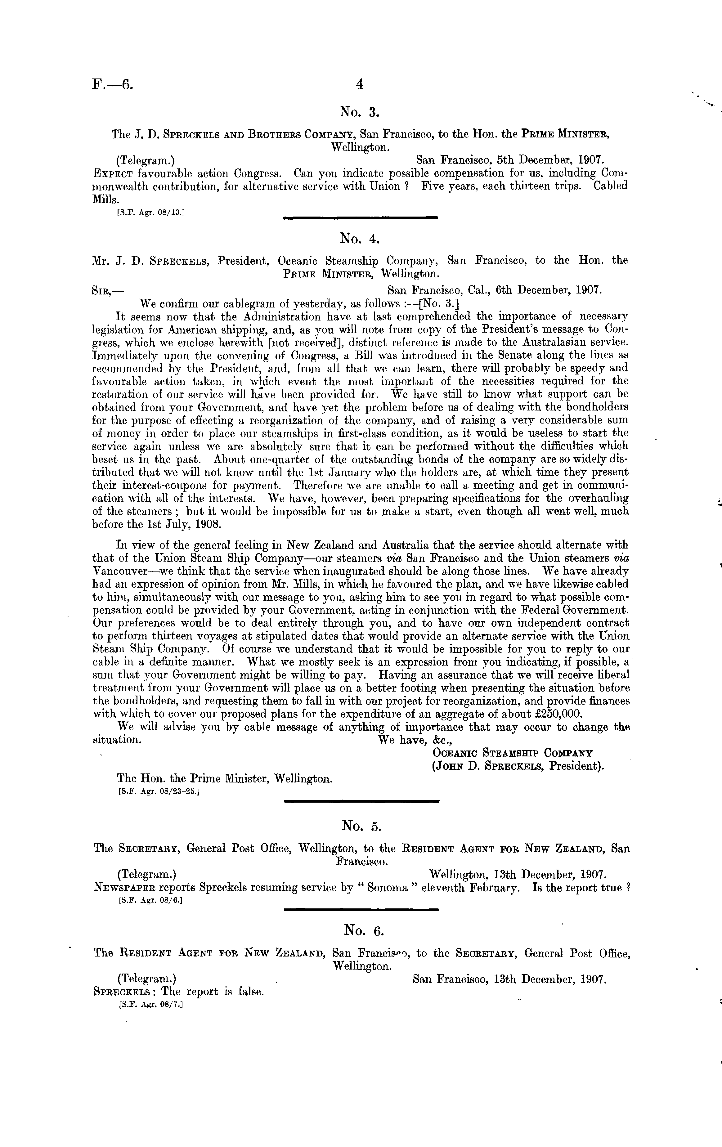 No. 6. The Resident Agent for New Zealand, San Francisco, to the Secretary, General Post Office, Wellington. (Telegram.) . San Francisco, 13th December, 1907. Spreckels : The report is false. [S.F. Agr. 08/7.]
