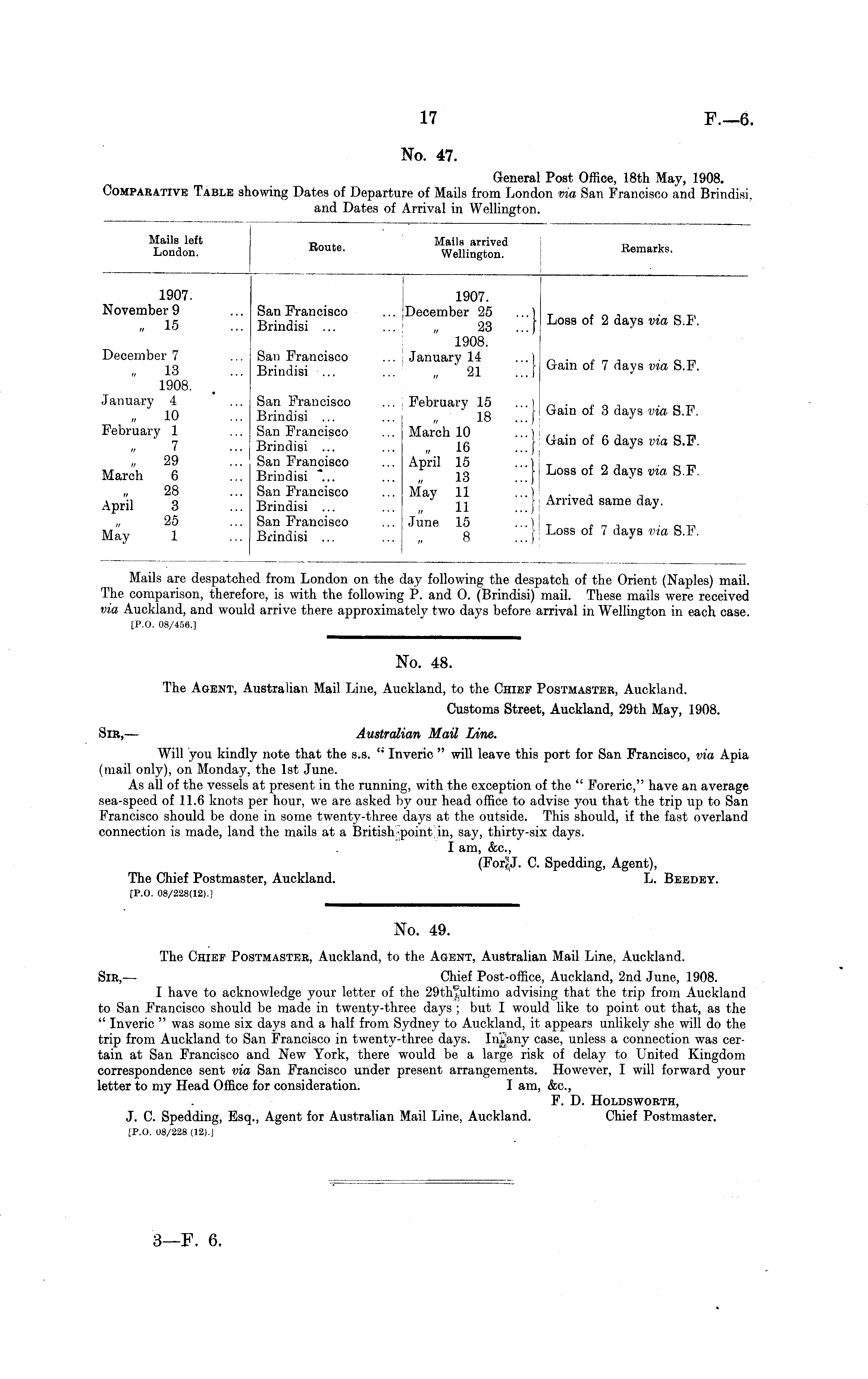 No. 49. The Chief Postmaster, Auckland, to the Agent, Australian Mail Line, Auckland. Sir, — Chief Post-office, Auckland, 2nd June, 1908. I have to acknowledge your letter of the 29th|ultimo advising that the trip from Auckland to San Francisco should be made in twenty-three days ; but I would like to point out that, as the " Inveric " was some six days and a half from Sydney to Auckland, it appears unlikely she will do the trip from Auckland to San Francisco in twenty-three days. Ini|any case, unless a connection was certain at San Francisco and New York, there would be a large risk of delay to United Kingdom correspondence sent via San Francisco under present arrangements. However, I will forward your letter to my Head Office for consideration. I am, &c, F. D. HOLDSWORTH, J. C. Spedding, Esq., Agent for Australian Mail Line, Auckland. Chief Postmaster. [P.O. 08/228 (12).]