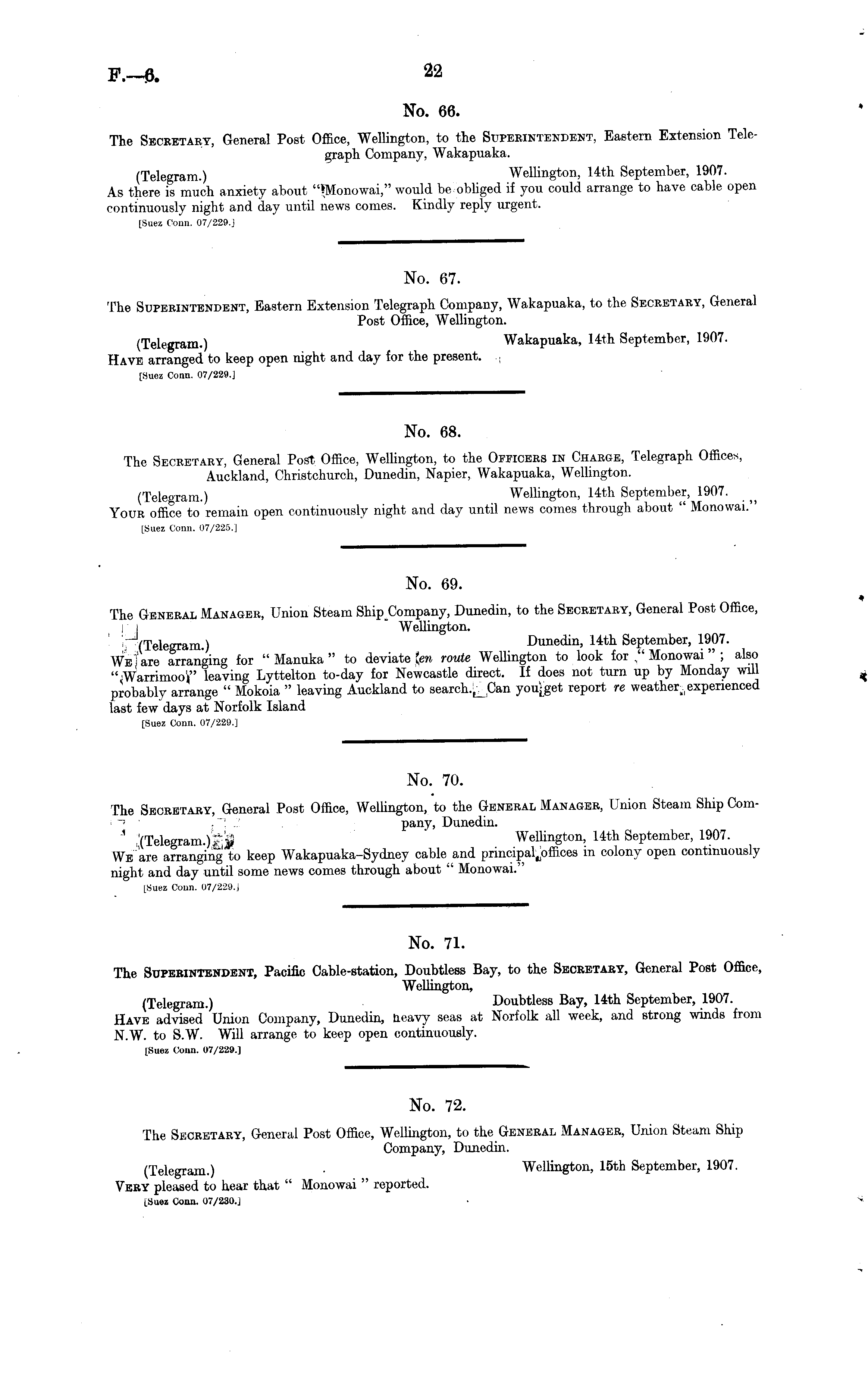 No. 66. The Secretary, General Post Office, Wellington, to the Superintendent, Eastern Extension Telegraph Company, Wakapuaka. (Telegram.) Wellington, 14th September, 1907. As there is much anxiety about "*Monowai," would be obliged if you could arrange to have cable open continuously night and day until news comes. Kindly reply urgent. [Suez Conn. 07/229.J