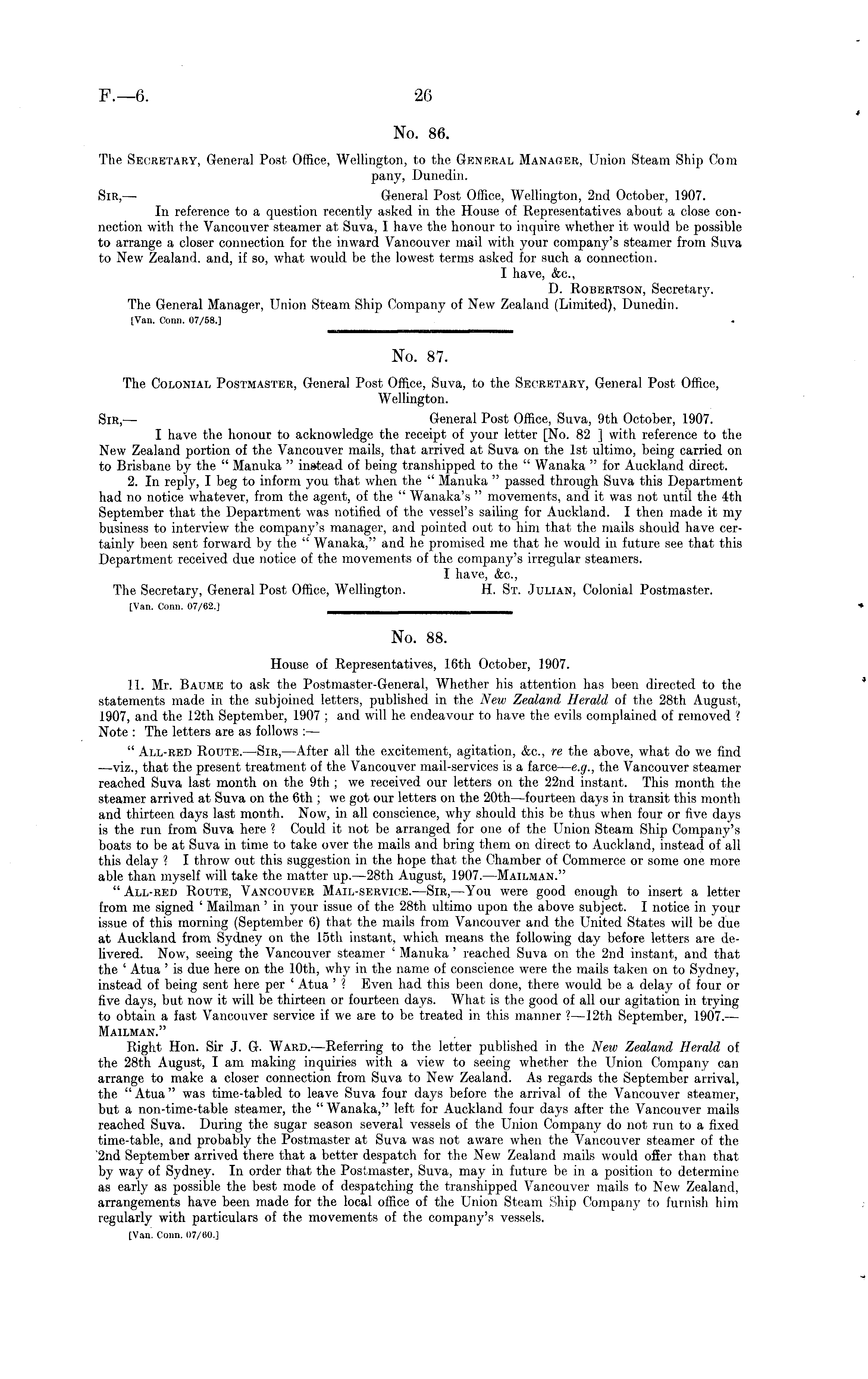 No. 86. The Secretary, General Post Office, Wellington, to the General Manager, Union Steam Ship Com pany, Dunedin. Sir, — General Post Office, Wellington, 2nd October, 1907. In reference to a question recently asked in the House of Representatives about a close connection with the Vancouver steamer at Suva, I have the honour to inquire whether it would be possible to arrange a closer connection for the inward Vancouver mail with your company's steamer from Suva to New Zealand, and, if so, what would be the lowest terms asked for such a connection. I have, &c, D. Robertson, Secretary. The General Manager, Union Steam Ship Company of New Zealand (Limited), Dunedin. [Van. Conn. 07/58.]