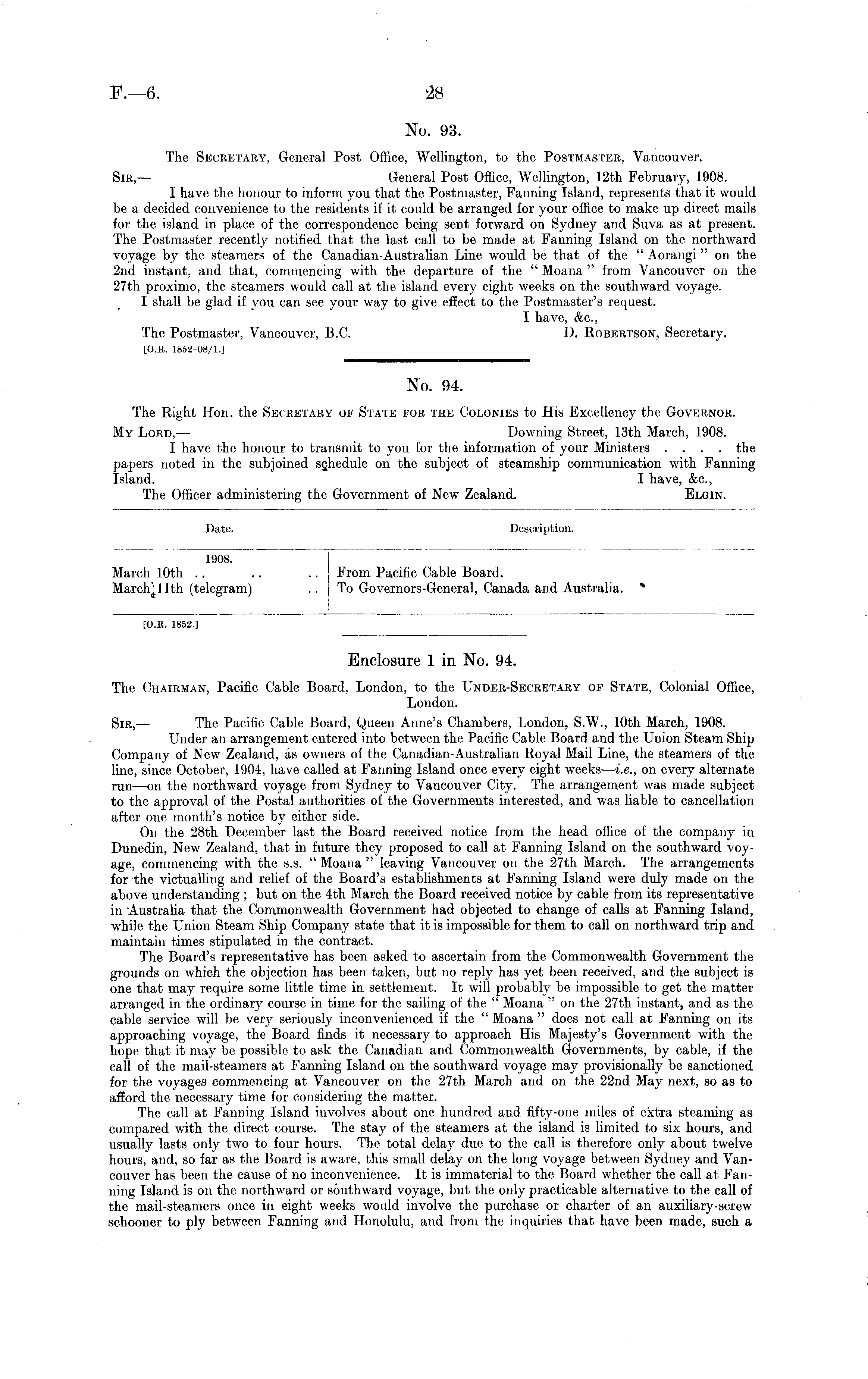 Enclosure 1 in No. 94. The Chairman, Pacific Cable Board, London, to the Under-Secretary of State, Colonial Office, London. Sir, — The Pacific Cable Board, Queen Anne's Chambers, London, S.W., 10th March, 1908. Under an arrangement entered into between the Pacific Cable Board and the Union Steam Ship Company of New Zealand, as owners of the Canadian-Australian Royal Mail Line, the steamers of the line, since October, 1904, have called at Fanning Island once every eight weeks — i.e., on every alternate run —on the northward voyage from Sydney to Vancouver City. The arrangement was made subject to the approval of the Postal authorities of the Governments interested, and was liable to cancellation after one month's notice by either side. On the 28th December last the Board received notice from the head office of the company in Dunedin, New Zealand, that in future they proposed to call at Fanning Island on the southward voyage, commencing with the s.s. " Moana " leaving Vancouver on the 27th March. The arrangements for the victualling and relief of the Board's establishments at Fanning Island were duly made on the above understanding ; but on the 4th March the Board received notice by cable from its representative in Australia that the Commonwealth Government had objected to change of calls at Fanning Island, while the Union Steam Ship Company state that it is impossible for them to call on northward trip and maintain times stipulated in the contract. The Board's representative has been asked to ascertain from the Commonwealth Government the grounds on which the objection has been taken, but no reply has yet been received, and the subject is one that may require some little time in settlement. It will probably be impossible to get the matter arranged in the ordinary course in time for the sailing of the " Moana " on the 27th instant, and as the cable service will be very seriously inconvenienced if the " Moana " does not call at Fanning on its approaching voyage, the Board finds it necessary to approach His Majesty's Government with the hope that it may be possible to ask the Canadian and Commonwealth Governments, by cable, if the call of the mail-steamers at Fanning Island on the southward voyage may provisionally be sanctioned for the voyages commencing at Vancouver on the 27th March and on the 22nd May next, so as to afford the necessary time for considering the matter. The call at Fanning Island involves about one hundred and fifty-one miles of extra steaming as compared with the direct course. The stay of the steamers at the island is limited to six hours, and usually lasts only two to four hours. The total delay due to the call is therefore only about twelve hours, and, so far as the Board is aware, this small delay on the long voyage between Sydney and Vancouver has been the cause of no inconvenience. It is immaterial to the Board whether the call at Fanning Island is on the northward or southward voyage, but the only practicable alternative to the call of the mail-steamers once in eight weeks would involve the purchase or charter of an auxiliary-screw schooner to ply between Fanning and Honolulu, and from the inquiries that have been made, such a