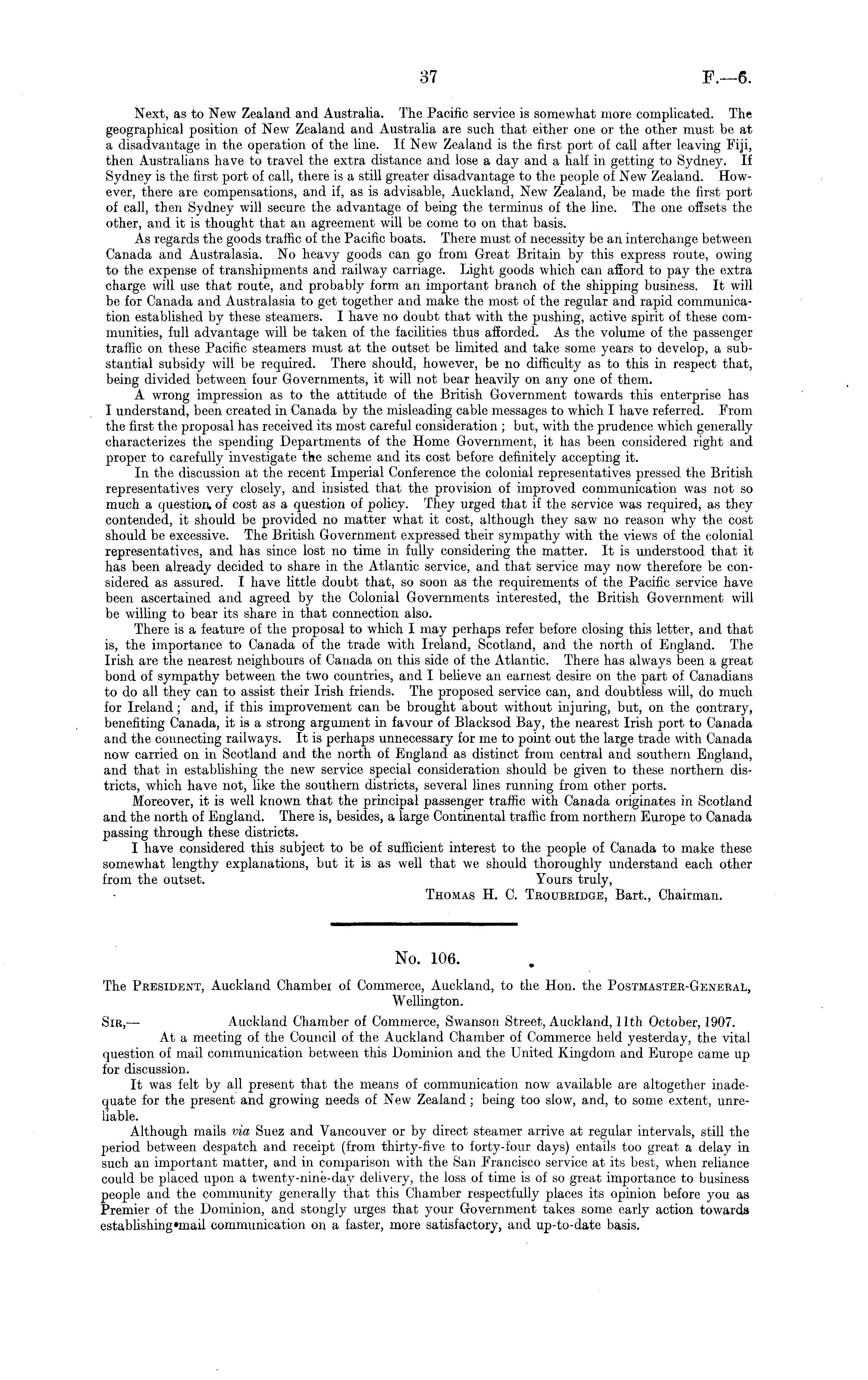 No. 106. The President, Auckland Chamber of Commerce, Auckland, to the Hon. the Postmaster-General, Wellington. Sir, — Auckland Chamber of Commerce, Swanson Street, Auckland, 11th October, 1907. At a meeting of the Council of the Auckland Chamber of Commerce held yesterday, the vital question of mail communication between this Dominion and the United Kingdom and Europe came up for discussion. It was felt by all present that the means of communication now available are altogether inadequate for the present and growing needs of New Zealand; being too slow, and, to some extent, unreliable. Although mails via Suez and Vancouver or by direct steamer arrive at regular intervals, still the period between despatch and receipt (from thirty-five to forty-four days) entails too great a delay in such an important matter, and in comparison with the San Francisco service at its best, when reliance could be placed upon a twenty-nine-day delivery, the loss of time is of so great importance to business people and the community generally that this Chamber respectfully places its opinion before you as Premier of the Dominion, and stongly urges that your Government takes some early action towards establishing»mail communication on a faster, more satisfactory, and up-to-date basis.