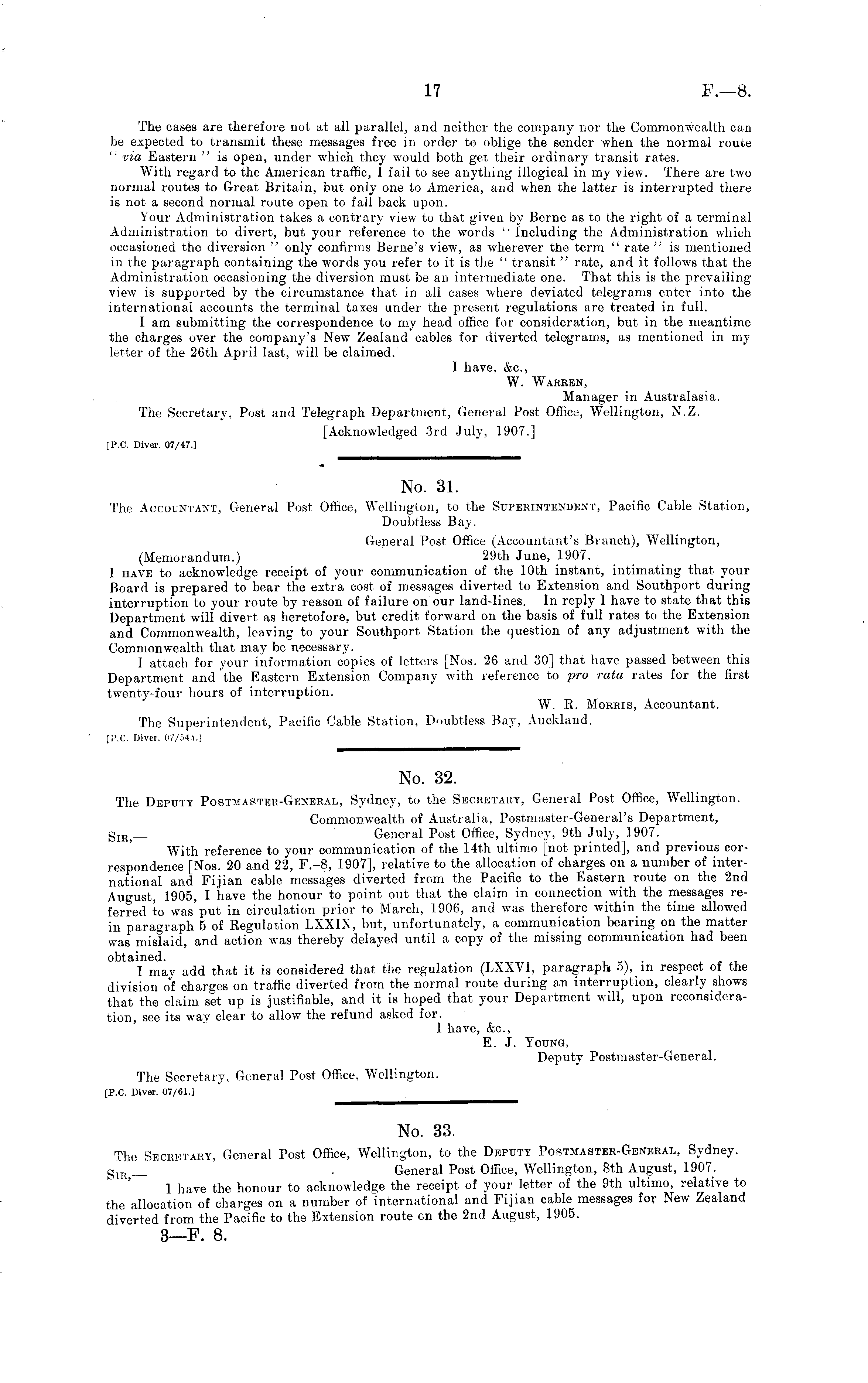 No. 31. The Accountant, General Post Office, Wellington, to the Superintendent, Pacific Cable Station, Doubtless Bay. General Post Office (Accountant's Branch), Wellington, (Memorandum.) 29th June, 1907. I have to acknowledge receipt of your communication of the 10th instant, intimating that your Board is prepared to bear the extra cost of messages diverted to Extension and Southport during interruption to your route by reason of failure on our land-lines. In reply I have to state that this Department will divert as heretofore, but credit forward on the basis of full rates to the Extension and Commonwealth, leaving to your Southport Station the question of any adjustment with the Commonwealth that may be necessary. I attach for your information copies of letters [Nos. 26 and 30] that have passed between this Department and the Eastern Extension Company with reference to pro rata rates for the first twenty-four hours of interruption. W. R. Morris, Accountant. The Superintendent, Pacific Cable Station, Doubtless Bay, Auckland. [P.C. Diver. 07/54 A.]