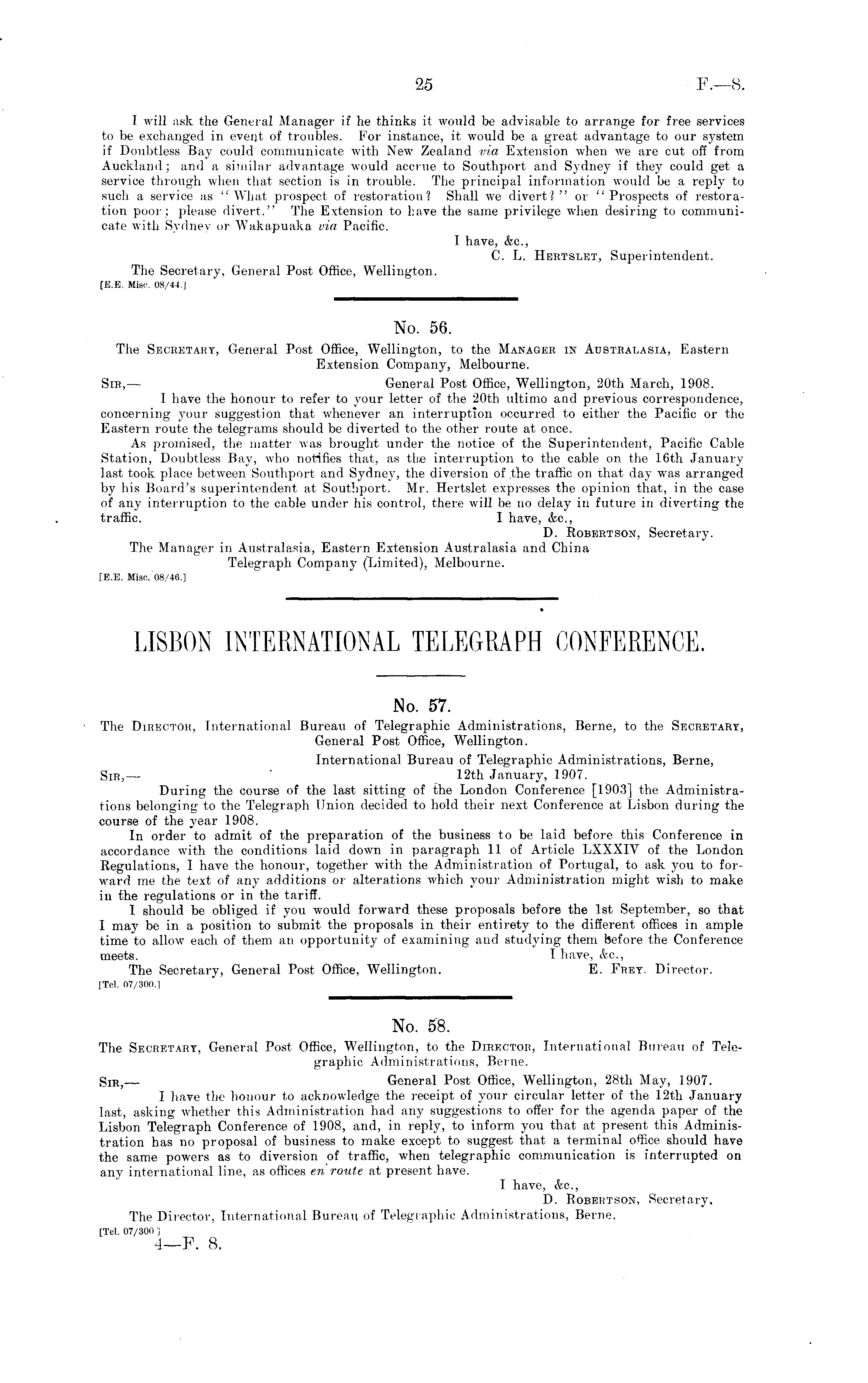 No. 58. The Secretary, General Post Office, Wellington, to the Director, International Bureau of Telegraphic Administrations, Berne. Sir,— General Post Office, Wellington, 28th May, 1907. I have the honour to acknowledge the receipt of your circular letter of the 12th January last, asking whether this Administration bad any suggestions to offer for the agenda paper of the Lisbon Telegraph Conference of 1908, and, in reply, to inform you that at present this Administration has no proposal of business to make except to suggest that a terminal office should have the same powers as to diversion of traffic, when telegraphic communication is interrupted on any international line, as offices en route at present have. I have, Ac, D. Robertson, Secretary. The Director, International Bureau of Telegraphic Administrations, Berne.