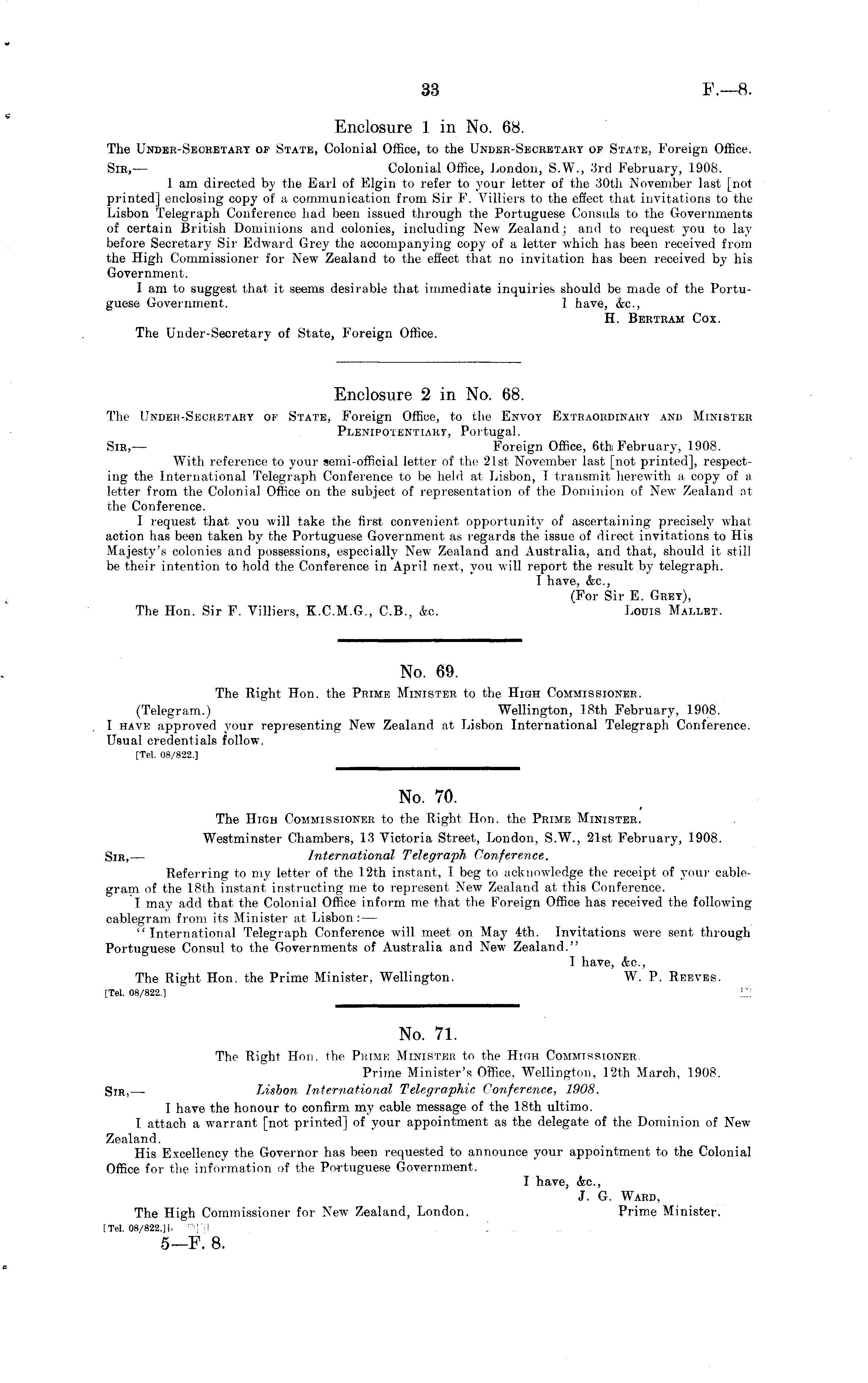 Enclosure 1 in No. 68. The Under-Secretary of State, Colonial Office, to the Under-Secretary of State, Foreign Office. Sir, — Colonial Office, London, S.W., 3rd February, 1908. 1 am directed by the Earl of Elgin to refer to your letter of the 30th November last [not printed] enclosing copy of a communication from Sir F. Villiers to the effect that invitations to the Lisbon Telegraph Conference had been issued through the Portuguese Consuls to the Governments of certain British Dominions and colonies, including New Zealand; and to request you to lay before Secretary Sir Edward Grey the accompanying copy of a letter which has been received from the High Commissioner for New Zealand to the effect that no invitation has been received by his Government. I am to suggest that it seems desirable that immediate inquiries should be made of the Portuguese Government. I have, Ac, H. Bertram Cox. The Under-Secretary of State, Foreign Office. Enclosure 2 in No. 68. The Under-Secretary of State, Foreign Office, to the Envoy Extraordinary and Minister Plenipotentiary, Portugal. Sir,— Foreign Office, 6th February, 1908. With reference to your semi-official letter of the 21st November last [not printed], respecting the International Telegraph Conference to be held at Lisbon, I transmit herewith a copy of a letter from the Colonial Office on the subject of representation of the Dominion of New Zealand .it the Conference. I request that you will take the first convenient opportunity of ascertaining precisely what action has been taken by the Portuguese Government as regards the issue of direct invitations to His Majesty's colonies and possessions, especially New Zealand and Australia, and that, should it still be their intention to hold the Conference in April next, you will report the result by telegraph. I have, Ac, (For Sir E. Grey), The Hon. Sir F. Villiers, K.C.M.G., C.8., Ac. Louis Mallet.