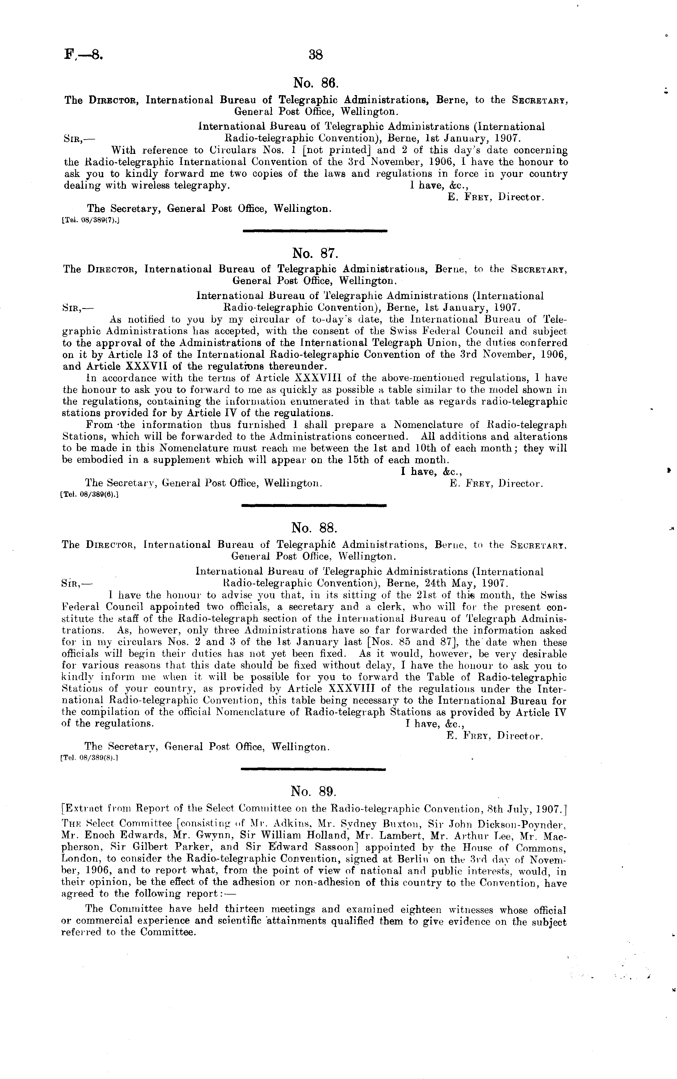 No. 86. The Director, International Bureau of Telegraphic Administrations, Berne, to the Secretary, General Post Office, Wellington. International Bureau of Telegraphic Administrations (International Sir, — Radio-telegraphic Convention), Berne, Ist January, 1907. With reference to Circulars Nos. 1 [not printed] and 2 of this day's date concerning the Radio-telegraphic International Convention of the 3rd November, 1906, I have the honour to ask you to kindly forward me two copies of the laws and regulations in force in your country dealing with wireless telegraphy. I have, Ac, E. Frey, Director. The Secretary, General Post Office, Wellington. [Tel. 08/389(7).]