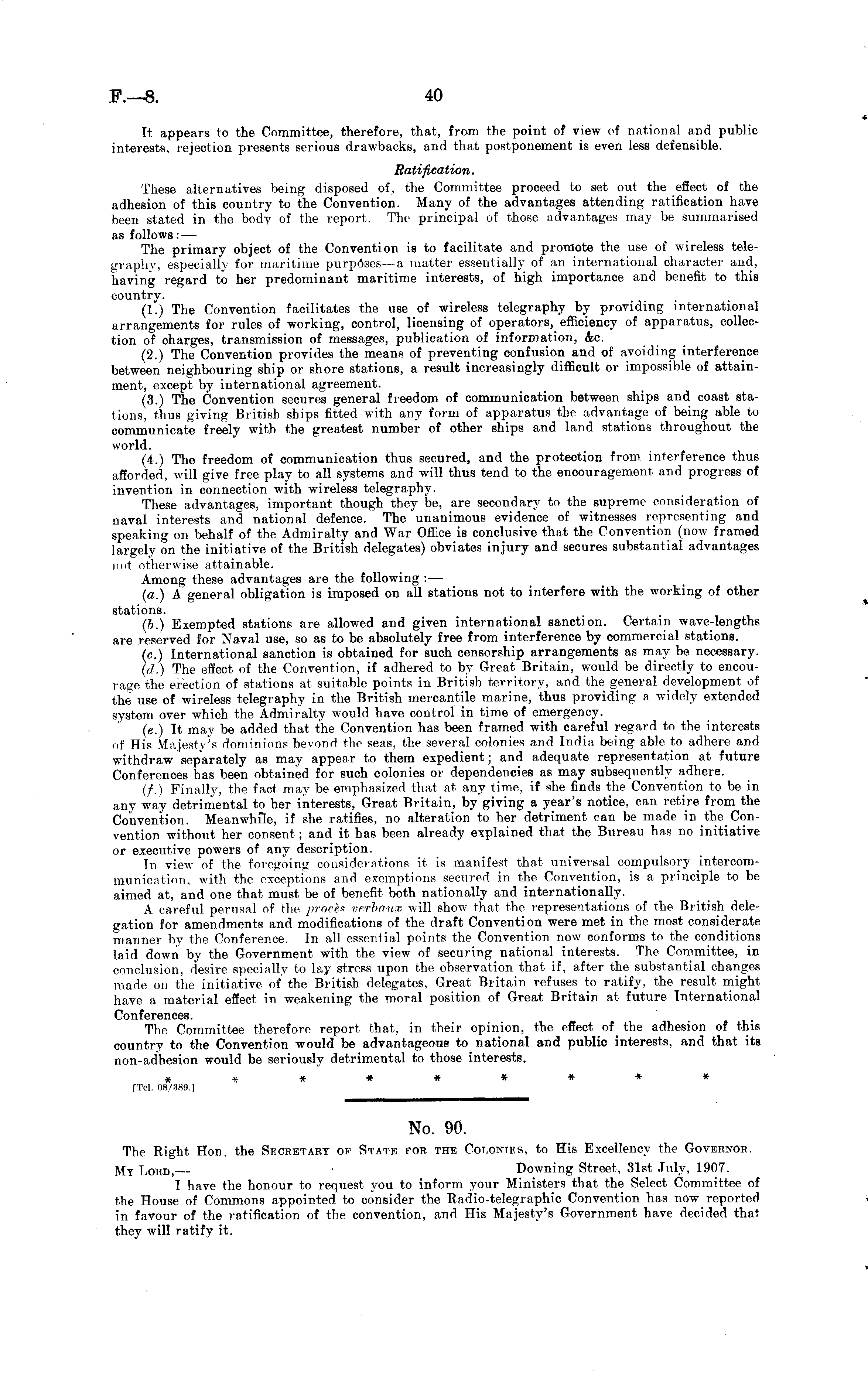 No. 90. The Right Hon. the Secretary of State for the Colonies, to His Excellency the Governor. My Lord, Downing Street, 31st July, 1907. T have the honour to request you to inform your Ministers that the Select Committee of the House of Commons appointed to consider the Radio-telegraphic Convention has now reported in favour of the ratification of the convention, and His Majesty's Government have decided that they will ratify it.