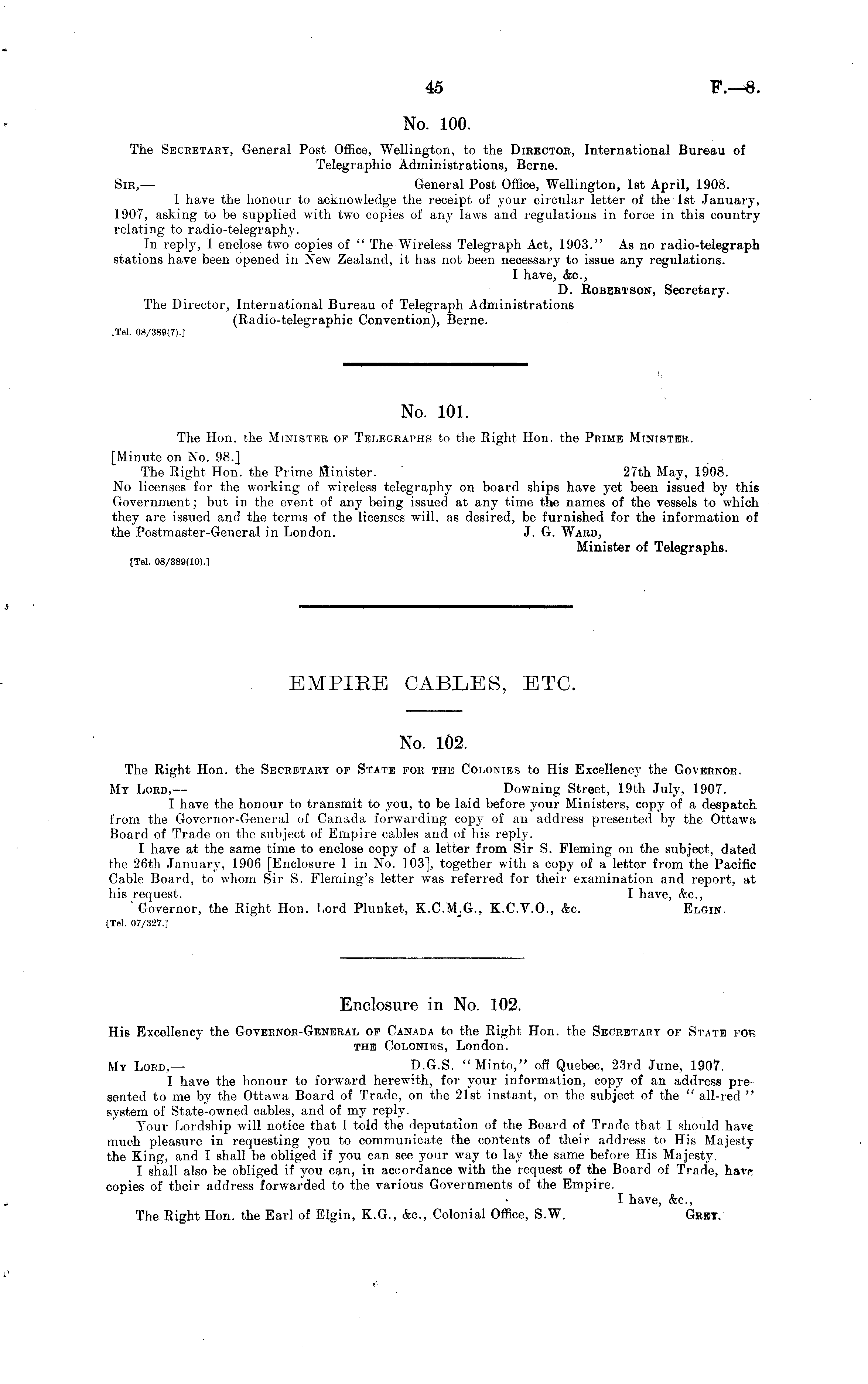 EMPIRE CABLES, ETC. No. 102. The Right Hon. the Secretary of State for the Colonies to His Excellency the Governor. My Lord, — Downing Street, 19th July, 1907. I have the honour to transmit to you, to be laid before your Ministers, copy of a despatch. from the Governor-General of Canada forwarding copy of an address presented by the Ottawa Board of Trade on the subject of Empire cables and of his reply. I have at the same time to enclose copy of a letter from Sir S. Fleming on the subject, dated the 26th January, 1906 [Enclosure 1 in No. 103], together with a copy of a letter from the Pacific Cable Board, to whom Sir S. Fleming's letter was referred for their examination and report, at his request. I have, Ac, " Governor, the Right Hon. Lord Plunket, K.C.M.G., X.C.V.0., Ac. Elgin, [Tel. 07/327.]