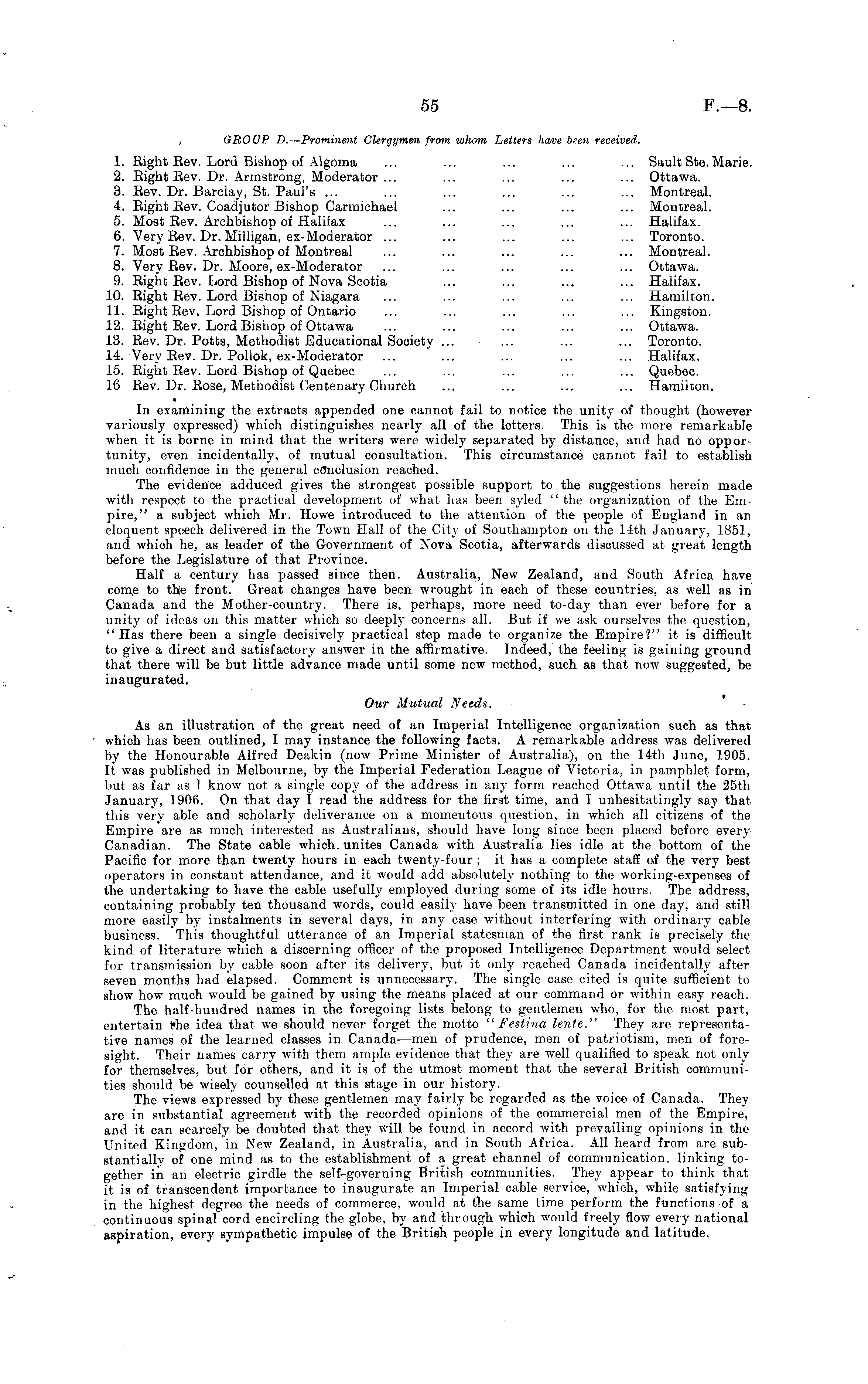 , GROUP D. — Prominent Clergymen from whom Letters have been received. 1. Right Rev. Lord Bishop of Algoma ... ... ... ... ... Sault Ste. Marie. 2. Right Rev. Dr. Armstrong, Moderator ... ... ... ... ... Ottawa. 3. Rev. Dr. Barclay, St. Paul's ... ... ... ... ... ... Montreal. 4. Right Rev. Coadjutor Bishop Carmichael ... ... ... ... Montreal. 5. Most Rev. Archbishop of Halifax ... ... ... ... ... Halifax. 6. Very Rev. Dr. Milligan, ex-Moderator ... ... ... ... ... Toronto. 7. Most Rev. Archbishop of Montreal ... ... ... ... ... Montreal. 8. Very Rev. Dr. Moore, ex-Moderator ... ... ... ... ... Ottawa. 9. Right Rev. Lord Bishop of Nova Scotia ... ... ... ... Halifax. 10. Right Rev. Lord Bishop of Niagara ... ... ... ... ... Hamilton. 11. Right Rev. Lord Bishop of Ontario ... ... ... ... ... Kingston. 12. Bight Rev. Lord Bisiiop of Ottawa ... ... ... ... ... Ottawa. 13. Rev. Dr. Potts, Methodist Educational Society ... ... ... ... Toronto. 14. Very Rev. Dr. Pollok, ex-Moderator ... ... ... ... ... Halifax. 15. Right Rev. Lord Bishop of Quebec ... ... ... ... ... Quebec. 16 Rev. Dr. Rose, Methodist Centenary Church ... ... ... ... Hamilton. In examining the extracts appended one cannot fail to notice the unity of thought (how r ever variously expressed) which distinguishes nearly all of the letters. This is the more remarkable when it is borne in mind that the writers were widely separated by distance, and had no opportunity, even incidentally, of mutual consultation. This circumstance cannot fail to establish much confidence in the general conclusion reached. The evidence adduced gives the strongest possible support to the suggestions herein made with respect to the practical development of what has been syled " the organization of the Empire," a subject which Mr. Howe introduced to the attention of the people of England in an eloquent speech delivered in the Town Hall of the City of Southampton on the 14th January, 1851, and which he, as leader of the Government of Nova Scotia, afterwards discussed at great length before the Legislature of that Province. Half a century has passed since then. Australia, New Zealand, and South Africa have come to thle front. Great changes have been wrought in each of these countries, as well as in Canada and the Mother-country. There is, perhaps, more need to-da}' than ever before for a unity of ideas on this matter which so deeply concerns all. But if we ask ourselves the question, "Has there been a single decisively practical step made to organize the Empire?" it is difficult to give a direct and satisfactory answer in the affirmative. Indeed, the feeling is gaining ground that there will be but little advance made until some new method, such as that now suggested, be inaugurated. Our Mutual Needs. As an illustration of the great need of an Imperial Intelligence organization such as that which has been outlined, I may instance the following facts. A remarkable address was delivered by the Honourable Alfred Deakin (now Prime Minister of Australia), on the 14th June, 1905. It was published in Melbourne, by the Imperial Federation League of Victoria, in pamphlet form, but as far as I know not a single copy of the address in am' form reached Ottawa until the 25th January, 1906. On that day I read the address for the first time, and I unhesitatingly say that this very able and scholarly deliverance on a momentous question, in which all citizens of the Empire are as much interested as Australians, should have long since been placed before every Canadian. The State cable which, unites Canada with Australia lies idle at the bottom of the Pacific for more than twenty hours in each twenty-four ; it has a complete staff of the very best operators in constant attendance, and it would add absolutely nothing to the working-expenses of the undertaking to have the cable usefully employed during some of its idle hours. The address, containing probably ten thousand words, could easily have been transmitted in one day, and still more easily by instalments in several days, in any case without interfering with ordinary cable business. This thoughtful utterance of an Imperial statesman of the first rank is precisely the kind of literature which a discerning officer of the proposed Intelligence Department would select for transmission by cable soon after its delivery, but it only reached Canada incidentally after seven months had elapsed. Comment is unnecessary. The single case cited is quite sufficient to show how much would be gained by using the means placed at our command or within easy reach. The half-hundred names in the foregoing lists belong to gentlemen who, for the most part, entertain ¥he idea that we should never forget the motto " Festina lente." They are representative names of the learned classes in Canada—men of prudence, men of patriotism, men of foresight. Their names carry with them ample evidence that they are well qualified to speak not only for themselves, but for others, and it is of the utmost moment that the several British communities should be wisely counselled at this stage in our history. The views expressed by these gentlemen may fairly be regarded as the voice of Canada. They are in substantial agreement with the recorded opinions of the commercial men of the Empire, and it can scarcely be doubted that they will be found in accord with prevailing opinions in the United Kingdom, in New Zealand, in Australia, and in South Africa. All heard from are substantially of one mind as to the establishment of a great channel of communication, linking together in an electric girdle the self-governing British communities. They appear to think that it is of transcendent importance to inaugurate an Imperial cable service, which, while satisfying in the highest degree the needs of commerce, would at the same time perform the functions of a continuous spinal cord encircling the globe, by and through which would freely flow every national aspiration, every sy