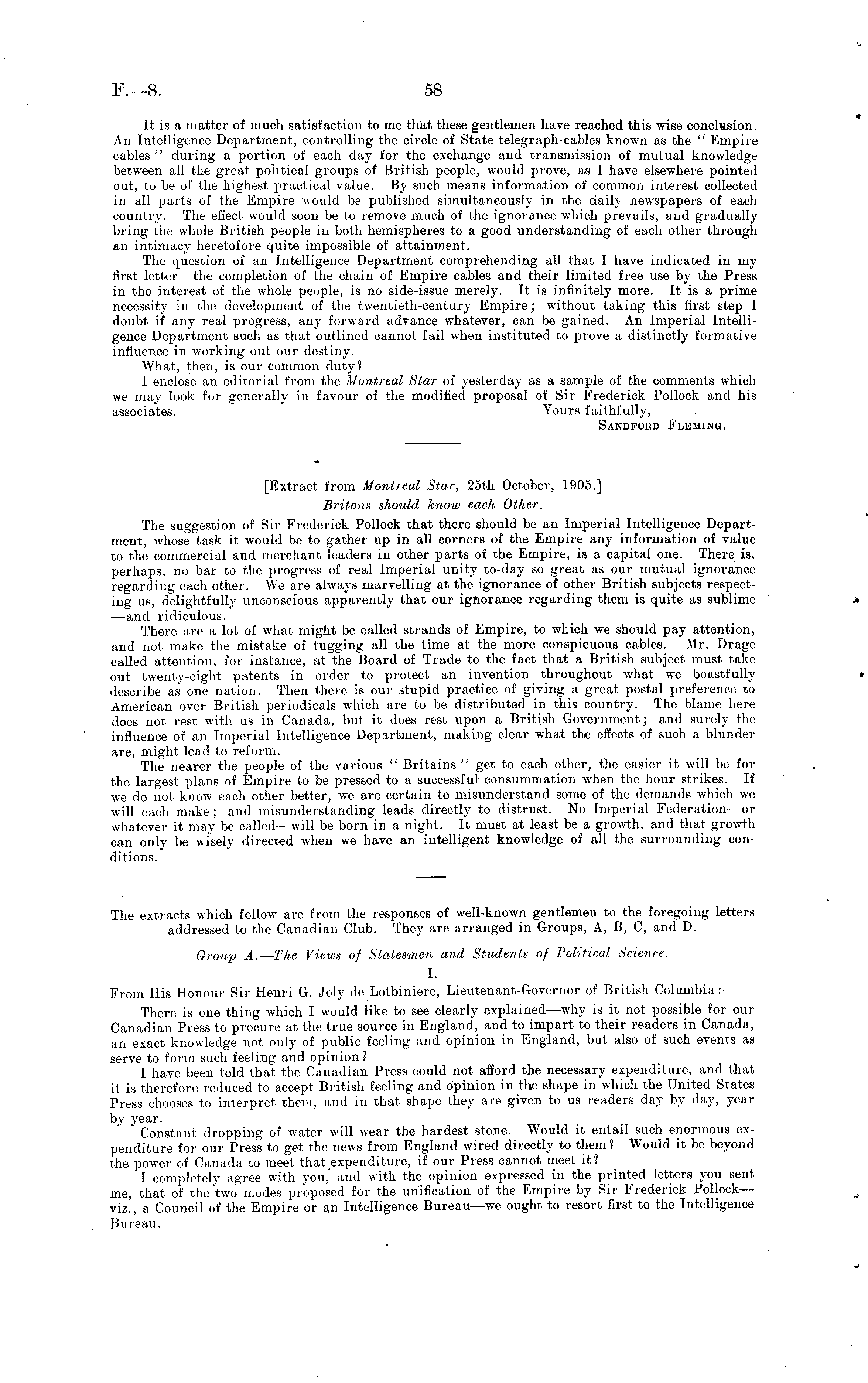 [Extract from Montreal Star, 25th October, 1905.] Britons should know each Other. The suggestion of Sir Frederick Pollock that there should be an Imperial Intelligence Department, whose task it would be to gather up in all corners of the Empire any information of value to the commercial and merchant leaders in other parts of the Empire, is a capital one. There is, perhaps, no bar to the progress of real Imperial unity to-day so great as our mutual ignorance regarding each other. We are always marvelling at the ignorance of other British subjects respecting us, delightfully unconscious apparently that our ignorance regarding them is quite as sublime — and ridiculous. There are a lot of what might be called strands of Empire, to which we should pay attention, and not make the mistake of tugging all the time at the more conspicuous cables. Mr. Drage called attention, for instance, at the Board of Trade to the fact that a British subject must take out twenty-eight patents in order to protect an invention throughout what we boastfully describe as one nation. Then there is our stupid practice of giving a great postal preference to American over British periodicals which are to be distributed in this country. The blame here does not rest with us in Canada, but it does rest upon a British Government; and surely the influence of an Imperial Intelligence Department, making clear what the effects of such a blunder are, might lead to reform. The nearer the people of the various " Britains " get to each other, the easier it will be for the largest plans of Empire to be pressed to a successful consummation when the hour strikes. If we do not know each other better, we are certain to misunderstand some of the demands which we will each make ; and misunderstanding leads directly to distrust. No Imperial Federation—or whatever it may be called —will be born in a night. It must at least be a growth, and that growth can only be wisely directed when we have an intelligent knowledge of all the surrounding conditions. The extracts which follow are from the responses of well-known gentlemen to the foregoing letters addressed to the Canadian Club. They are arranged in Groups, A, B, C, and D. Group A. — The Views of Statesmen and Students of Political Science. I. From His Honour Sir Henri G. Joly de Lotbiniere, Lieutenant-Governor of British Columbia: — There is one thing which I would like to see clearly explained —why is it not possible for our Canadian Press to procure at the true source in England, and to impart to their readers in Canada, an exact knowledge not only of public feeling and opinion in England, but also of such events as serve to form such feeling and opinion ? I have been told that the Canadian Press could not afford the necessary expenditure, and that it is therefore reduced to accept British feeling and opinion in the shape in which the United States Press chooses to interpret them, and in that shape they are given to us readers day by day, year by year. Constant dropping of water will wear the hardest stone. Would it entail such enormous expenditure for our Press to get the news from England wired directly to them ? Would it be beyond the power of Canada to meet that .expenditure, if our Press cannot meet it? I completely agree with you,' and with the opinion expressed in the printed letters you sent me, that of the two modes proposed for the unification of the Empire by Sir Frederick Pollock— viz., a Council of the Empire or an Intelligence Bureau—we ought to resort first to the Intelligence Bureau.