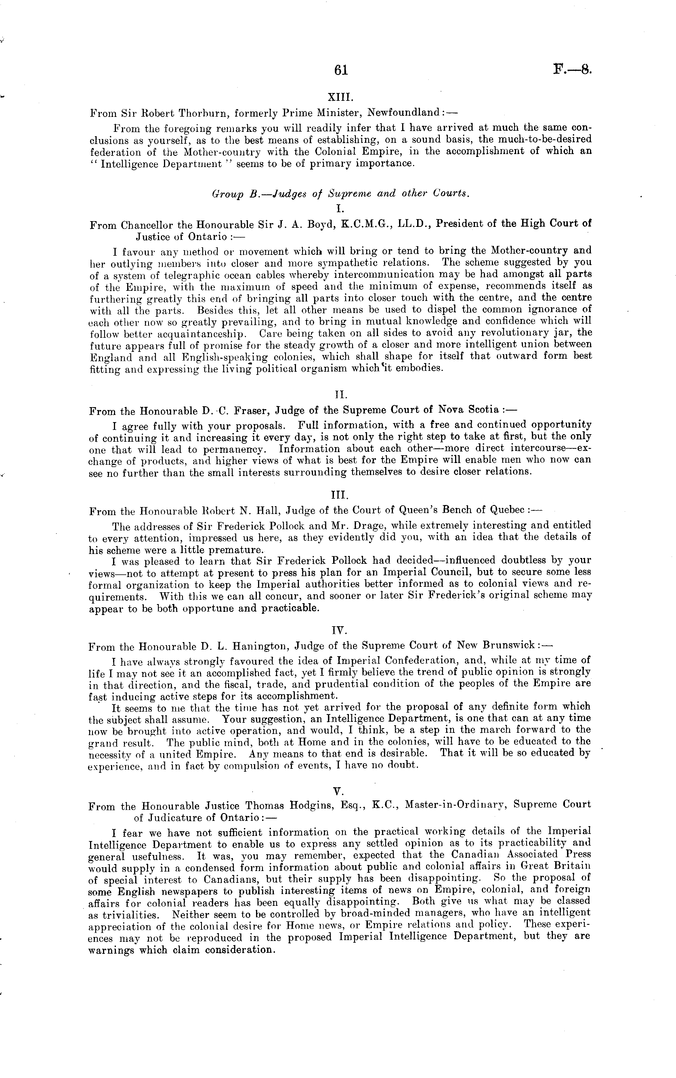 XIII. From Sir Robert Thorburn, formerly Prime Minister, Newfoundland: — From the foregoing remarks you will readily infer that I have arrived at much the same conclusions as yourself, as to the best means of establishing, on a sound basis, the much-to-be-desired federation of the Mother-country with the Colonial Empire, in the accomplishment of which an " Intelligence Department " seems to be of primary importance. Group B. — Judges of Supreme and other Courts. I. From Chancellor the Honourable Sir J. A. Boyd, K.C.M.G., LL.D., President of the High Court of Justice of Ontario :— I favour any method or movement which will bring or tend to bring the Mother-country and her outlying members into closer and more sympathetic relations. The scheme suggested by you of a system of telegraphic ocean cables whereby intercommunication may be had amongst all parts of the Empire, with the maximum of speed and the minimum of expense, recommends itself as furthering greatly this end of bringing all parts into closer touch with the centre, and the centre with all the parts. Besides this, let all other means be used to dispel the common ignorance of each other now so greatly prevailing, and to bring in mutual knowledge and confidence which will follow better acquaintanceship. Care being taken on all sides to avoid any revolutionary jar, the future appears full of promise for the steady growth of a closer and more intelligent union between England ami all English-speaking colonies, which shall shape for itself that outward form best fitting and expressing the living political organism which'it embodies. 11. From the Honourable D. C. Fraser, Judge of the Supreme Court of Nova Scotia : — I agree fully with your proposals. Full information, with a free and continued opportunity of continuing it and increasing it every day, is not only the right step to take at first, but the only one that will lead to permanency. Information about each other—more direct intercourse —exchange of products, and higher views of what is best for the Empire will enable men who now can see no further than the small interests surrounding themselves to desire closer relations. 111. From the Honourable Robert N. Hall, Judge of the Court of Queen's Bench of Quebec : — The addresses of Sir Frederick Pollock and Mr. Drage, while extremely interesting and entitled to every attention, impressed us here, as they evidently did you, with an idea that the details of his scheme were a little premature. I was pleased to learn that Sir Frederick Pollock had decided —influenced doubtless by your views—not to attempt at present to press his plan for an Imperial Council, but to secure some less formal organization to keep the Imperial authorities better informed as to colonial views and requirements. With this we can all concur, and sooner or later Sir Frederick's original scheme may appear to be both opportune and practicable. IV. From the Honourable D. L. Hanington, Judge of the Supreme Court of New Brunswick: — I have always strongly favoured the idea of Imperial Confederation, and, while at my time of life I may not see it an accomplished fact, yet I firmly believe the trend of public opinion is strongly in that direction, and the fiscal, trade, and prudential condition of the peoples of the Empire are fast inducing active steps for its accomplishment. It seems to me that the time has not yet arrived for the proposal of any definite form which the subject shall assume. Your suggestion, an Intelligence Department, is one that can at any time now be brought into active operation, and would, I think, be a step in the march forward to the grand result. The public mind, both at Home and in the colonies, will have to be educated to the necessity of a united Empire. Any means to that end is desirable. That it will be so educated by experience, and in fact by compulsion of events, I have no doubt. V. From the Honourable Justice Thomas Hodgins, Esq., K.C., Master-in-Ordinary, Supreme Court of Judicature of Ontario: — I fear we have not sufficient information on the practical working details of the Imperial Intelligence Department to enable us to express any settled opinion as to its practicability and general usefulness. It was, you may remember, expected that the Canadian Associated Press would supply in a condensed form information about public and colonial affairs in Great Britain of special interest to Canadians, but their supply has been disappointing. So the of some English newspapers to publish interesting items of news on Empire, colonial, and foreign affairs for colonial readers has been equally disappointing. Both give us what may be classed as trivialities. Neither seem to be controlled by broad-minded managers, who have an intelligent appreciation of the colonial desire for Home news, or Empire relations and policy. These experiences may not be reproduced in the proposed Imperial Intelligence Department, but they are warnings which claim consideration.