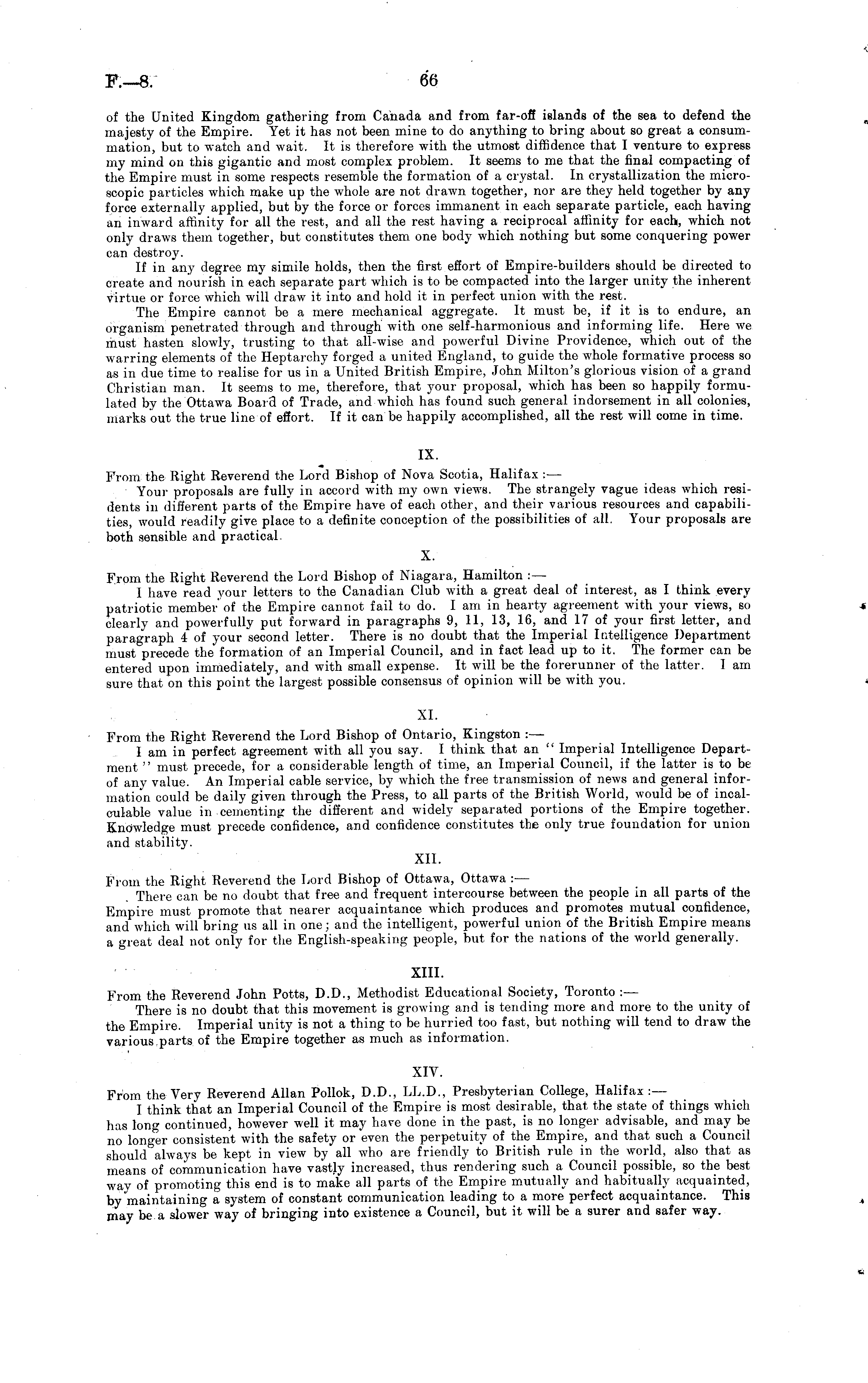 of the United Kingdom gathering from Canada and from far-off islands of the sea to defend the majesty of the Empire. Yet it has not been mine to do anything to bring about so great a consummation, but to watch and wait. It is therefore with the utmost diffidence that I venture to express my mind on this gigantic and most complex problem. It seems to me that the final compacting of the Empire must in some respects resemble the formation of a crystal. In crystallization the microscopic particles which make up the whole are not drawn together, nor are they held together by any force externally applied, but by the force or forces immanent in each separate particle, each having an inward affinity for all the rest, and all the rest having a reciprocal affinity for each, which not only draws them together, but constitutes them one body which nothing but some conquering power can destroy. If in any degree my simile holds, then the first effort of Empire-builders should be directed to create and nourish in each separate part which is to be compacted into the larger unity the inherent virtue or force which will draw it into and hold it in perfect union with the rest. The Empire cannot be a mere mechanical aggregate. It must be, if it is to endure, an organism penetrated through and through with one self-harmonious and informing life. Here we must hasten slowly, trusting to that all-wise and powerful Divine Providence, which out of the warring elements of the Heptarchy forged a united England, to guide the whole formative process so as in due time to realise for us in a United British Empire, John Milton's glorious vision of a grand Christian man. It seems to me, therefore, that your proposal, which has been so happily formulated by the Ottawa Board of Trade, and which has found such general indorsement in all colonies, marks out the true line of effort. If it can be happily accomplished, all the rest will come in time. IX. From the Right Reverend the Lord Bishop of Nova Scotia, Halifax : — Your proposals are fully in accord with my own views. The strangely vague ideas which residents in different parts of the Empire have of each other, and their various resources and capabilities, would readily give place to a definite conception of the possibilities of all. Your proposals are both sensible and practical. X. From the Right Reverend the Lord Bishop of Niagara, Hamilton : — I have read your letters to the Canadian Club with a great deal of interest, as I think every patriotic member of the Empire cannot fail to do. I am in hearty agreement with your views, so clearly and powerfully put forward in paragraphs 9, 11, 13, 16, and 17 of your first letter, and paragraph 4of your second letter. There is no doubt that the Imperial Intelligence Department must precede the formation of an Imperial Council, and in fact lead up to it. The former can be entered upon immediately, and with small expense. It will be the forerunner of the latter. lam sure that on this point the largest possible consensus of opinion will be with you. XL From the Right Reverend the Lord Bishop of Ontario, Kingston : — lam in perfect agreement with all you say. I think that an " Imperial Intelligence Department " must precede, for a considerable length of time, an Imperial Council, if the latter is to be of any value. An Imperial cable service, by which the free transmission of news and general information could be daily given through the Press, to all parts of the British World, would be of incalculable value in cementing the different and widely separated portions of the Empire together. Knowledge must precede confidence, and confidence constitutes the only true foundation for union and stability. XII. From the Right Reverend the Lord Bishop of Ottawa, Ottawa : — There can be no doubt that free and frequent intercourse between the people in all parts of the Empire must promote that nearer acquaintance which produces and promotes mutual confidence, and which will bring us all in one; and the intelligent, powerful union of the British Empire means a great deal not only for the English-speaking people, but for the nations of the world generally. XIII. From the Reverend John Potts, D.D., Methodist Educational Society, Toronto : — There is no doubt that this movement is growing and is tending more and more to the unity of the Empire. Imperial unity is not a thing to be hurried too fast, but nothing will tend to draw the various parts of the Empire together as much as information. XIV. From the Very Reverend Allan Pollok, D.D., LL.D., Presbyterian College, Halifax : — I think that an Imperial Council of the Empire is most desirable, that the state of things which has long continued, however well it may have done in the past, is no longer advisable, and may be no longer consistent with the safety or even the perpetuity of the Empire, and that such a Council should always be kept in view by all who are friendly to British rule in the world, also that as means of communication have vastly increased, thus rendering such a Council possible, so the best wav of promoting this end is to make all parts of the Empire mutually and habitually acquainted, by "maintaining a system of constant communication leading to a more perfect acquaintance. This may be a slower way of bringing into existence a Council, but it will be a surer and safer way.