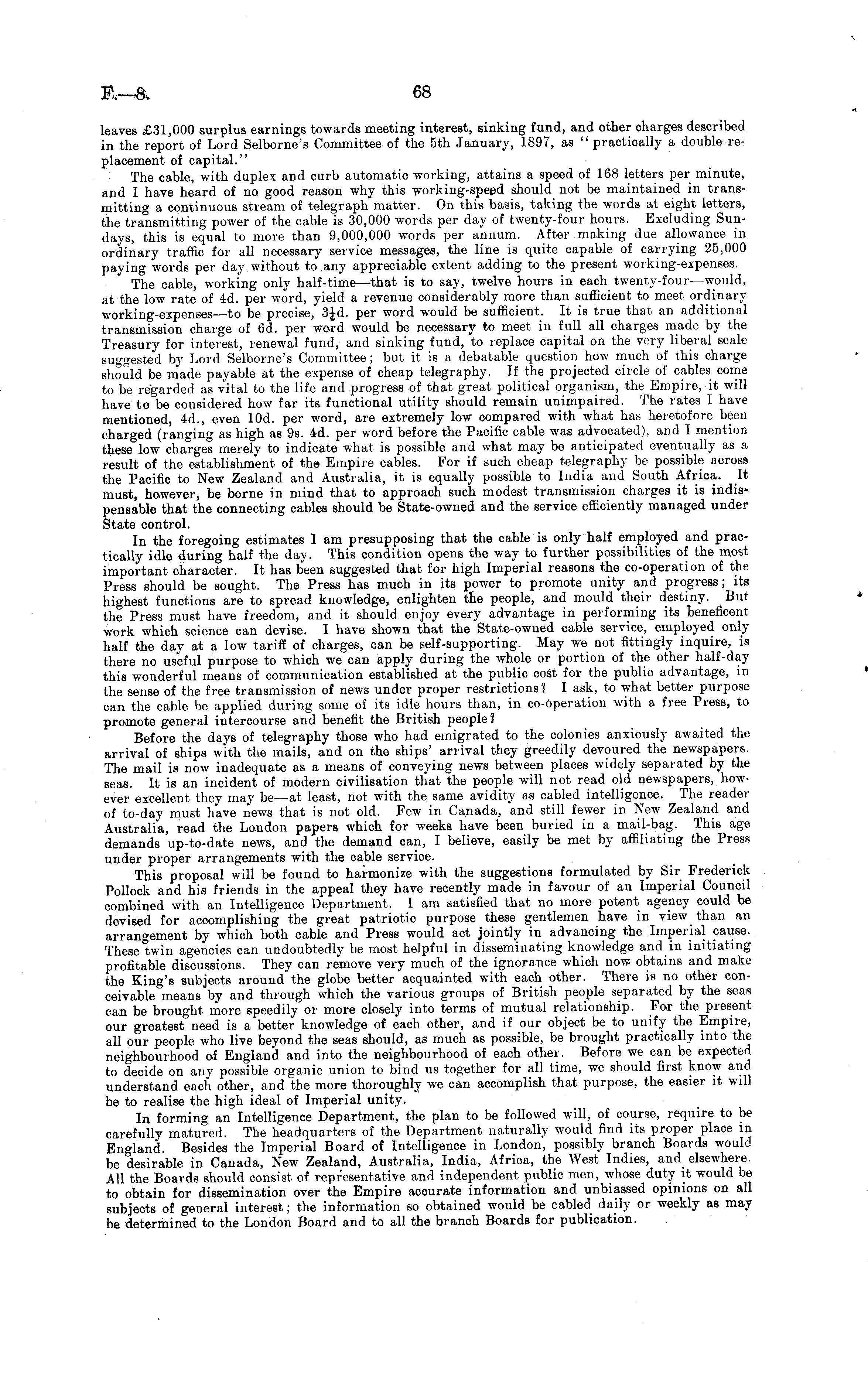 leaves £31,000 surplus earnings towards meeting interest, sinking fund, and other charges described in the report of Lord Selborne's Committee of the sth January, 1897, as " practically a double replacement of capital." The cable, with duplex and curb automatic working, attains a speed of 168 letters per minute, and I have heard of no good reason why this working-speed should not be maintained in transmitting a continuous stream of telegraph matter. On this basis, taking the words at eight letters, the transmitting power of the cable is 30,000 words per day of twenty-four hours. Excluding Sundays, this is equal to more than 9,000,000 words per annum. After making due allowance in ordinary traffic for all necessary service messages, the line is quite capable of carrying 25,000 paying words per day without to any appreciable extent adding to the present working-expenses. The cable, working only half-time —that is to say, twelve hours in each twenty-four—would, at the low rate of 4d. per word, yield a revenue considerably more than sufficient to meet ordinary working-expenses—to be precise, 3Jd. per word would be sufficient. It is true that an additional transmission charge of 6d. per word would be necessary to meet in full all charges made by the Treasury for interest, renewal fund, and sinking fund, to replace capital on the very liberal scale suggested by Lord Selborne's Committee; but it is a debatable question how much of this charge should be made payable at the expense of cheap telegraphy. If the projected circle of cables come to be regarded as vital to the life and progress of that great political organism, it will have to be considered how far its functional utility should remain unimpaired. The rates I have mentioned, 4d., even lOd. per word, are extremely low compared with what has heretofore been charged (ranging as high as 9s. 4d. per word before the Pacific cable was advocated), and I mention these low charges merely to indicate what is possible and what may be anticipated eventually as a result of the establishment of the Empire cables. For if such cheap telegraphy be possible across the Pacific to New Zealand and Australia, it is equally possible to India and South Africa. It must, however, be borne in mind that to approach such modest transmission charges it is indis> pensable that the connecting cables should be State-owned and the service efficiently managed under State control. In the foregoing estimates I am presupposing that the cable is only half employed and practically idle during half the day. This condition opens the way to further possibilities of the most important character. It has been suggested that for high Imperial reasons the co-operation of the Press should be sought. The Press has much in its power to promote unity and progress; its highest functions are to spread knowledge, enlighten the people, and mould their destiny. But the Press must have freedom, and it should enjoy every advantage in performing its beneficent work which science can devise. I have shown that the State-owned cable service, employed only half the day at a low tariff of charges, can be self-supporting. May we not fittingly inquire, is there no useful purpose to which we can apply during the whole or portion of the other half-day this wonderful means of communication established at the public cost for the public advantage, m the sense of the free transmission of news under proper restrictions? I ask, to what better purpose can the cable be applied during some of its idle hours than, in co-Operation with a free Press, to promote general intercourse and benefit the British people? Before the days of telegraphy those who had emigrated to the colonies anxiously awaited the arrival of ships with the mails, and on the ships' arrival they greedily devoured the newspapers. The mail is now inadequate as a means of conveying news between places widely separated by the seas. It is an incident of modern civilisation that the people will not read old newspapers, however excellent they may be—at least, not with the same avidity as cabled intelligence. The reader of to-day must have news that is not old,. Few in Canada, and still fewer in New- Zealand and Australia, read the London papers which for weeks have been buried in a mail-bag. This age demands up-to-date news, and the demand can, I believe, easily be met by affiliating the Press under proper arrangements with the cable service. This proposal will be found to harmonize with the suggestions formulated by Sir Frederick Pollock and his friends in the appeal they have recently made in favour of an Imperial Council combined with an Intelligence Department, I am satisfied that no more potent agency could be devised for accomplishing the great patriotic purpose these gentlemen have in view than an arrangement by which both cable and Press would act jointly in advancing the Imperial cause. These twin agencies can undoubtedly be most helpful in disseminating knowledge and in initiating profitable discussions. They can remove very much of the ignorance which now. obtains and make the King's subjects around the globe better acquainted with each other. There is no other conceivable means by and through which the various groups of British people separated by the seas can be brought more speedily or more closely into terms of mutual relationship. For the present our greatest need is a better knowledge of each other, and if our object be to unify the Empire, all our people who live beyond the seas should, as much as possible, be brought practically into the neighbourhood of England and into the neighbourhood of each other. Before we can be expected to decide on any possible organic union to bind us together for all time, we should first know and understand each other, and the more thoroughly we can accomplish that purpose, the easier it will be to realise the high ideal of Imperial unity. In forming an Intelligence Department, the plan to be foll