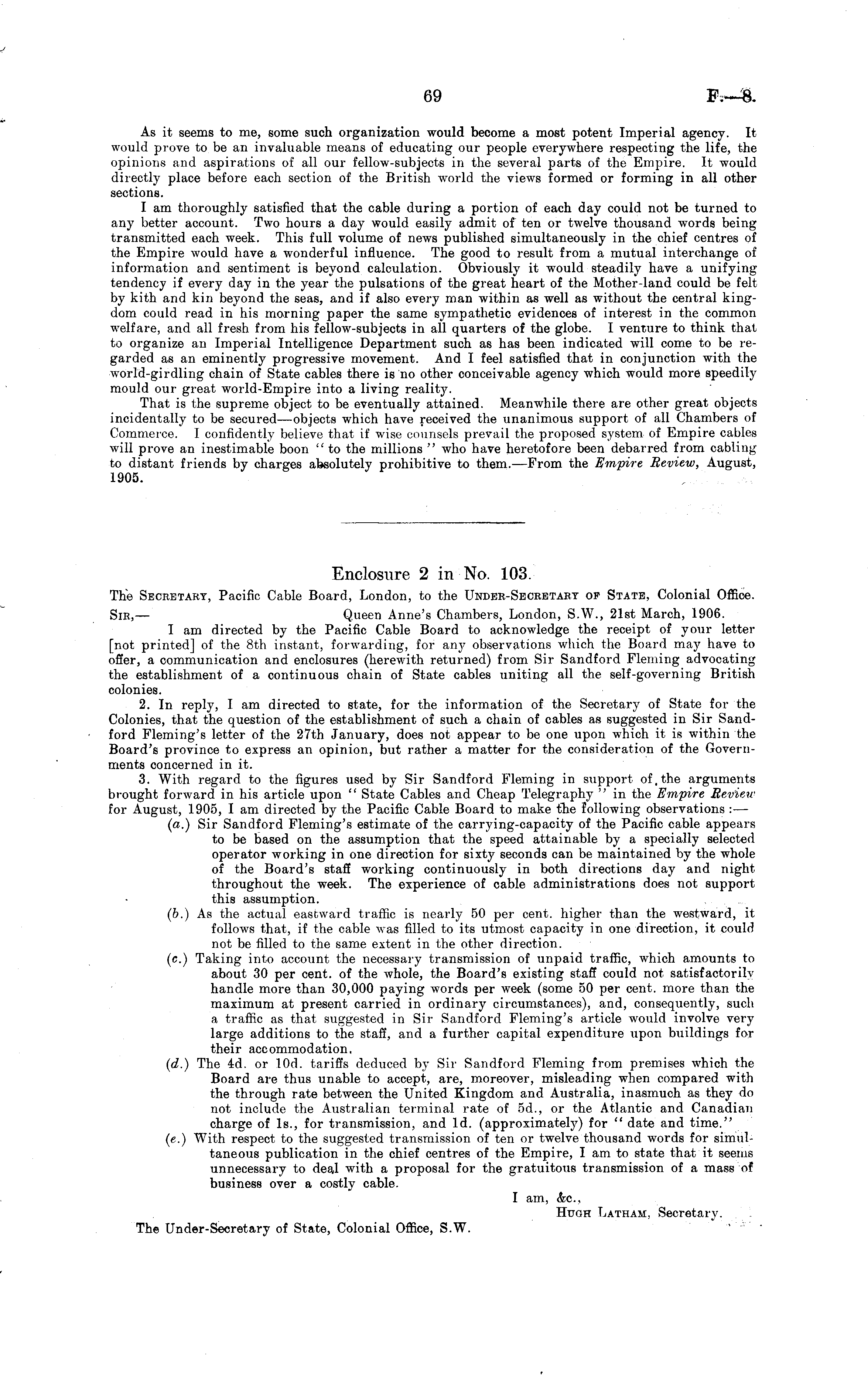 Enclosure 2 in No. 103. The Secretary, Pacific Cable Board, London, to the Under-Secretary of State, Colonial Office. Sir, — Queen Anne's Chambers, London, S.W., 21st March, 1906. I am directed by the Pacific Cable Board to acknowledge the receipt of your letter [not printed] of the Bth instant, forwarding, for any observations which the Board may have to offer, a communication and enclosures (herewith returned) from Sir Sandford Fleming advocating the establishment of a continuous chain of State cables uniting all the self-governing British colonies. 2. In reply, I am directed to state, for the information of the Secretary of State for the Colonies, that the question of the establishment of such a chain of cables as suggested in Sir Sandford Fleming's letter of the 27th January, does not appear to be one upon which it is within the Board's province to express an opinion, but rather a matter for the consideration of the Governments concerned in it. 3. With regard to the figures used by Sir Sandford Fleming in support of. the arguments brought forward in his article upon " State Cables and Cheap Telegraphy " in the Empire Review for August, 1905, I am directed by the Pacific Cable Board to make the following observations : — (a.) Sir Sandford Fleming's estimate of the carrying-capacity of the Pacific cable appears to be based on the assumption that the speed attainable by a specially selected operator working in one direction for sixty seconds can be maintained by the whole of the Board's staff working continuously in both directions day and night throughout the week. The experience of cable administrations does not support this assumption. (b.) As the actual eastward traffic is nearly 50 per cent, higher than the westward, it follows that, if the cable was filled to its utmost capacity in one direction, it could not be filled to the same extent in the other direction. (c.) Taking into account the necessary transmission of unpaid traffic, which amounts to about 30 per cent, of the whole, the Board's existing staff could not satisfactorily handle more than 30,000 paying words per week (some 50 per cent, more than the maximum at present carried in ordinary circumstances), and, consequently, such a traffic as that suggested in Sir Sandford Fleming's article would involve very large additions to the staff, and a further capital expenditure upon buildings for their accommodation. (d.) The 4d. or lOd. tariffs deduced by Sir Sandford Fleming from premises which the Board are thus unable to accept, are, moreover, misleading when compared with the through rate between the United Kingdom and Australia, inasmuch as they do not include the Australian terminal rate of 5d., or the Atlantic and Canadian charge of Is., for transmission, and Id. (approximately) for " date and time." (c.) With respect to the suggested transmission of ten or twelve thousand words for simultaneous publication in the chief centres of the Empire, I am to state that it seems unnecessary to deal with a proposal for the gratuitous transmission of a mass of business over a costly cable. I am, Ac, Hugh IjAtham, Secretary. The Under-Secretary of State, Colonial Office, S.W.