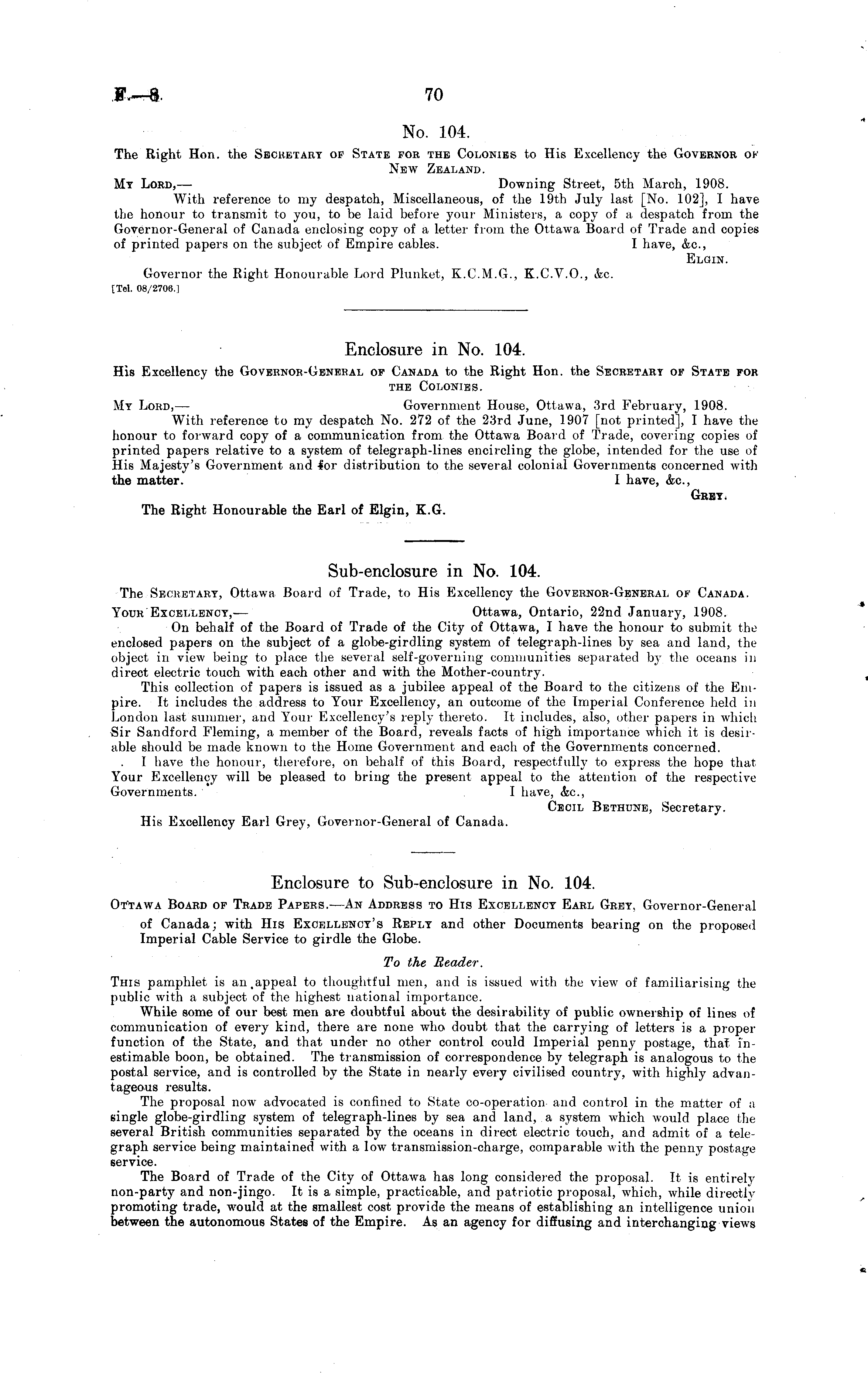 Sub-enclosure in No. 104. The Secretary, Ottawa Board of Trade, to His Excellency the Governor-General of Canada. Your Excellency,— Ottawa, Ontario, 22nd January, 1908. On behalf of the Board of Trade of the City of Ottawa, I have the honour to submit the enclosed papers on the subject of a globe-girdling system of telegraph-lines by sea and land, the object in view being to place the several self-governing communities separated b}- the oceans in direct electric touch with each other and with the Mother-country. This collection of papers is issued as a jubilee appeal of the Board to the citizens of the Empire. It includes the address to Your Excellency, an outcome of the Imperial Conference held in London last summer, and Your Excellency's reply thereto. It includes, also, other papers in which Sir Sandford Fleming, a member of the Board, reveals facts of high importance which it is desirable should be made known to the Home Government and each of the Governments concerned. I have the honour, therefore, on behalf of this Board, respectfully to express the hope that Your Excellency will be pleased to bring the present appeal to the attention of the respective Governments. I have, Ac, Cecil Bethune, Secretary. His Excellency Earl Grey, Governor-General of Canada.