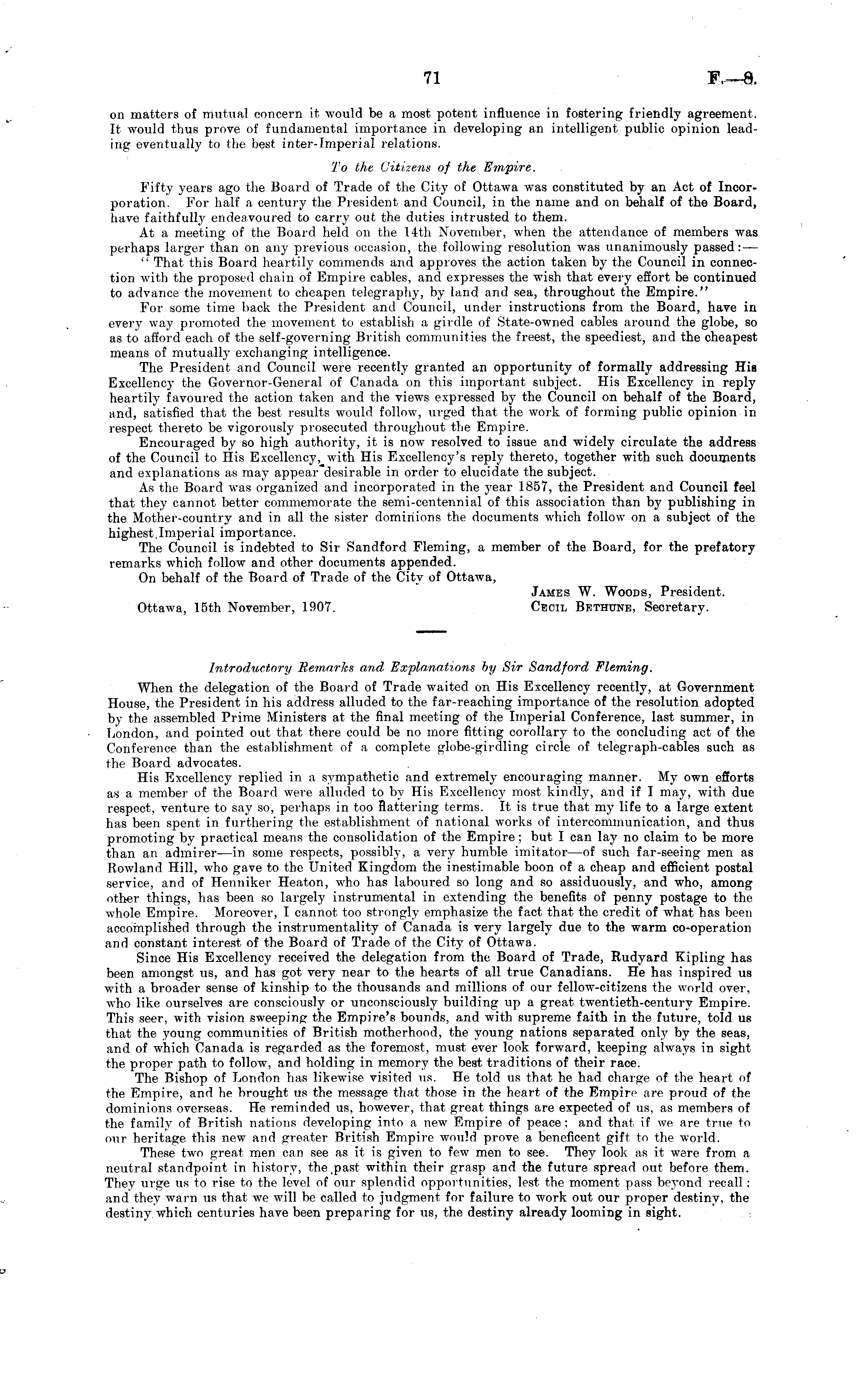on matters of mutual concern it would be a most potent influence in fostering friendly agreement. It would thus prove of fundamental importance in developing an intelligent public opinion leading eventually to the best inter-Imperial relations. To the Citizens of the Empire. Fifty years ago the Board of Trade of the City of Ottawa was constituted by an Act of Incorporation. For half a century the President and Council, in the name and on behalf of the Board, have faithfully endeavoured to carry out the duties intrusted to them. At a meeting of the Board held on the 14th November, when the attendance of members was perhaps larger than on any previous occasion, the following resolution was unanimously passed: — " That this Board heartily commends and approves the action taken by the Council in connection with the proposed chain of Empire cables, and expresses the wish that every effort be continued to advance the movement to cheapen telegraphy, by land and sea, throughout the Empire." For some time back the President and Council, under instructions from the Board, have in every way promoted the movement to establish a girdle of State-owned cables around the globe, so as to afford each of the self-governing British communities the freest, the speediest, and the cheapest means of mutually exchanging intelligence. The President and Council were recently granted an opportunity of formally addressing His Excellency the Governor-General of Canada on this important subject. His Excellency in reply heartily favoured the action taken and the views expressed by the Council on behalf of the Board, and, satisfied that the best results would follow-, urged that the work of forming public opinion in respect thereto be vigorously prosecuted throughout the Empire. Encouraged by so high authority, it is now resolved to issue and widely circulate the address of the Council to His Excellency, with His Excellency's reply thereto, together with such documents and explanations as may appear desirable in order to elucidate the subject. As the Board was organized and incorporated in the year 1857, the President and Council feel that they cannot better commemorate the semi-centennial of this association than by publishing in the Mother-country and in all the sister dominions the documents which follow on a subject of the highest.lmperial importance. The Council is indebted to Sir Sandford Fleming, a member of the Board, for the prefatory remarks which follow and other documents appended. On behalf of the Board of Trade of the City of Ottawa, James W. Woods, President. Ottawa, 15th November, 1907. Cecil Bethune, Secretary.