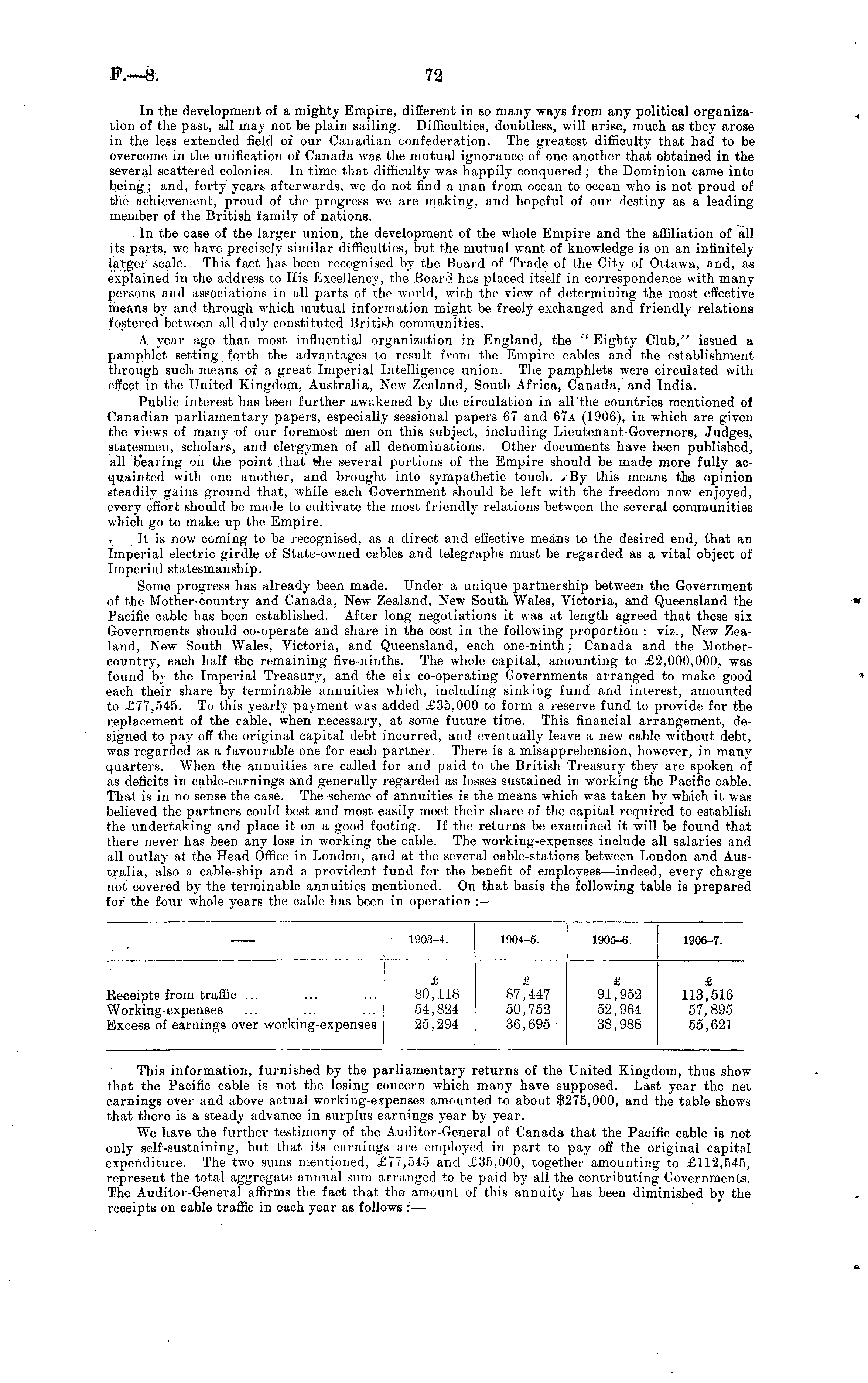 In the development of a mighty Empire, different in so many ways from any political organization of the past, all may not be plain sailing. Difficulties, doubtless, will arise, much as they arose in the less extended field of our Canadian confederation. The greatest difficulty that had to be overcome in the unification, of Canada was the mutual ignorance of one another that obtained in the several scattered colonies. In time that difficulty was happily conquered; the Dominion came into being; and, forty years afterwards, we do not find a man from ocean to ocean who is not proud of the achievement, proud of the progress we are making, and hopeful of our destiny as a leading member of the British family of nations. In the case of the larger union, the development of the wdiole Empire and the affiliation of all its parts, we have precisely similar difficulties, but the mutual want of knowledge is on an infinitely larger scale. This fact has been recognised by the Board of Trade of the City of Ottawa, and, as explained in the address to His Excellency, the Board has placed itself in correspondence with many persons and associations in all parts of the world, with the view of determining the most effective means by and through which mutual information might be freely exchanged and friendly relations fostered between all duly constituted British communities. A year ago that most influential organization in England, the " Eighty Club," issued a pamphlet setting forth the advantages to result from the Empire cables and the establishment through such means of a great Imperial Intelligence union. The pamphlets were circulated with effect in the United Kingdom, Australia, New Zealand, South Africa, Canada, and India. Public interest has been further awakened by the circulation in all'the countries mentioned of Canadian parliamentary papers, especially sessional papers 67 and 67a (1906), in which are given the views of many of our foremost men on this subject, including Lieutenant-Governors, Judges, statesmen, scholars, and clergymen of all denominations. Other documents have been published, all bearing on the point that fche several portions of the Empire should be made more fully acquainted with one another, and brought into sympathetic touch. /-By this means the opinion steadily gains ground that, while each Government should be left with the freedom now enjoyed, every effort should be made to cultivate the most friendly relations between the several communities which go to make up the Empire. It is now coming to be recognised, as a direct and effective means to the desired end, that an Imperial electric girdle of State-owned cables and telegraphs must be regarded as a vital object of Imperial statesmanship. Some progress has already been made. Under a unique partnership between the Government of the Mother-country and Canada, New Zealand, New South Wales, Victoria, and Queensland the Pacific cable has been established. After long negotiations it was at length agreed that these six Governments should co-operate and share in the cost in the following proportion : viz., New Zealand, New South Wales, Victoria, and Queensland, each one-ninth; Canada and the Mothercountry, each half the remaining five-ninths. The whole capital, amounting to £2,000,000, was found by the Imperial Treasury, and the six co-operating Governments arranged to make good each their share by terminable annuities which, including sinking fund and interest, amounted to £77,545. To this yearly payment was added £35,000 to form a reserve fund to provide for the replacement of the cable, when necessary, at some future time. This financial arrangement, designed to pay off the original capital debt incurred, and eventually leave a new cable without debt, was regarded as a favourable one for each partner. There is a misapprehension, however, in many quarters. When the annuities are called for and paid to the British Treasury they are spoken of as deficits in cable-earnings and generally regarded as losses sustained in working the Pacific cable. That is in no sense the case. The scheme of annuities is the means which was taken by which it was believed the partners could best and most easily meet their share of the capital required to establish the undertaking and place it on a good footing. If the returns be examined it will be found that there never has been any loss in working the cable. The working-expenses include all salaries and all outlay at the Head Office in London, and at the several cable-stations betw-een London and Australia, also a cable-ship and a provident fund for the benefit of employees—indeed, every charge not covered by the terminable annuities mentioned. On that basis the following table is prepared for the four whole years the cable has been in operation : —