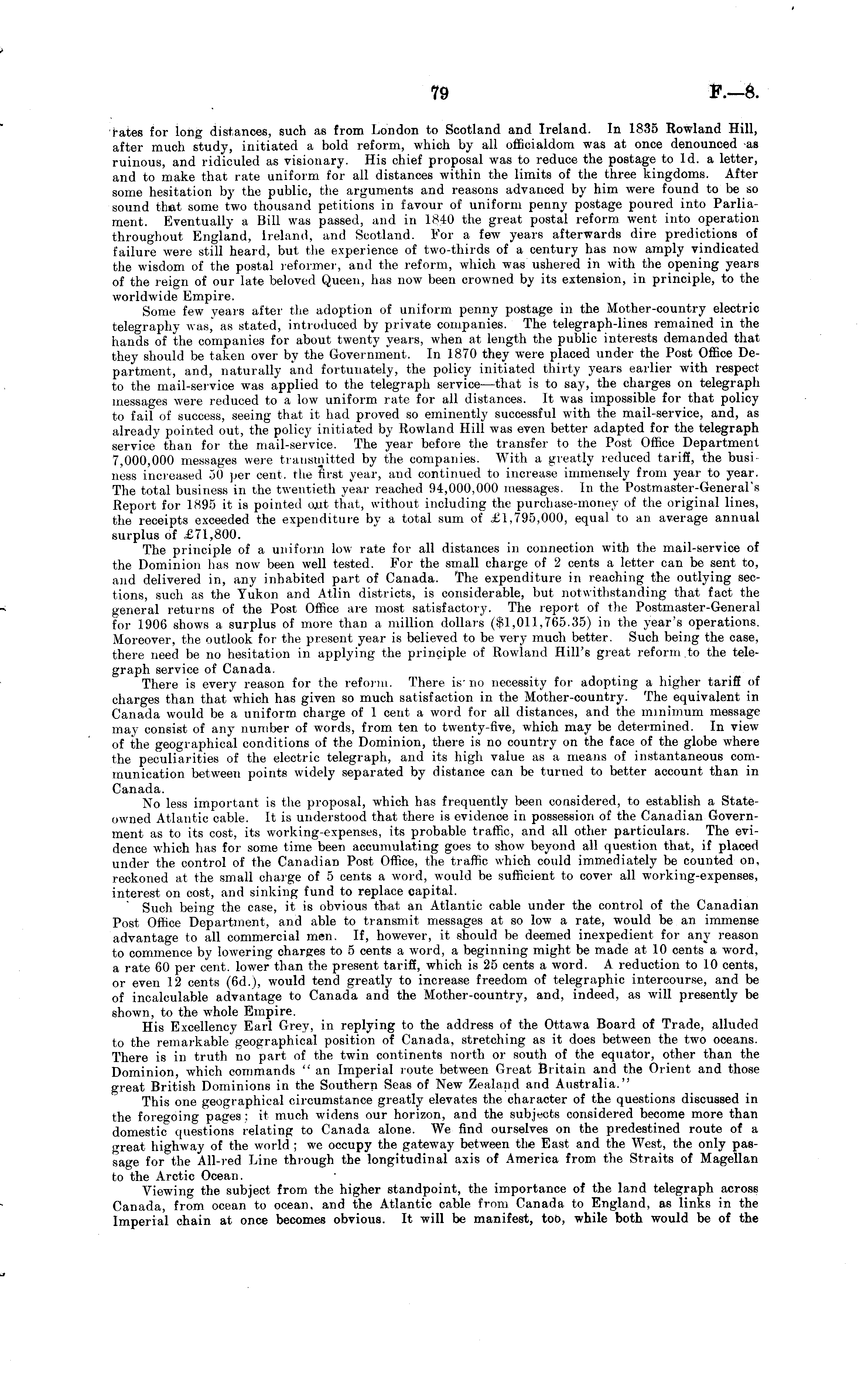 rates for long distances, such as from London to Scotland and Ireland. In 1835 Rowland Hill, after much study, initiated a bold reform, which by all officialdom was at once denounced as ruinous, and ridiculed as visionary. His chief proposal was to reduce the postage to Id. a letter, and to make that rate uniform for all distances within the limits of the three kingdoms. After some hesitation by the public, the arguments and reasons advanced by him were found to be so sound that some two thousand petitions in favour of uniform penny postage poured into Parliament. Eventually a Bill was passed, and in 1840 the great postal reform went into operation throughout England, Ireland, and Scotland. For a few years afterwards dire predictions of failure were still heard, but the experience of two-thirds of a century has now amply vindicated the wisdom of the postal reformer, and the reform, which was ushered in with the opening years of the reign of our late beloved Queen, has now been crowned by its extension, in principle, to the worldwide Empire. Some few years after the adoption of uniform penny postage in the Mother-country electric telegraphy wasj as stated, introduced by private companies. The telegraph-lines remained in the hands of the companies for about twenty years, when at length the public interests demanded that they should be taken over by the Government. In 1870 they were placed under the Post Office Department, and, naturally and fortunately, the policy initiated thirty years earlier with respect to the mail-service was applied to the telegraph service—that is to say, the charges on telegraph messages were reduced to a low uniform rate for all distances. It was impossible for that policy to fail of success, seeing that it had proved so eminently successful with the mail-service, and, as already pointed out, the policy initiated by Rowland Hill was even better adapted for the telegraph service" than for the mail-service. The year before the transfer to the Post Office Department 7,000,000 messages were transmitted by the companies. With a greatly reduced tariff, the business increased 50 per cent, the first year, and continued to increase immensely from year to year. The total business in the twentieth year reached 94,000,000 messages. In the Postmaster-General's Report for 1895 it is pointed out that, without including the purchase-money of the original lines, the receipts exceeded the expenditure by a total sum of £1,795,000, equal to an average annual suiplus of £71,800. The principle of a uniform low rate for all distances in connection with the mail-service of the Dominion has now been well tested. For the small charge of 2 cents a letter can be sent to, and delivered in, any inhabited part of Canada. The expenditure in reaching the outlying sections, such as the Yukon and Atlin districts, is considerable, but notwithstanding that fact the general returns of the Post Office are most satisfactory. The report of the Postmaster-General for 1906 shows a surplus of more than a million dollars ($1,011,765.35) in the year's operations. .Moreover, the outlook for the present year is believed to be very much better. Such being the case, there need be no hesitation in applying the principle of Rowland Hill's great reform to the telegraph service of Canada. There is every reason for the reform. There is'no necessity for adopting a higher tariff of charges than that which has given so much satisfaction in the Mother-country. The equivalent in Canada would be a uniform charge of 1 cent a word for all distances, and the minimum message may consist of any number of words, from ten to twenty-five, which may be determined. In view of the geographical conditions of the Dominion, there is no country on the face of the globe where the peculiarities of the electric telegraph, and its high value as a means of instantaneous communication between points widely separated by distance can be turned to better account than in Canada. No less important is the proposal, which has frequently been considered, to establish a Stateowned Atlantic cable. It is understood that there is evidence in possession of the Canadian Government as to its cost, its working-expenses, its probable traffic, and all other particulars. The evidence which has for some time been accumulating goes to show beyond all question that, if placed under the control of the Canadian Post Office, the traffic which could immediately be counted on, reckoned at the small charge of 5 cents a word, would be sufficient to cover all working-expenses, interest on cost, and sinking fund to replace capital. Such being the case, it is obvious that an Atlantic cable under the control of the Canadian Post Office Department, and able to transmit messages at so low a rate, would be an immense advantage to all commercial men. If, however, it should be deemed inexpedient for any reason to commence by lowering charges to 5 cents a word, a beginning might be made at 10 cents a word, a rate 60 per cent, lower than the present tariff, which is 25 cents a word. A reduction to 10 cents, or even 12 cents (6d.), would tend greatly to increase freedom of telegraphic intercourse, and be of incalculable advantage to Canada and the Mother-country, and, indeed, as will presently be shown, to the whole Empire. His Excellency Earl Grey, in replying to the address of the Ottawa Board of Trade, alluded to the remarkable geographical position of Canada, stretching as it does between the two oceans. There is in truth no part of the twin continents north or south of the equator, other than the Dominion, which commands " an Imperial route between Great Britain and the Orient and those great British Dominions in the Southern Seas of New Zealand and Australia." This one geographical circumstance greatly elevates the character of the questions discussed in the foregoing pages : it much widens our horizon, and the subjects considered become more than domestic questions relating