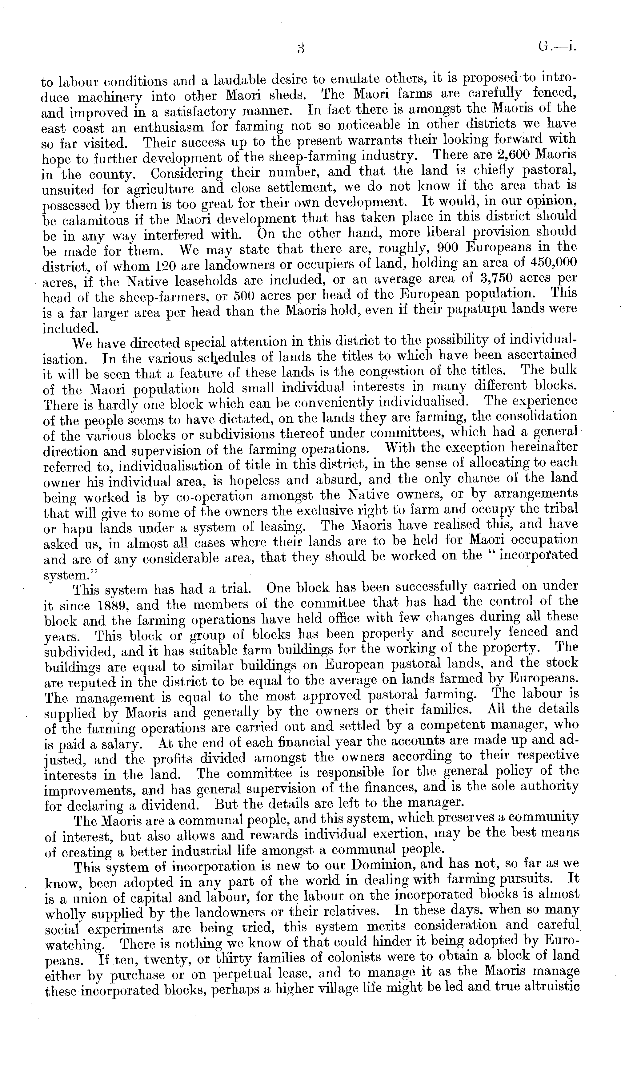 to labour conditions and a laudable desire to emulate others, it is proposed to introduce machinery into other Maori sheds. The Maori farms are carefully fenced, and improved in a satisfactory manner. In fact there is amongst the Maoris of the east coast an enthusiasm for farming not so noticeable in other districts we have so far visited. Their success up to the present warrants their looking forward with hope to further development of the sheep-farming industry. There are 2,600 Maoris in the county. Considering their number, and that the land is chiefly pastoral, unsuited for agriculture and close settlement, we do not know if the area that is possessed by them is too great for their own development. It would, in our opinion, be calamitous if the Maori development that has taken place in this district should be in any way interfered with. On the other hand, more liberal provision should be made for them. We may state that there are, roughly, 900 Europeans in the district, of whom 120 are landowners or occupiers of land, holding an area of 450,000 acres, if the Native leaseholds are included, or an average area of 3,750 acres per head of the sheep-farmers, or 500 acres per head of the European population. This is a far larger area per head than the Maoris hold, even if their papatupu lands were included. We have directed special attention in this district to the possibility of mdividualisation. In the various schedules of lands the titles to which have been ascertained it will be seen that a feature of these lands is the congestion of the titles. The bulk of the Maori population hold small individual interests in many different blocks. There is hardly one block which can be conveniently individualised. The experience of the people seems to have dictated, on the lands they are farming, the consolidation of the various blocks or subdivisions thereof under committees, which had a general direction and supervision of the farming operations. With the exception hereinafter referred to, individualisation of title in this district, in the sense of allocating to each owner his individual area, is hopeless and absurd, and the only chance of the land being worked is by co-operation amongst the Native owners, or by arrangements that will give to some of the owners the exclusive right to farm and occupy the tribal or hapu lands under a system of leasing. The Maoris have realised this, and have asked us, in almost all cases where their lands are to be held for Maori occupation and are of any considerable area, that they should be worked on the " incorporated system." This system has had a trial. One block has been successfully carried on under it since 1889, and the members of the committee that has had the control of the block and the farming operations have held office with few changes during all these years. This block or group of blocks has been properly and securely fenced and subdivided, and it has suitable farm buildings for the working of the property. The buildings are equal to similar buildings on European pastoral lands, and the stock are reputed in the district to be equal to the average on lands farmed by Europeans. The management is equal to the most approved pastoral farming. The labour is supplied by Maoris and generally by the owners or their families. All the details of the farming operations are carried out and settled by a competent manager, who is paid a salary. At the end of each financial year the accounts are made up and adjusted, and the profits divided amongst the owners according to their respective interests in the land. The committee is responsible for the general policy of the improvements, and has general supervision of the finances, and is the sole authority for declaring a dividend. But the details are left to the manager. The Maoris are a communal people, and this system, which preserves a community of interest, but also allows and rewards individual exertion, may be the best means of creating a better industrial life amongst a communal people. This system of incorporation is new to our Dominion, and has not, so far as we know, been adopted in any part of the world in dealing with farming pursuits. It is a union of capital and labour, for the labour on the incorporated blocks is almost wholly supplied by the landowners or their relatives. In these days, when so many social" experiments are being tried, this system merits consideration and careful watching. There is nothing we know of that could hinder it being adopted by Europeans. If ten, twenty, or thirty families of colonists were to obtain a block of land either by purchase or on perpetual lease, and to manage it as the Maoris manage these incorporated blocks, perhaps a higher village life might be led and true altruistic