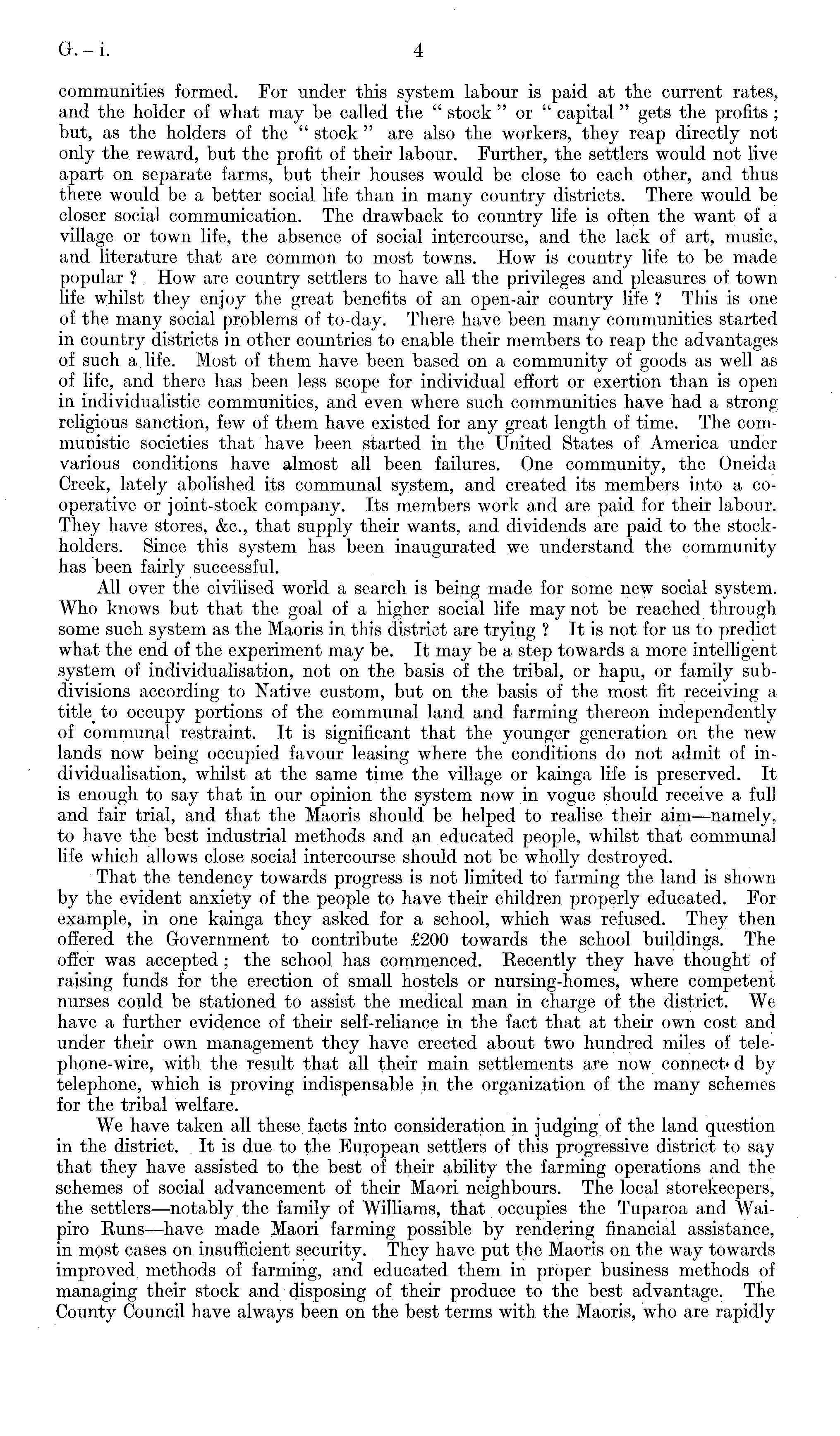 communities formed. For under this system labour is paid at the current rates, and the holder of what may be called the " stock " or " capital " gets the profits ; but, as the holders of the " stock " are also the workers, they reap directly not only the reward, but the profit of their labour. Further, the settlers would not live apart on separate farms, but their houses would be close to each other, and thus there would be a better social life than in many country districts. There would be closer social communication. The drawback to country life is often the want of a village or town life, the absence of social intercourse, and the lack of art, music, and literature that are common to most towns. How is country life to be made popular ? How are country settlers to have all the privileges and pleasures of town life whilst they enjoy the great benefits of an open-air country life ? This is one of the many social problems of to-day. There have been many communities started in country districts in other countries to enable their members to reap the advantages of such a life. Most of them have been based on a community of goods as well as of life, and there has been less scope for individual effort or exertion than is open in individualistic communities, and even where such communities have had a strong religious sanction, few of them have existed for any great length of time. The communistic societies that have been started in the United States of America under various conditions have almost all been failures. One community, the Oneida Creek, lately abolished its communal system, and created its members into a cooperative or joint-stock company. Its members work and are paid for their labour. They have stores, &c, that supply their wants, and dividends are paid to the stockholders. Since this system has been inaugurated we understand the community has been fairly successful. All over the civilised world a search is being made for some new social system. Who knows but that the goal of a higher social life may not be reached through some such system as the Maoris in this district are trying ? It is not for us to predict what the end of the experiment may be. It may be a step towards a more intelligent system of individualisation, not on the basis of the tribal, or hapu, or family subdivisions according to Native custom, but on the basis of the most fit receiving a title to occupy portions of the communal land and farming thereon independently of communal restraint. It is significant that the younger generation on the new lands now being occupied favour leasing where the conditions do not admit of individualisation, whilst at the same time the village or kainga life is preserved. It is enough to say that in our opinion the system now in vogue should receive a full and fair trial, and that the Maoris should be helped to realise their aim—namely, to have the best industrial methods and an educated people, whilst that communal life which allows close social intercourse should not be wholly destroyed. That the tendency towards progress is not limited to farming the land is shown by the evident anxiety of the people to have their children properly educated. For example, in one kainga they asked for a school, which was refused. They then offered the Government to contribute £200 towards the school buildings. The offer was accepted ; the school has commenced. Recently they have thought of raising funds for the erection of small hostels or nursing-homes, where competent nurses could be stationed to assist the medical man in charge of the district. We have a further evidence of their self-reliance in the fact that at their own cost and under their own management they have erected about two hundred miles of tele-phone-wire, with the result that all their main settlements are now connect' d by telephone, which is proving indispensable in the organization of the many schemes for the tribal welfare. We have taken all these facts into consideration in judging of the land question in the district. It is due to the European settlers of this progressive district to say that they have assisted to the best of their ability the farming operations and the schemes of social advancement of their Maori neighbours. The local storekeepers, the settlers—notably the family of Williams, that occupies the Tuparoa and Waipiro Runs—have made Maori farming possible by rendering financial assistance, in most cases on insufficient security. They have put the Maoris on the way towards improved methods of farming, and educated them in proper business methods of managing their stock and disposing of their produce to the best advantage. The County Council have always been on the best terms with the Maoris, who are rapidly