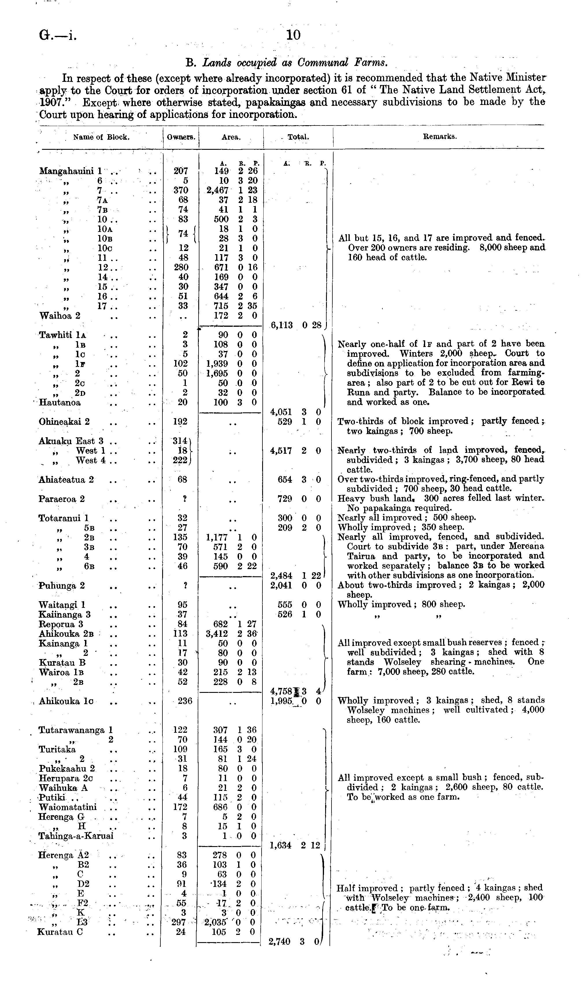 B. Lands occupied as Communed Farms. In respect of these (except where already incorporated) it is recommended that the Native Minister apply to the Court for orders of incorporation under section 61 of " The Native Land Settlement Act, 1907." Except where otherwise stated, papakaingas and necessary subdivisions to be made by the Court upon hearing of applications for incorporation.