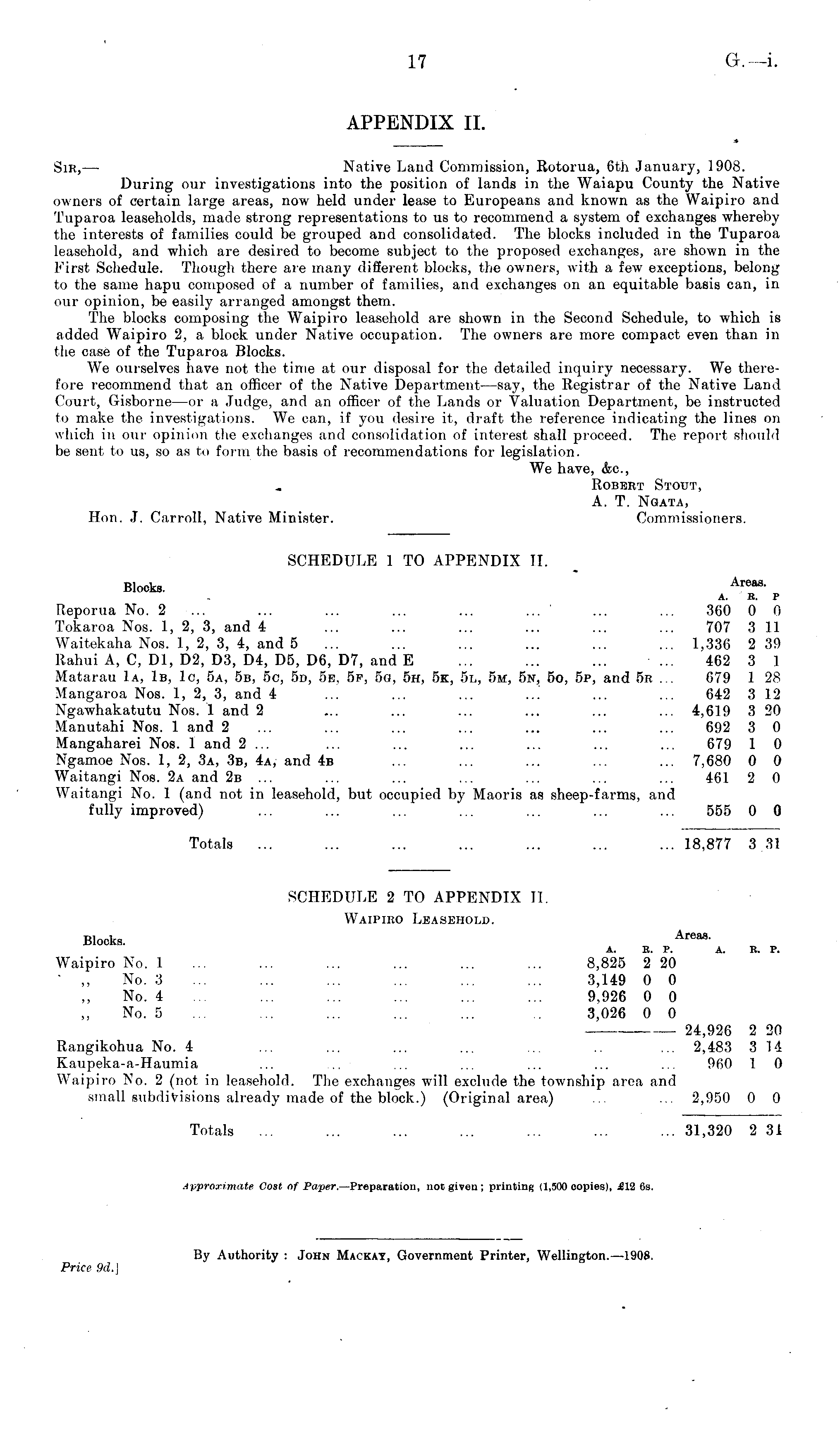 APPENDIX 11. Sir, — Native Land Commission, Rotorua, 6th January, 1908. During our investigations into the position of lands in the Waiapu County the Native owners of certain large areas, now held under lease to Europeans and known as the Waipiro and Tuparoa leaseholds, made strong representations to us to recommend a system of exchanges whereby the interests of families could be grouped and consolidated. The blocks included in the Tuparoa leasehold, and which are desired to become subject to the proposed exchanges, are shown in the First Schedule. Though there are many different blocks, the owners, with a few exceptions, belong to the same hapu composed of a number of families, and exchanges on an equitable basis can, in our opinion, be easily arranged amongst them. The blocks composing the Waipiro leasehold are shown in the Second Schedule, to which is added Waipiro 2, a block under Native occupation. The owners are more compact even than in the case of the Tuparoa Blocks. We ourselves have not the time at our disposal for the detailed inquiry necessary. We therefore recommend that an officer of the Native Department —say, the Registrar of the Native Land Court, Gisborne —or a Judge, and an officer of the Lands or Valuation Department, be instructed to make the investigations. We can, if you desire it, draft the reference indicating the lines on which in our opinion the exchanges and consolidation of interest shall proceed. The report should be sent to us, so as to form the basis of recommendations for legislation. We have, &c, Robert Stout, A. T. Ngata, Hon. J. Carroll, Native Minister. Commissioners. SCHEDULE 1 TO APPENDIX TT. Blocks. Areas - A. R. P Reporua No. 2 ... ... ... ... ... ... ... ... 3GO 0 0 Tokaroa Nos. 1, 2, 3, and 4 ... ... ... ... ... ... 707 3 11 Waitekaha Nos. 1, 2, 3, 4, and 5 ... ... ... ... ... ... 1,336 239 Rahui A, C, Dl, D 2, D 3, D 4, D 5, D 6, D 7, and E ... ... ... ... 462 3 1 Matarau lα, Iβ, lc, sa, sb, sc, sd, sb, sp, sg, sh, sk, 51, sm, sn, 50, sp, and 5r ... 679 1 28 Mangaroa Nos. 1, 2, 3, and 4 ... ... ... ... ... ... 642 3 12 Ngawhakatutu Nos. 1 and 2 ... ... ... ... ... ... 4,619 3 20 Manutahi Nos. 1 and 2 ... ... ... ... ... ... ... 692 3 0 Mangaharei Nos. 1 and 2 ... ... ... ... ... ... ... 679 1 0 Ngamoe Nos. 1, 2, 3a, 3b, 4a, and 4b ... ... ... ... ... 7,680 0 0 Waitangi Nos. 2a and 2b ... ... ... ... ... ... ... 461 2 0 Waitangi No. 1 (and not in leasehold, but occupied by Maoris as sheep-farms, and fully improved) ... ... ... ... ... ... ... 555 0 0 Totals ... ... ... ... ... ... ... 18,877 331 SCHEDULE 2 TO APPENDIX 11. Waipiro Leasehold. Blocks. AreM - A. E. P. A. R. P. Waipiro No. 1 ... ... ... ... ... ... 8,825 2 20 ' „ No. 3 ... ... ... ... ... ... 3,149 0 0 No. 4 ... ... ... ... ... ... 9,926 0 0 No. 5 ... ... ... ... ... . 3,026 0 0 24,926 2 20 Rangikohua No. 4 ... ... ... ... ... .. ... 2,483 3 14 Kaupeka-a-Haumia ... .. ... ... ... ... ... fl(iO 1 0 Waipiro No. 2 (not in leasehold. The exchanges will exclude the township area and small subdivisions already made of the block.) (Original area) ... ... 2,950 0 0 Totals ... ... ... ... ... ... ... 31,320 231 Approximate Cost of Paper. —Preparation, not given ; printing (1,500 copies), £12 6s. By Authority : John Mackat, Government Printer, Wellington.—l9oB. Price 9d.\