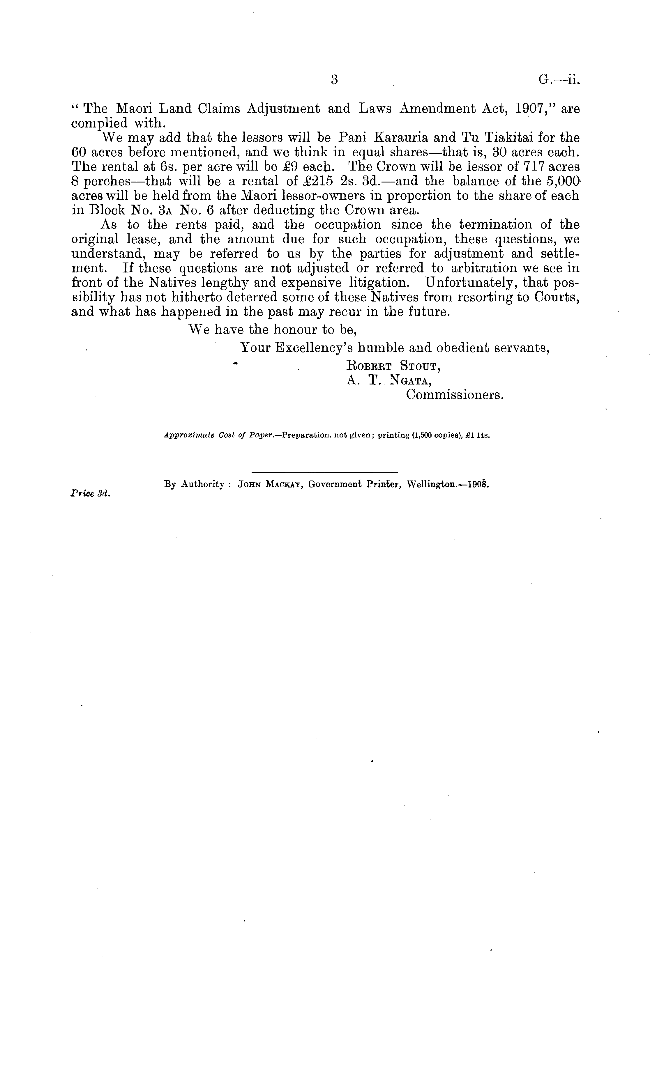 " The Maori Land Claims Adjustment and Laws Amendment Act, 1907," are complied with. We may add that the lessors will be Pani Karauria and Tv Tiakitai for the 60 acres before mentioned, and we think in equal shares—that is, 30 acres each. The rental at 6s. per acre will be £9 each. The Crown will be lessor of 717 acres 8 perches—that will be a rental of ,£215 2s. 3d.—and the balance of the 5,000 acres will be held from the Maori lessor-owners in proportion to the share of each in Block No. 3a No. 6 after deducting the Crown area. As to the rents paid, and the occupation since the termination of the original lease, and the amount due for such occupation, these questions, we understand, may be referred to us by the parties for adjustment and settlement. If these questions are not adjusted or referred to arbitration we see in front of the Natives lengthy and expensive litigation. Unfortunately, that possibility has not hitherto deterred some of these Natives from resorting to Courts, and what has happened in the past may recur in the future. We have the honour to be, Your Excellency's humble and obedient servants, Bobert Stout, A. T. Ngata, Commissioners. Approximate Cost of Paper.— Preparation, not given; printing (1,500 copies), £1 14s. By Authority : John Mackay, Government Printer, Wellington. — l9oß. Price 3d.