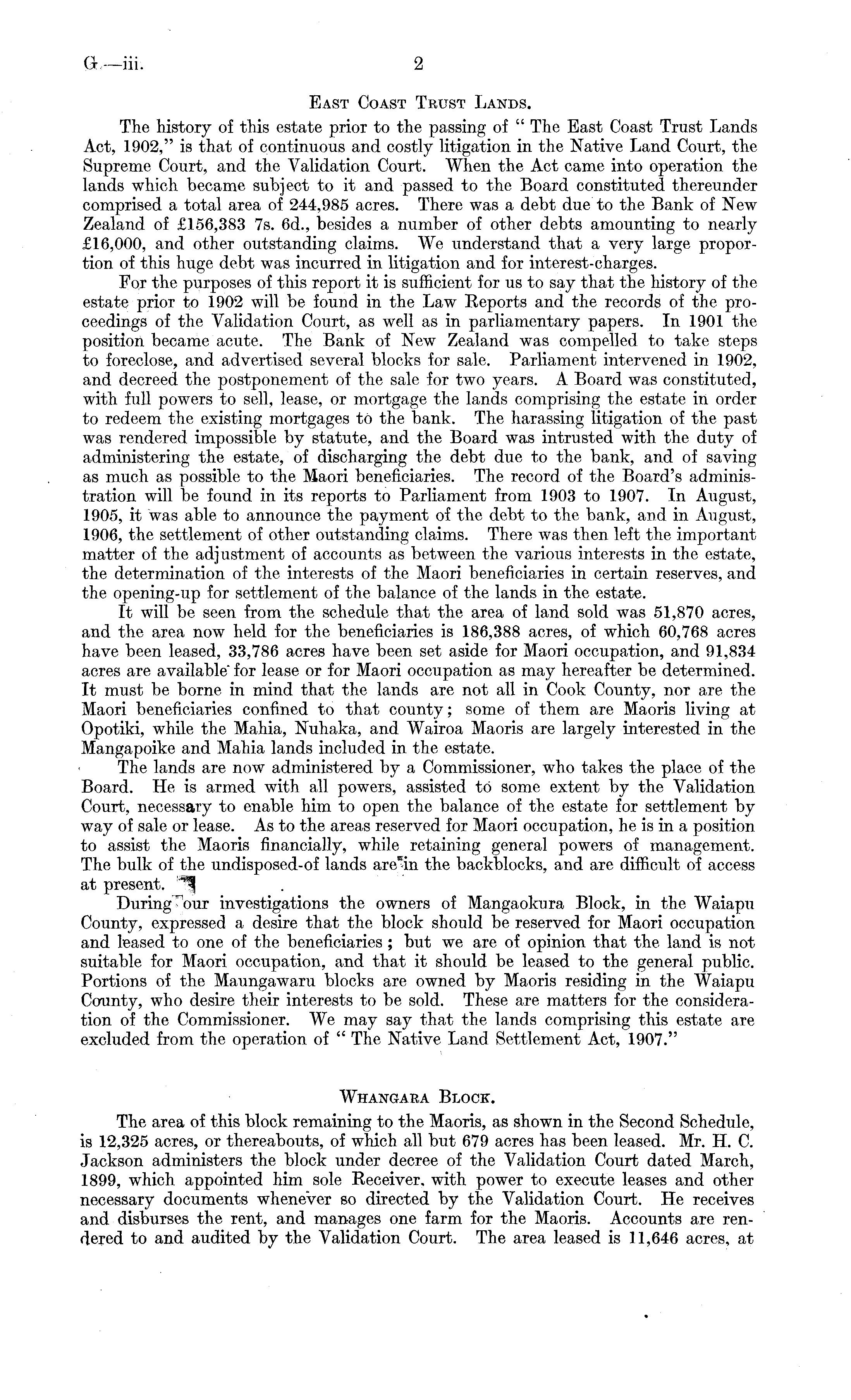 East Coast Trust Lands. The history of this estate prior to the passing of " The East Coast Trust Lands Act, 1902," is that of continuous and costly litigation in the Native Land Court, the Supreme Court, and the Validation Court. When the Act came into operation the lands which became subject to it and passed to the Board constituted thereunder comprised a total area of 244,985 acres. There was a debt due to the Bank of New Zealand of £156,383 7s. 6d., besides a number of other debts amounting to nearly £16,000, and other outstanding claims. We understand that a very large proportion of this huge debt was incurred in litigation and for interest-charges. For the purposes of this report it is sufficient for us to say that the history of the estate prior to 1902 will be found in the Law Reports and the records of the proceedings of the Validation Court, as well as in parliamentary papers. In 1901 the position became acute. The Bank of New Zealand was compelled to take steps to foreclose, and advertised several blocks for sale. Parliament intervened in 1902, and decreed the postponement of the sale for two years. A Board was constituted, with full powers to sell, lease, or mortgage the lands comprising the estate in order to redeem the existing mortgages to the bank. The harassing litigation of the past was rendered impossible by statute, and the Board was intrusted with the duty of administering the estate, of discharging the debt due to the bank, and of saving as much as possible to the Maori beneficiaries. The record of the Board's administration will be found in its reports to Parliament from 1903 to 1907. In August, 1905, it "was able to announce the payment of the debt to the bank, and in August, 1906, the settlement of other outstanding claims. There was then left the important matter of the adjustment of accounts as between the various interests in the estate, the determination of the interests of the Maori beneficiaries in certain reserves, and the opening-up for settlement of the balance of the lands in the estate. It will be seen from the schedule that the area of land sold was 51,870 acres, and the area now held for the beneficiaries is 186,388 acres, of which 60,768 acres have been leased, 33,786 acres have been set aside for Maori occupation, and 91,834 acres are available'for lease or for Maori occupation as may hereafter be determined. It must be borne in mind that the lands are not all in Cook County, nor are the Maori beneficiaries confined to that county; some of them are Maoris living at Opotiki, while the Mahia, Nuhaka, and Wairoa Maoris are largely interested in the Mangapoike and Mahia lands included in the estate. The lands are now administered by a Commissioner, who takes the place of the Board. He is armed with all powers, assisted to some extent by the Validation Court, necessary to enable him to open the balance of the estate for settlement by way of sale or lease. As to the areas reserved for Maori occupation, he is in a position to assist the Maoris financially, while retaining general powers of management. The bulk of the undisposed-of lands are'in the backblocks, and are difficult of access at present. '"*% During'our investigations the owners of Mangaokura Block, in the Waiapu County, expressed a desire that the block should be reserved for Maori occupation and leased to one of the beneficiaries ; but we are of opinion that the land is not suitable for Maori occupation, and that it should be leased to the general public. Portions of the Maungawaru blocks are owned by Maoris residing in the Waiapu County, who desire their interests to be sold. These are matters for the consideration of the Commissioner. We may say that the lands comprising this estate are excluded from the operation of " The Native Land Settlement Act, 1907." Whangara Block. The area of this block remaining to the Maoris, as shown in the Second Schedule, is 12,325 acres, or thereabouts, of which all but 679 acres has been leased. Mr. H. C. Jackson administers the block under decree of the Validation Court dated March, 1899, which appointed him sole Receiver, with power to execute leases and other necessary documents whenever so directed by the Validation Court. He receives and disburses the rent, and manages one farm for the Maoris. Accounts are rendered to and audited by the Validation Court. The area leased is 11,646 acres, at