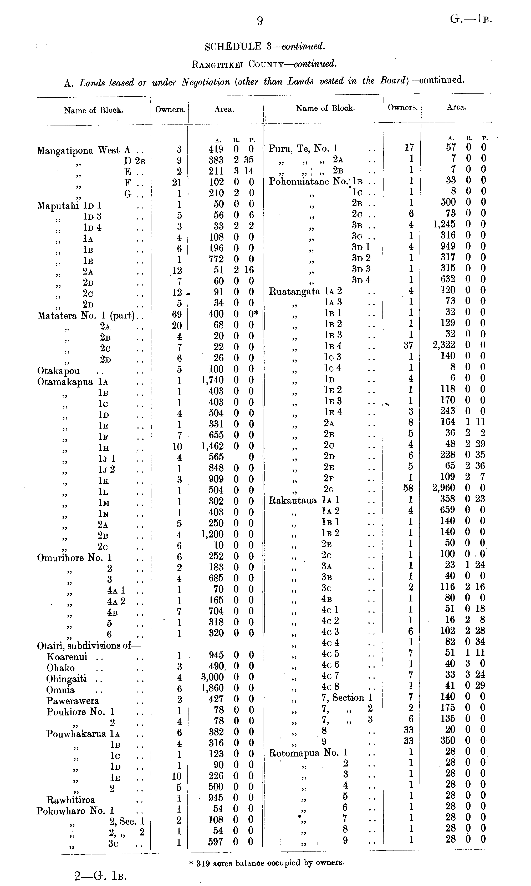Name of Block. Owners. Area. Puru, Te, No. 1 ,, ., » 2a )i » ! » 2b Pohonuiatane No." Iβ .. 'lc .. 2b .. 2c .. 3b .. 3c .. 3d1 3d 2 3d 3 3d 4 Ruatangata Iα 2 Iα 3 Iβ 1 Iβ 2 Iβ 3 Iβ 4 Ic3 lc 4 Id 1e2 1e3 1e 4 2a 2b 2c 2d ,i 2e 2f 2g Rakautaua Iα 1 Iα 2 Iβ 1 Iβ 2 2b 2c „ 3a 3b 3c 4b 4c 1 4c 2 4c 3 4c 4 4c 5 4c6 4c 7 4c 8 „ 7, Section 1 7, „ 2 7, „ 3 ,,8 ,,9 Rotomapua No. 1 2 .. 3 .. 4 .. 5 .. 6 .. 7 .. 8 .. 9 .. N 17 1 1 1 1 1 6 4 1 4 1 1 1 4 1 1 1 1 37 1 1 4 1 1 3 8 5 4 6 5 1 58 1 4 1 1 1 1 1 1 2 1 1 1 6 1 7 1 7 1 7 2 6 33 33 1 1 1 1 1 1 1 1 1 A. B. P. 57 0 0 7 0 0 7 0 0 33 0 0 8 0 0 500 0 0 73 0 0 1,245 0 0 316 0 0 949 0 0 317 0 0 315 0 0 632 0 0 120 0 0 73 0 0 32 0 0 129 0 0 32 0 0 2,322 0 0 140 0 0 8 0 0 6 0 0 118 0 0 170 0 0 243 0 0 164 1 11 36 2 2 48 2 29 228 0 35 65 2 36 109 2 7 2,960 0 0 358 0 23 659 0 0 140 0 0 140 0 0 50 0 0 100 0.0 23 1 24 40 0 0 116 2 16 80 0 0 51 0 18 16 2 8 102 2 28 82 0 34 51 1 11 40 3 0 33 3 24 41 0 29 140 0 0 175 0 0 135 0 0 20 0 0 350 0 0 28 0 0 28 0 0 28 0 0 28 0 0 28 0 0 28 0 0 28 0 0 28 0 0 28 0 0 oocupied by owners.